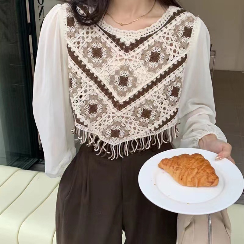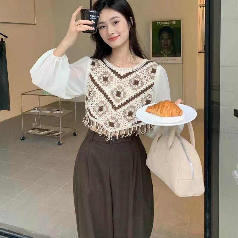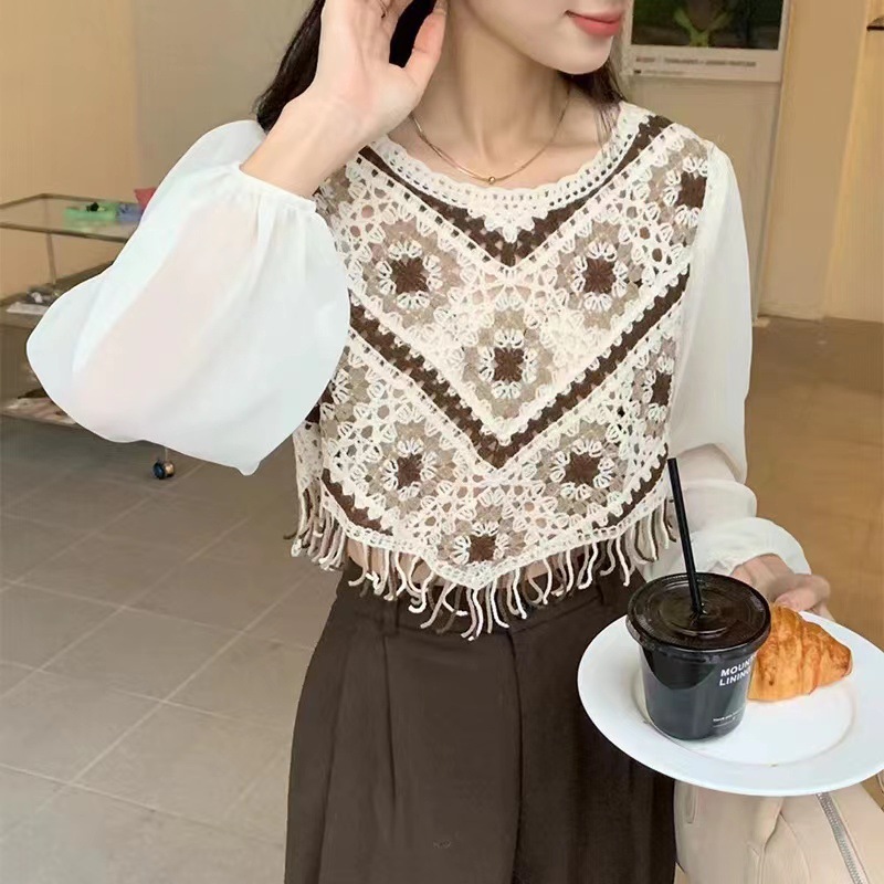 衬衫女春夏蕾丝钩花镂空长袖雪纺衬衣2024网红爆款短款别致小上衣