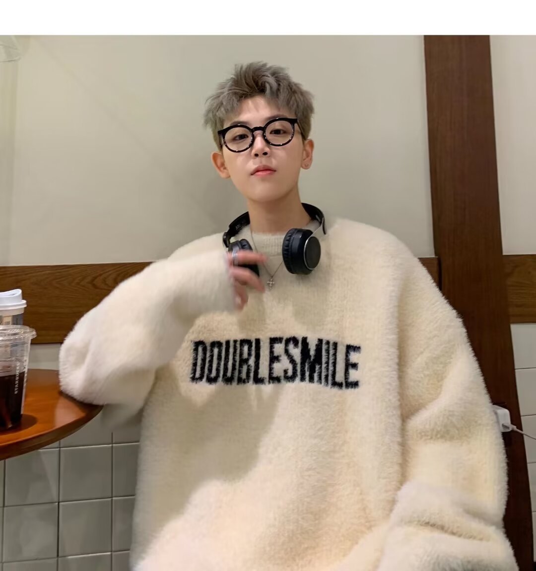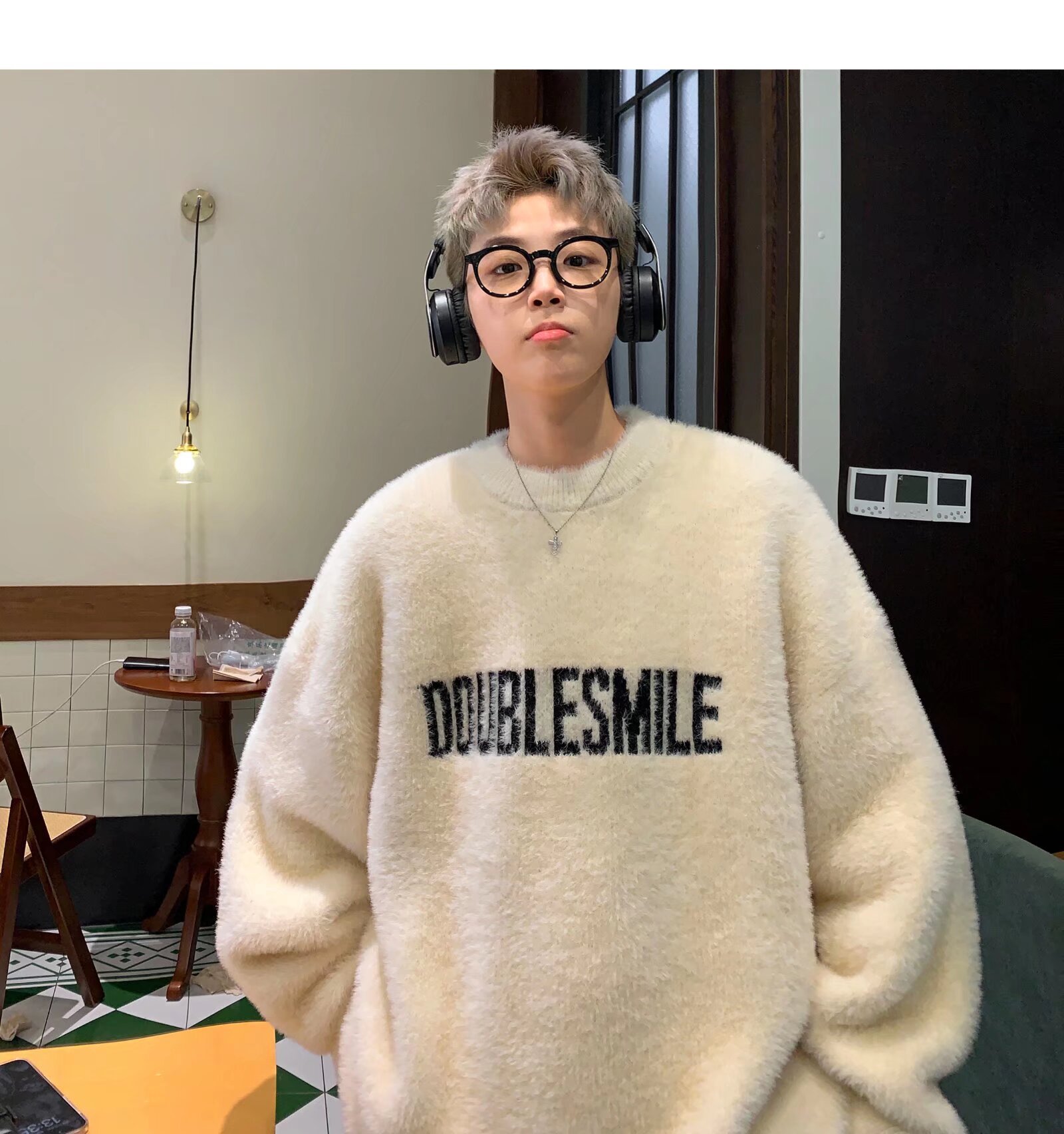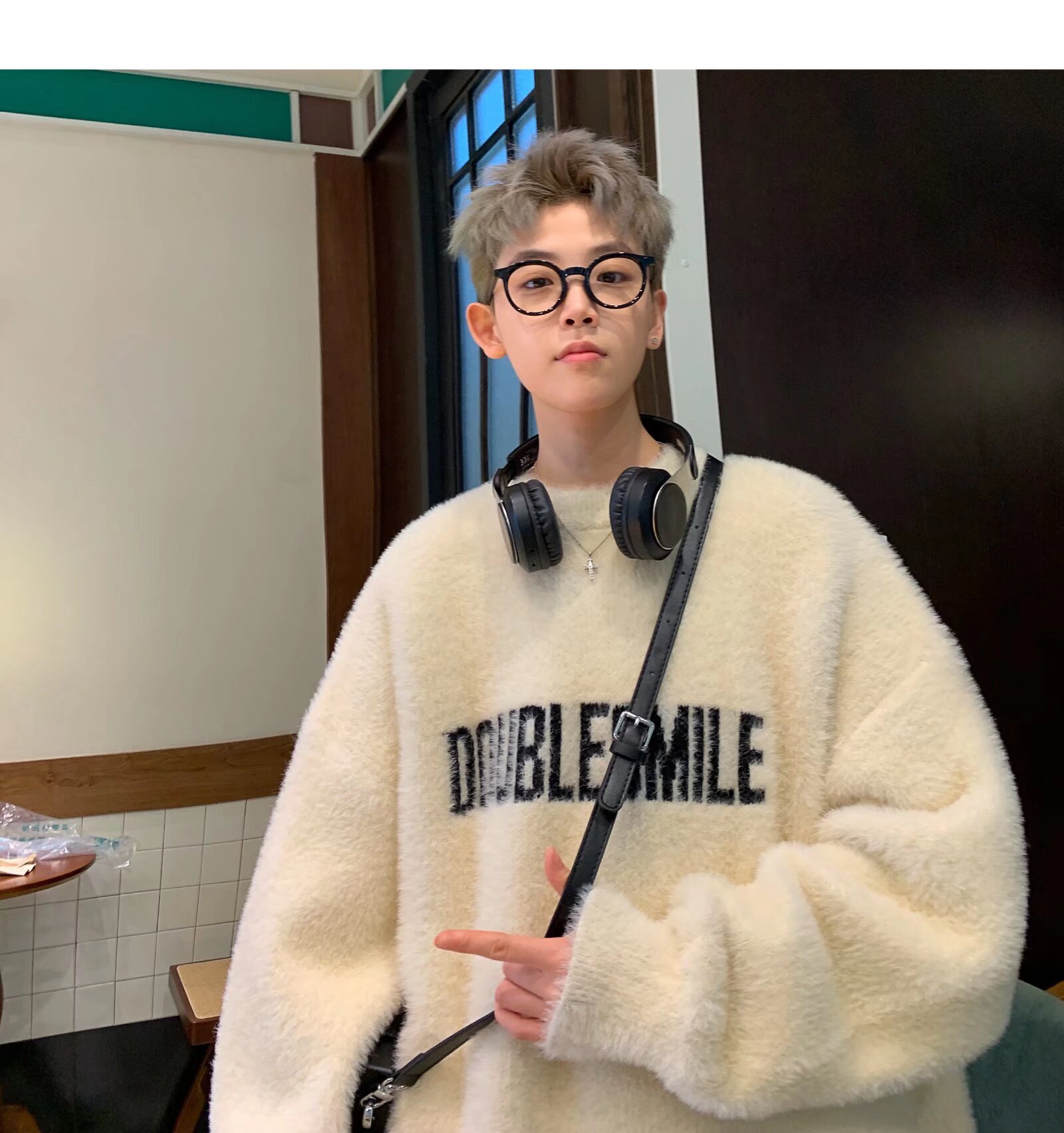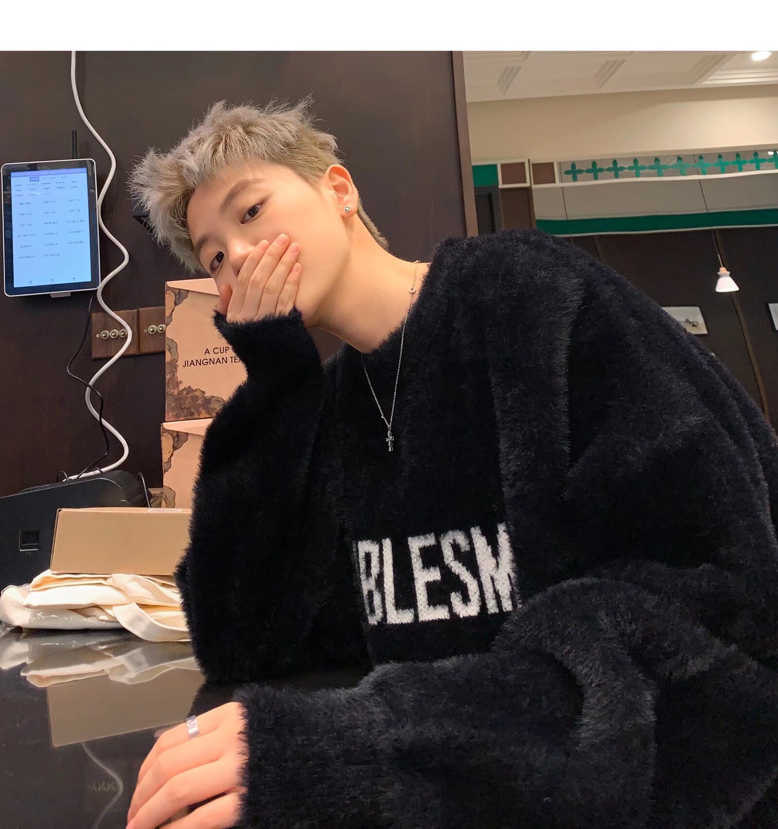 가을과 겨울 새로운 모피 트렌디 브랜드 편지 스웨터 남자 커플 스웨터 재킷 라운드 넥 와이드 패션 학생 따뜻한