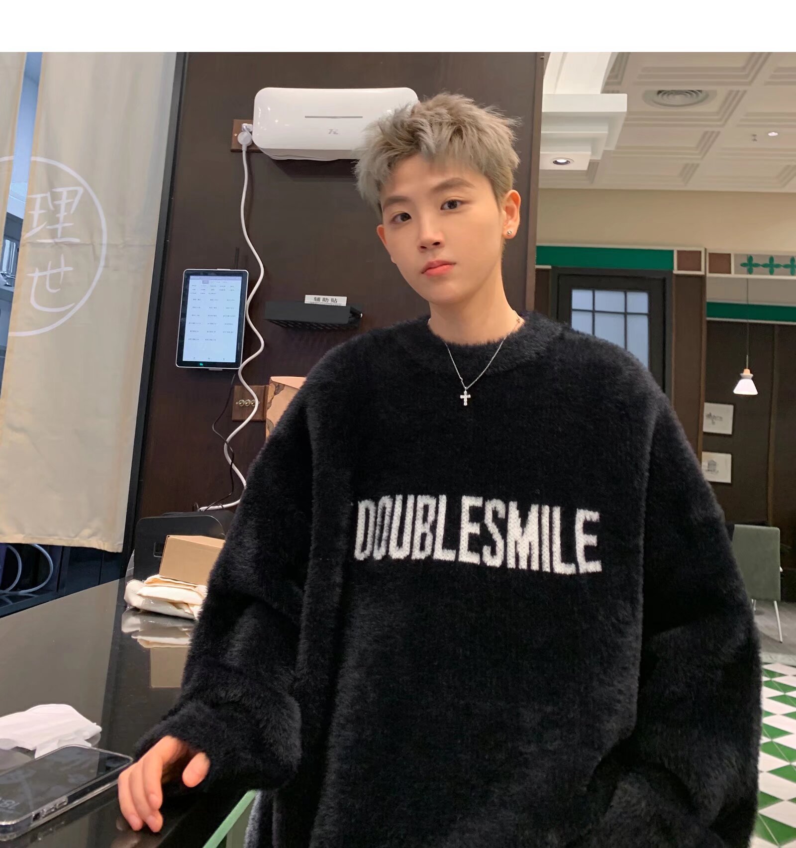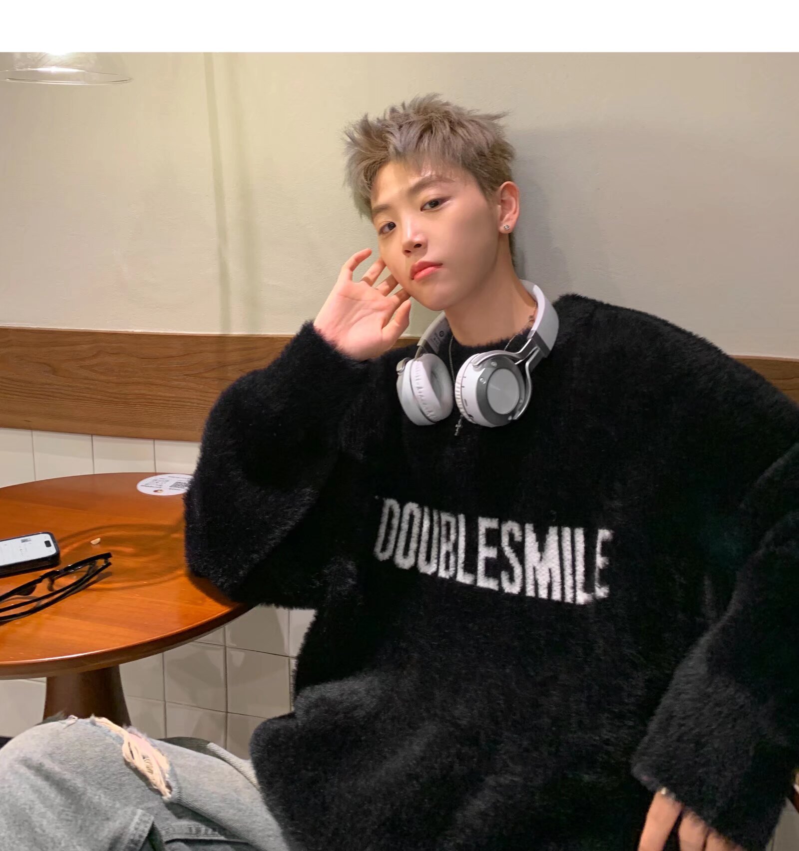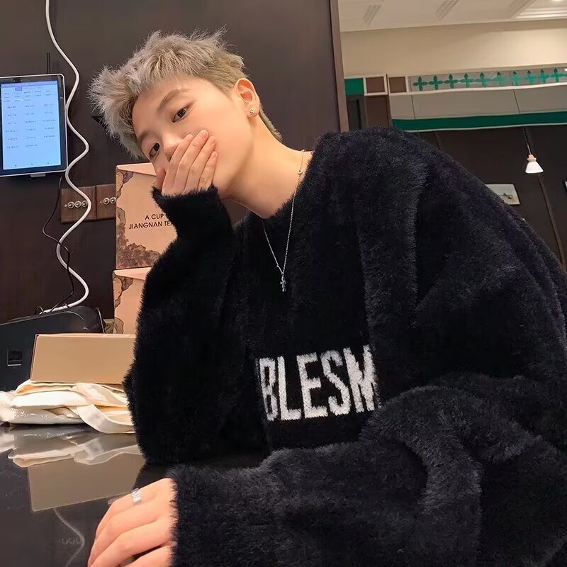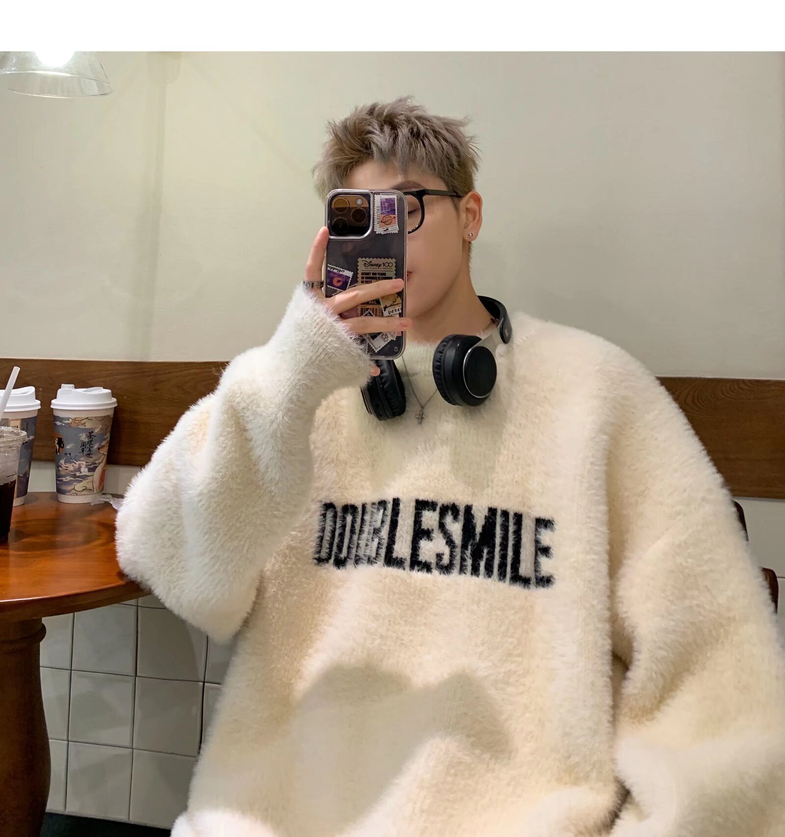 가을과 겨울 새로운 모피 트렌디 브랜드 편지 스웨터 남자 커플 스웨터 재킷 라운드 넥 와이드 패션 학생 따뜻한