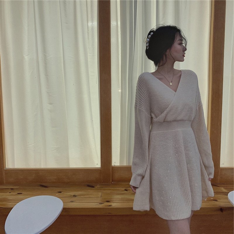 프랑스 스타일 가벼운 고급 고급 여신 V-넥 스웨터 원피스 가을과 겨울 여성의 새로운 중간 길이 니트 원피스스토어 가기