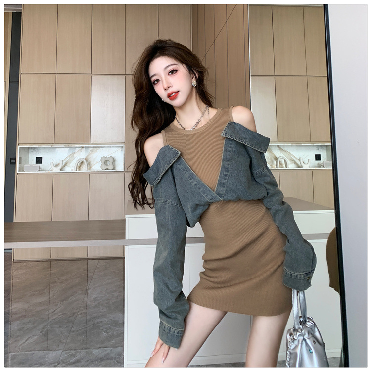 데님 바느질 어깨 긴팔 원피스 여성의 가을 2023 새로운 홍콩 스타일의 타이트 허리 슬리밍 엉덩이 니트 스커트스토어 가기