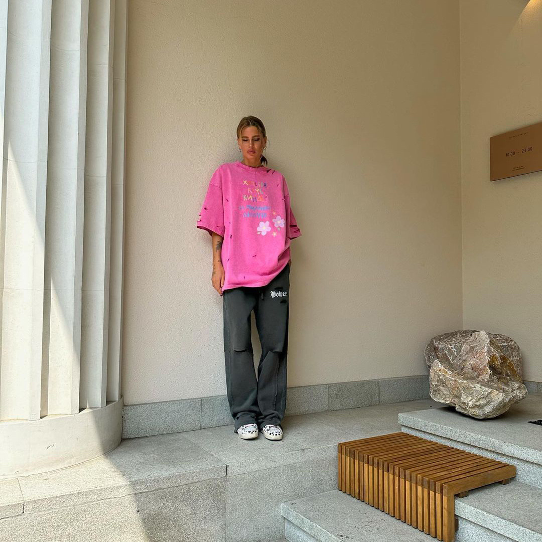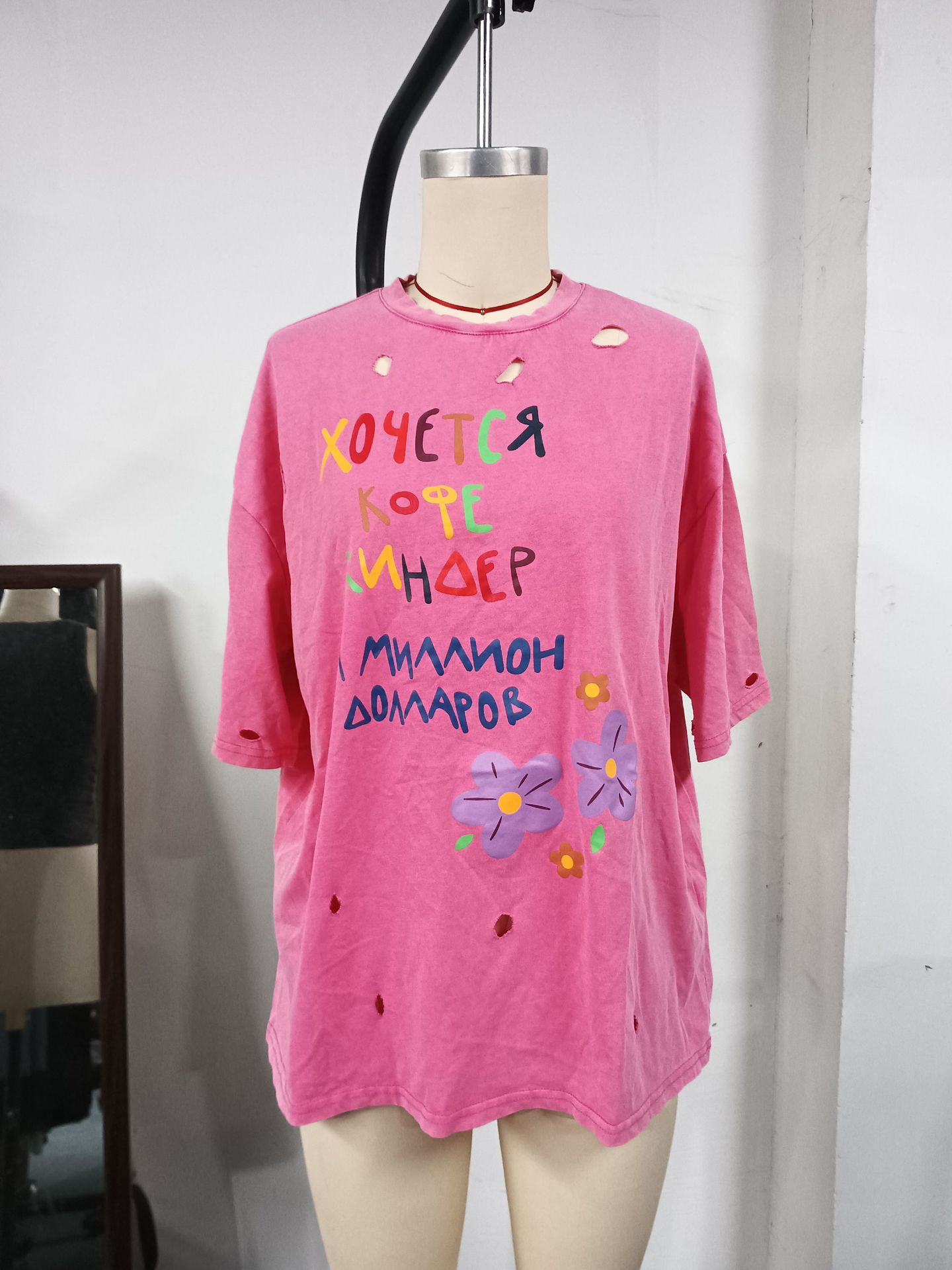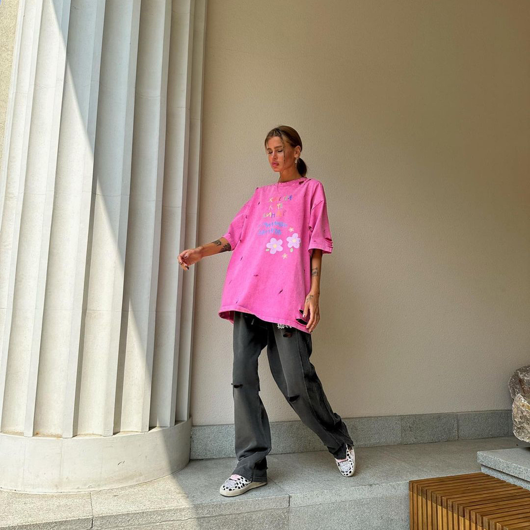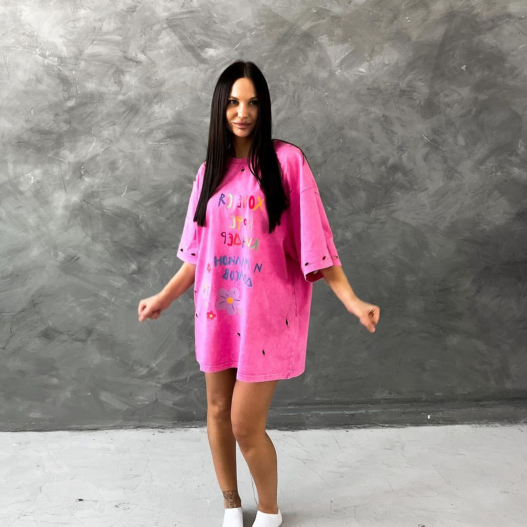 깨진 스타일의 핑크 편지 인쇄 디자인 짧은 소매 느슨한 게으른 거리 촬영 트렌디 한 캐주얼 중간 길이 티셔츠스토어 가기