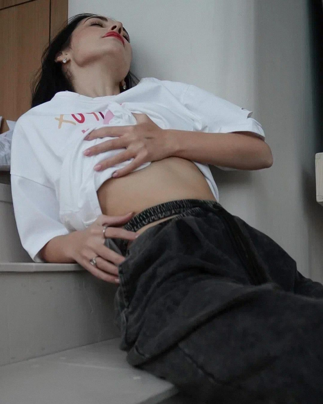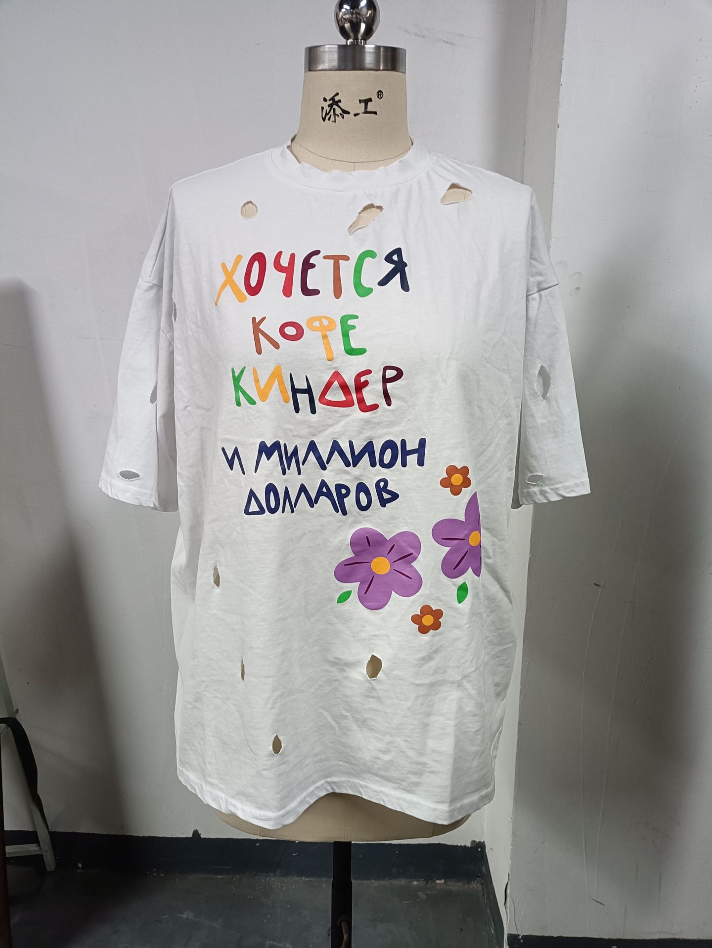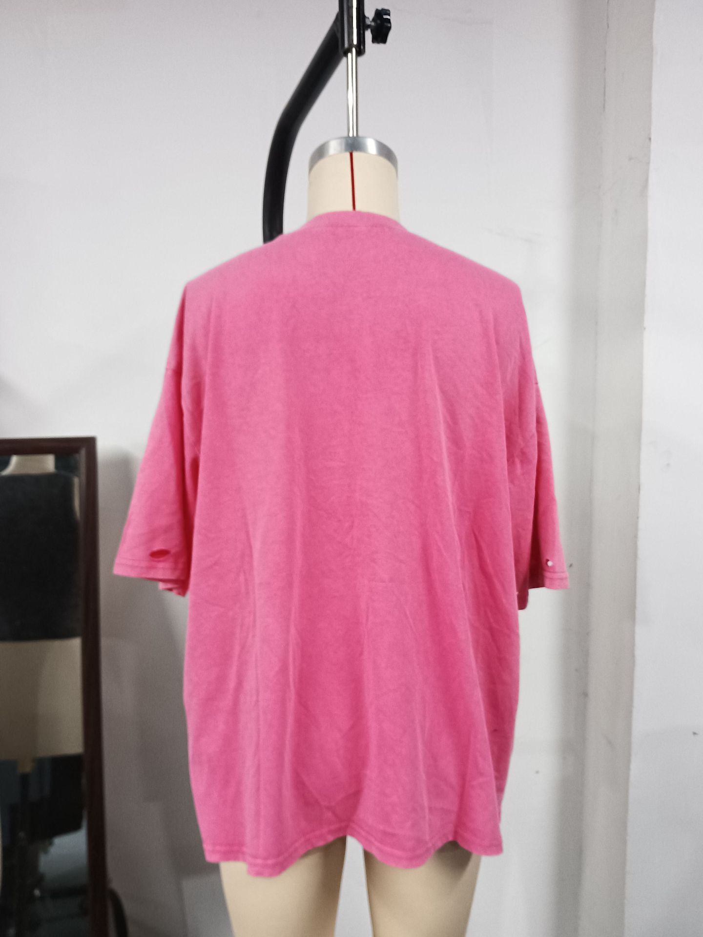 깨진 스타일의 핑크 편지 인쇄 디자인 짧은 소매 느슨한 게으른 거리 촬영 트렌디 한 캐주얼 중간 길이 티셔츠스토어 가기