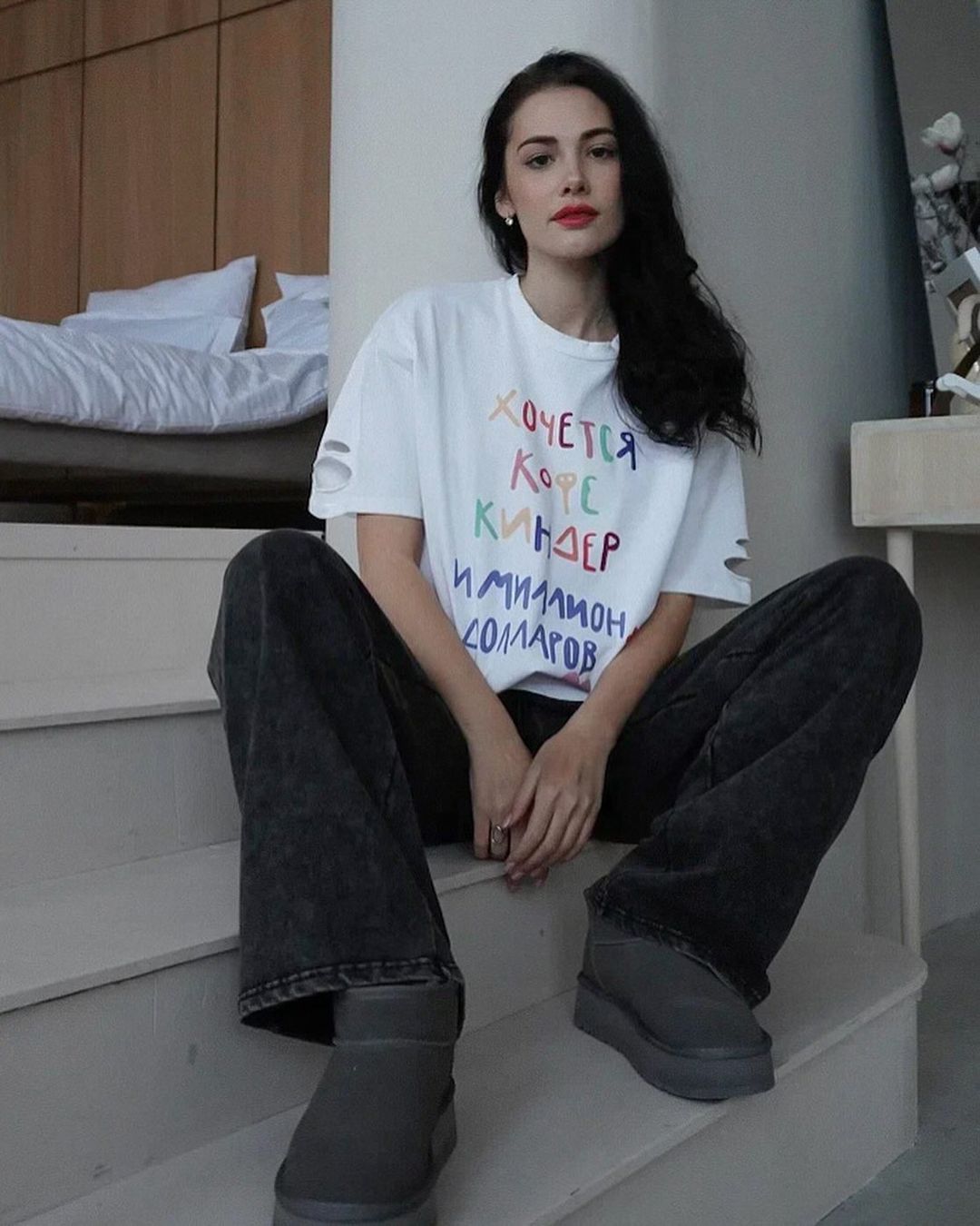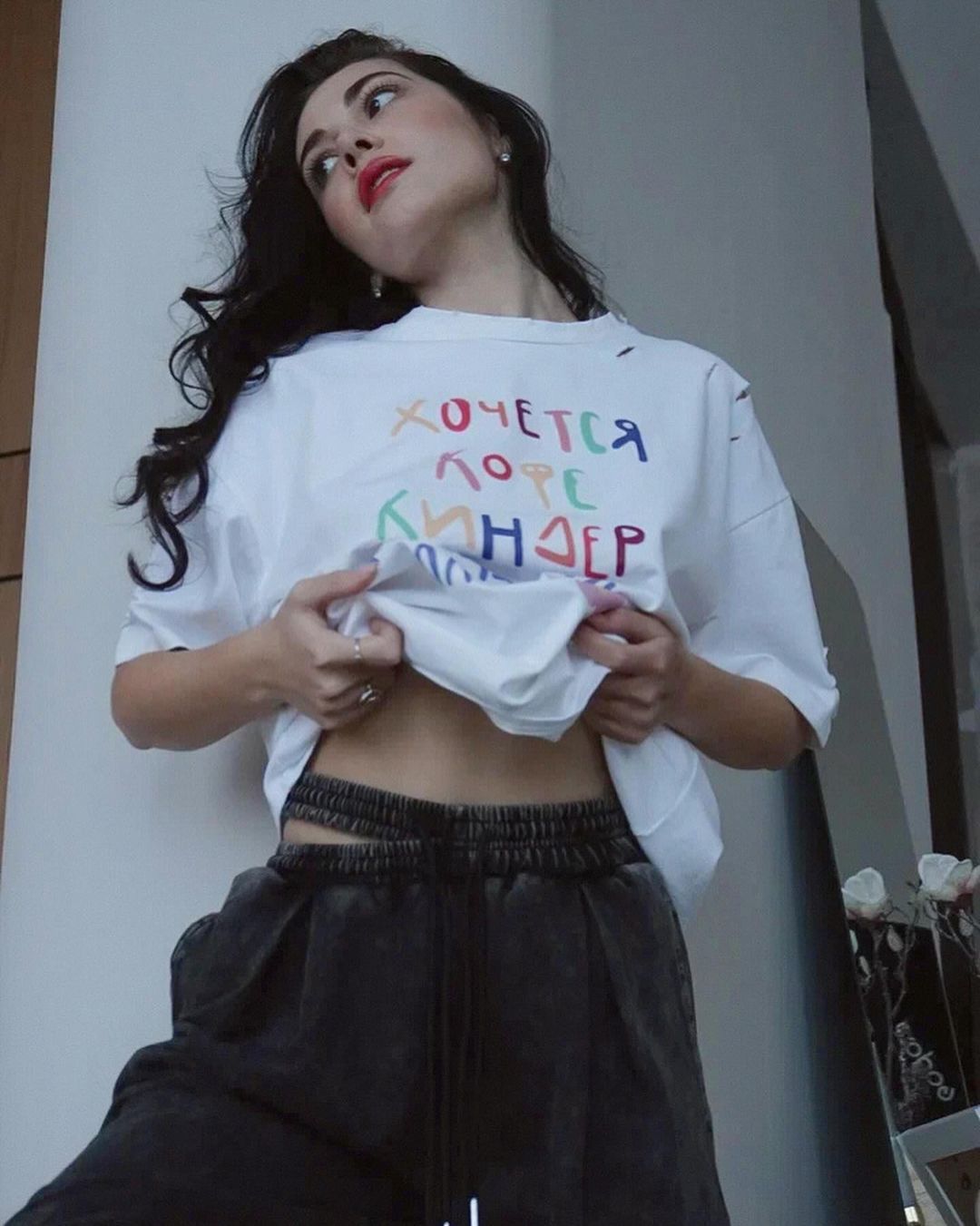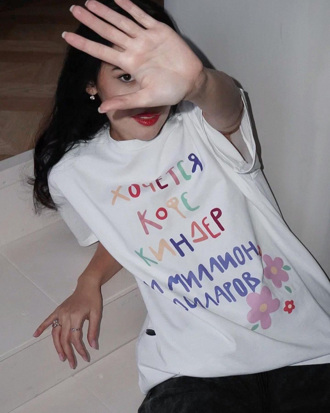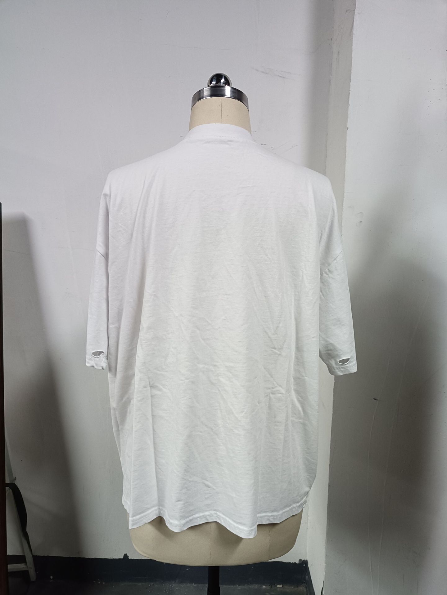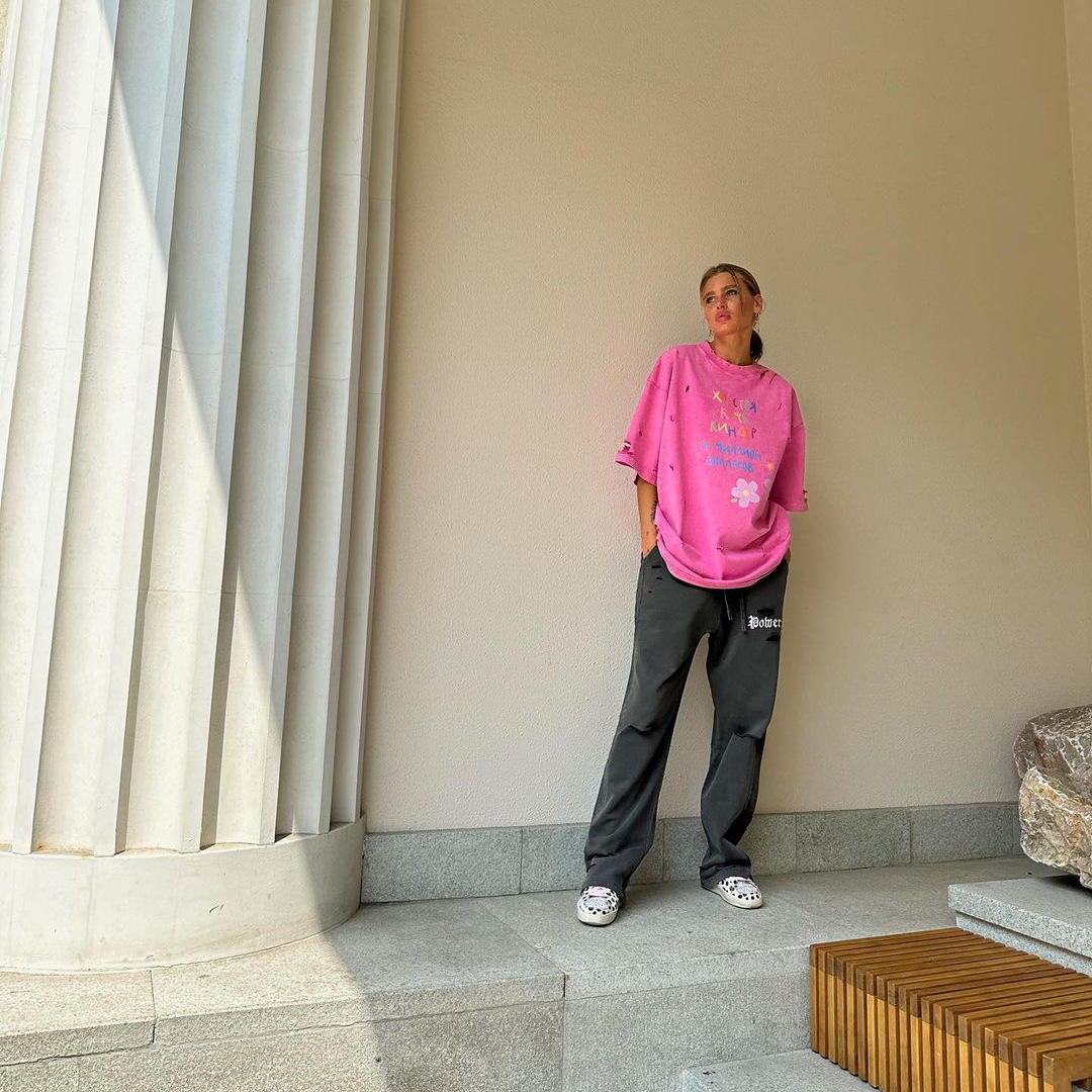 깨진 스타일의 핑크 편지 인쇄 디자인 짧은 소매 느슨한 게으른 거리 촬영 트렌디 한 캐주얼 중간 길이 티셔츠