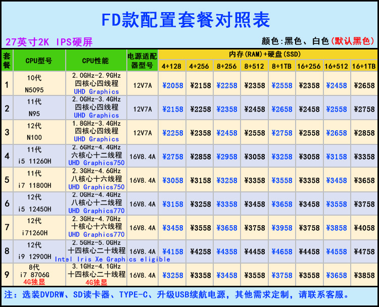 • FD2-3:27 인치 2K/CPU:11 세대 N95/메모리 RAM:8g/하드 디스크 SSD:256G