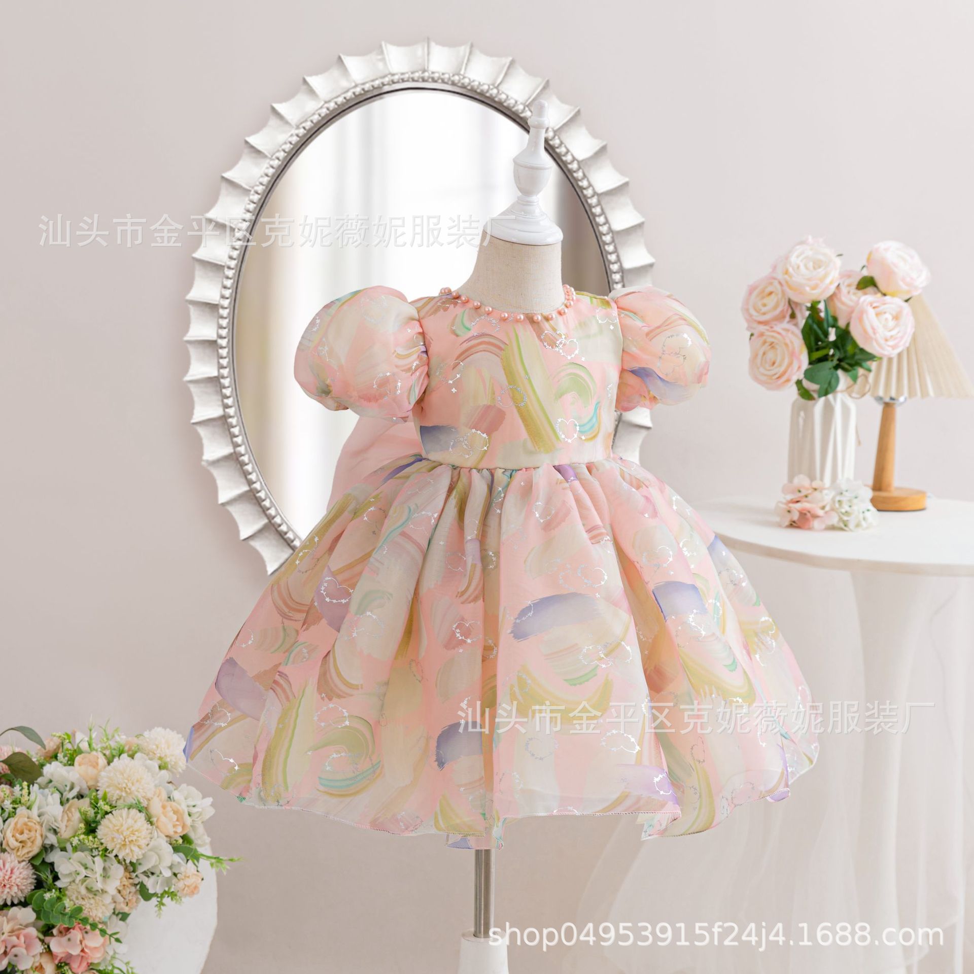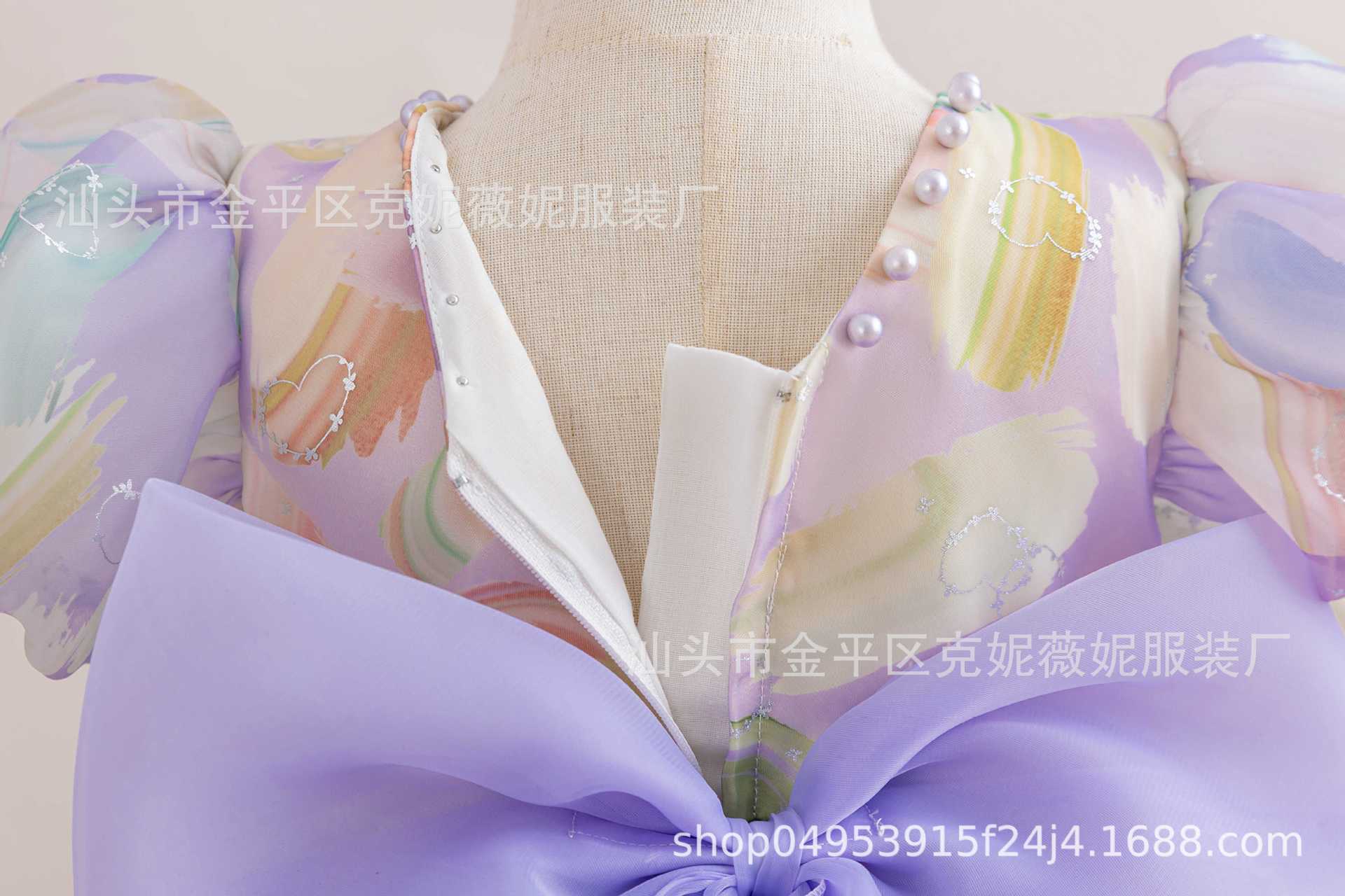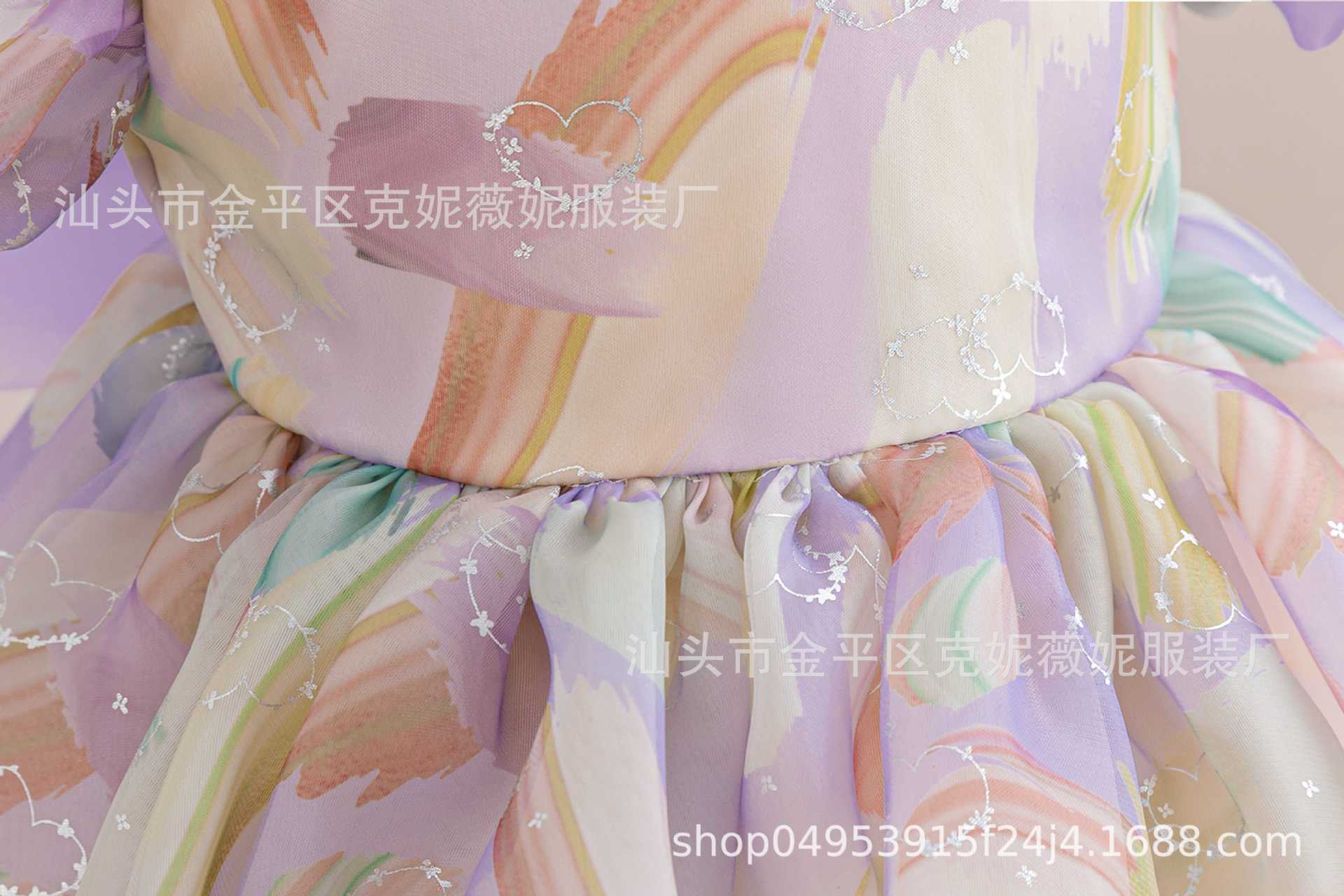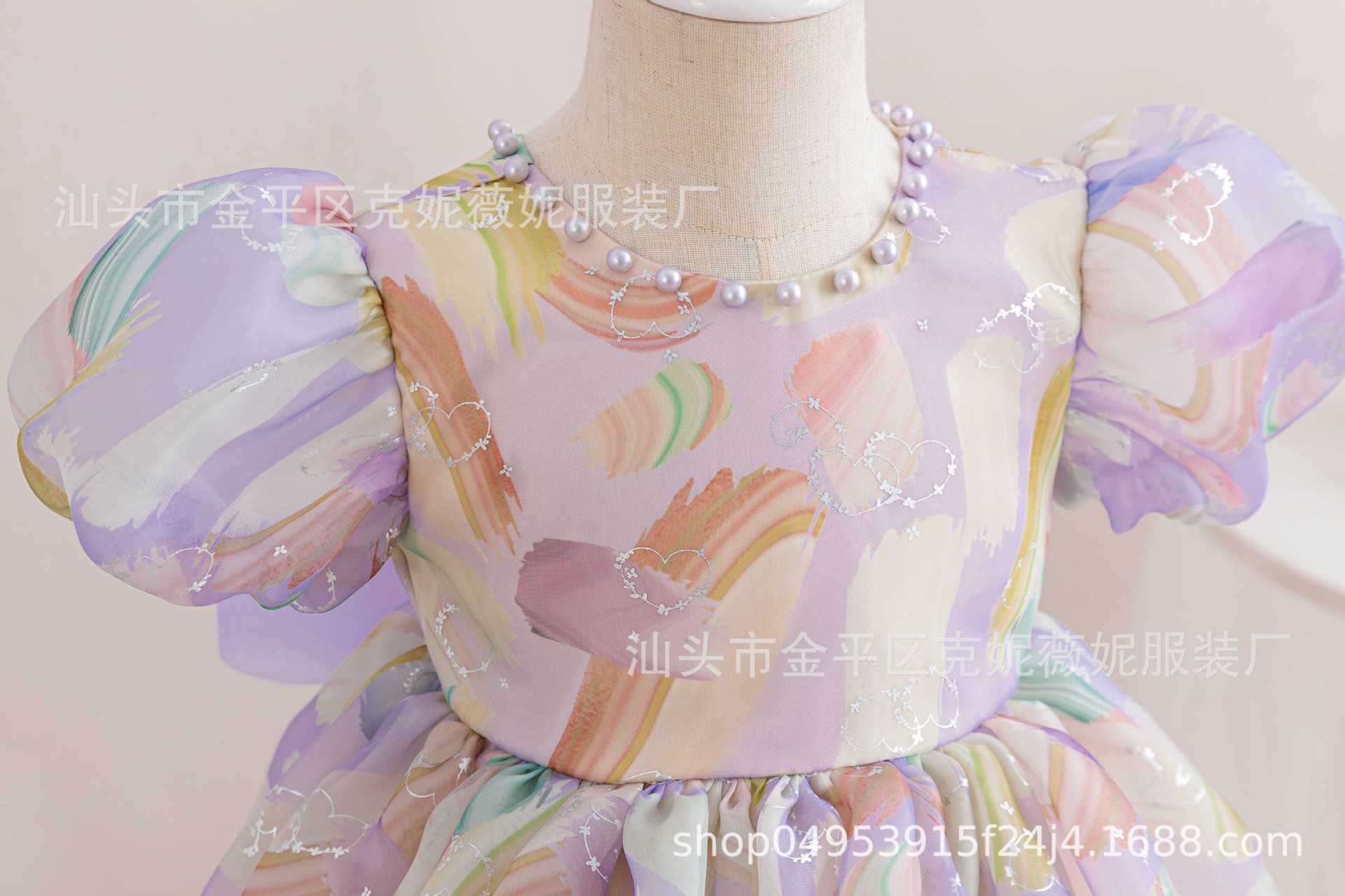 새로운 2024 여름 소녀 원피스 유럽과 미국의 퍼프 소매 공주 원피스 어린이 꽃 원피스 메쉬 페티 스커트