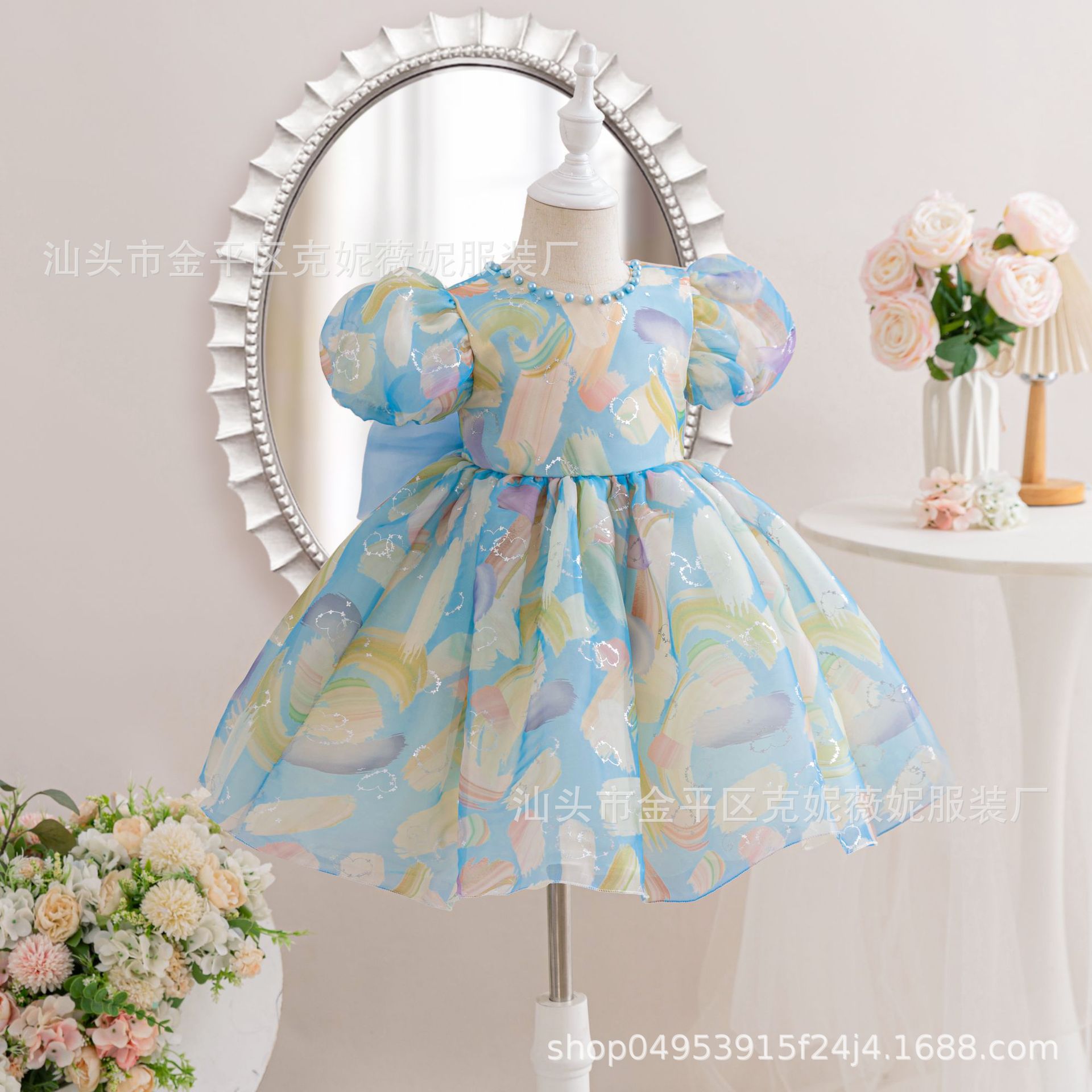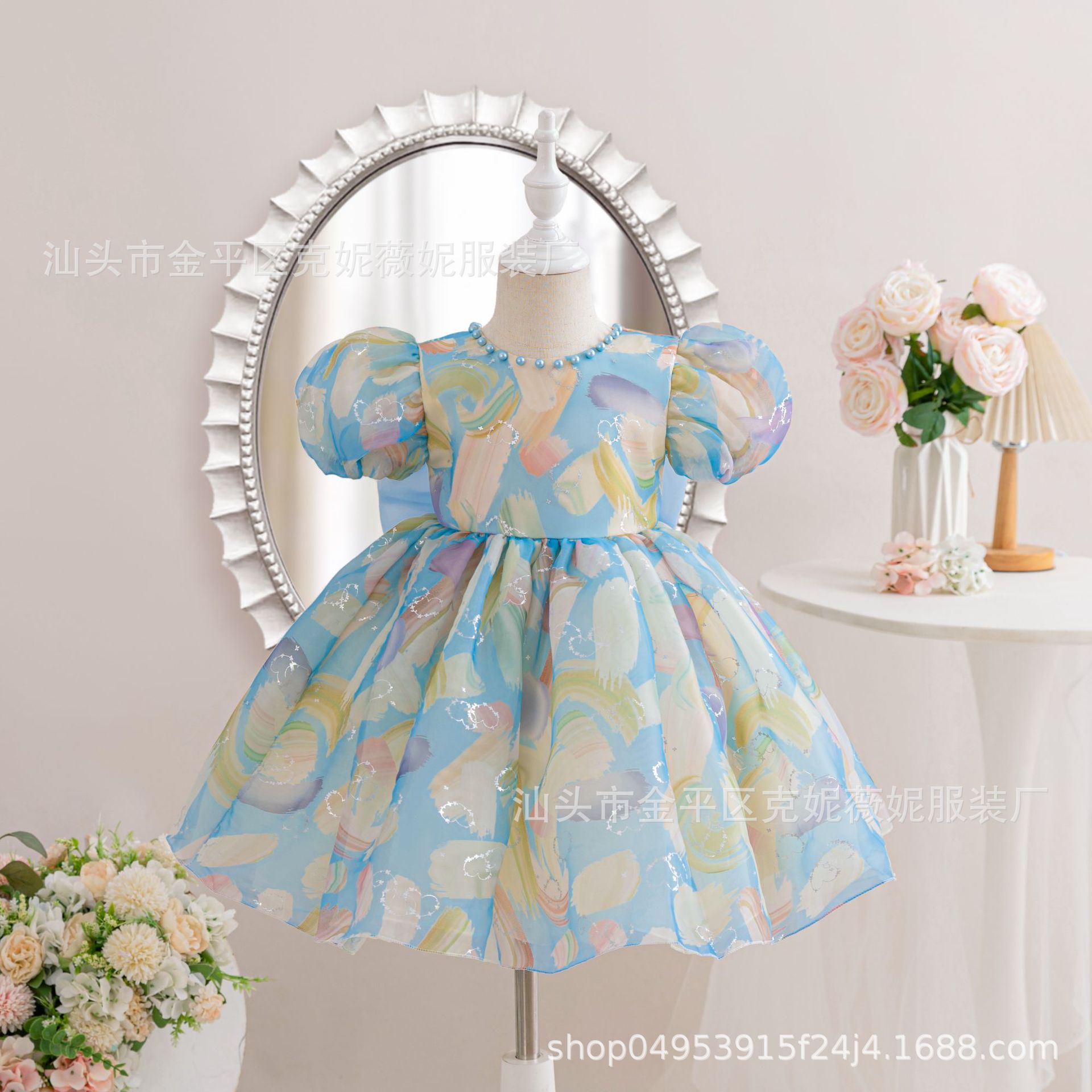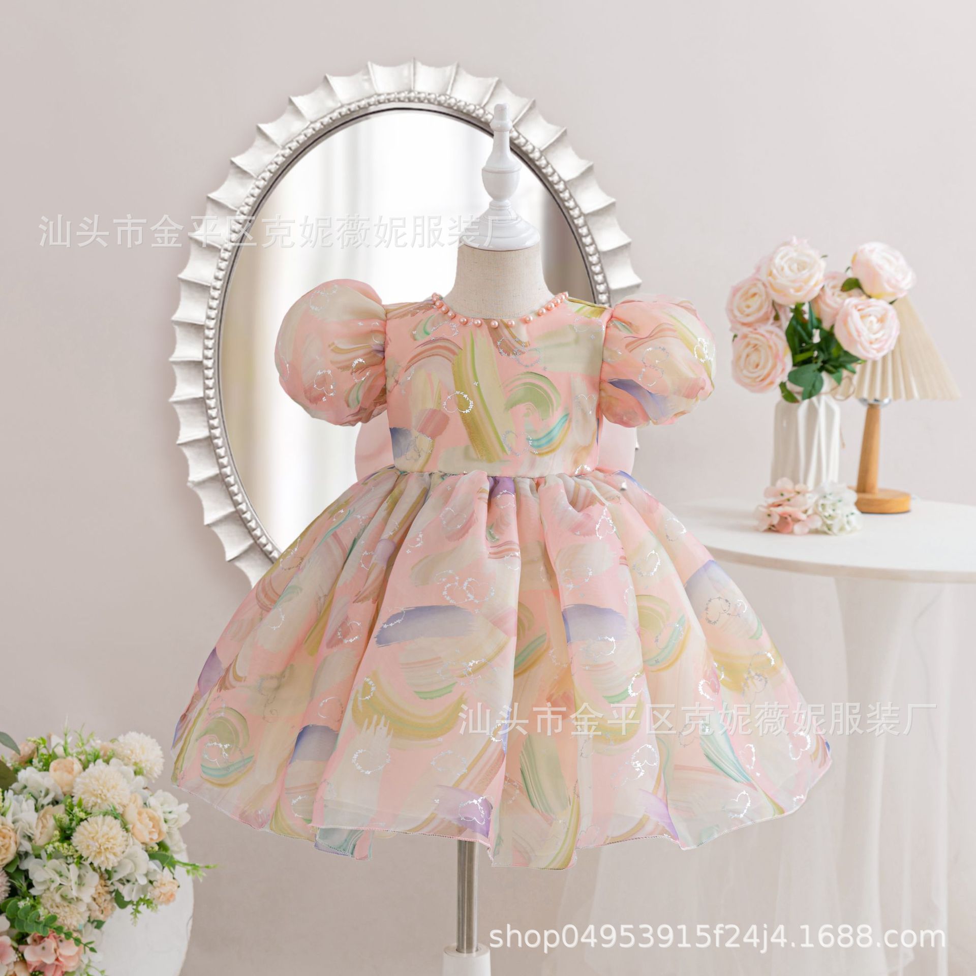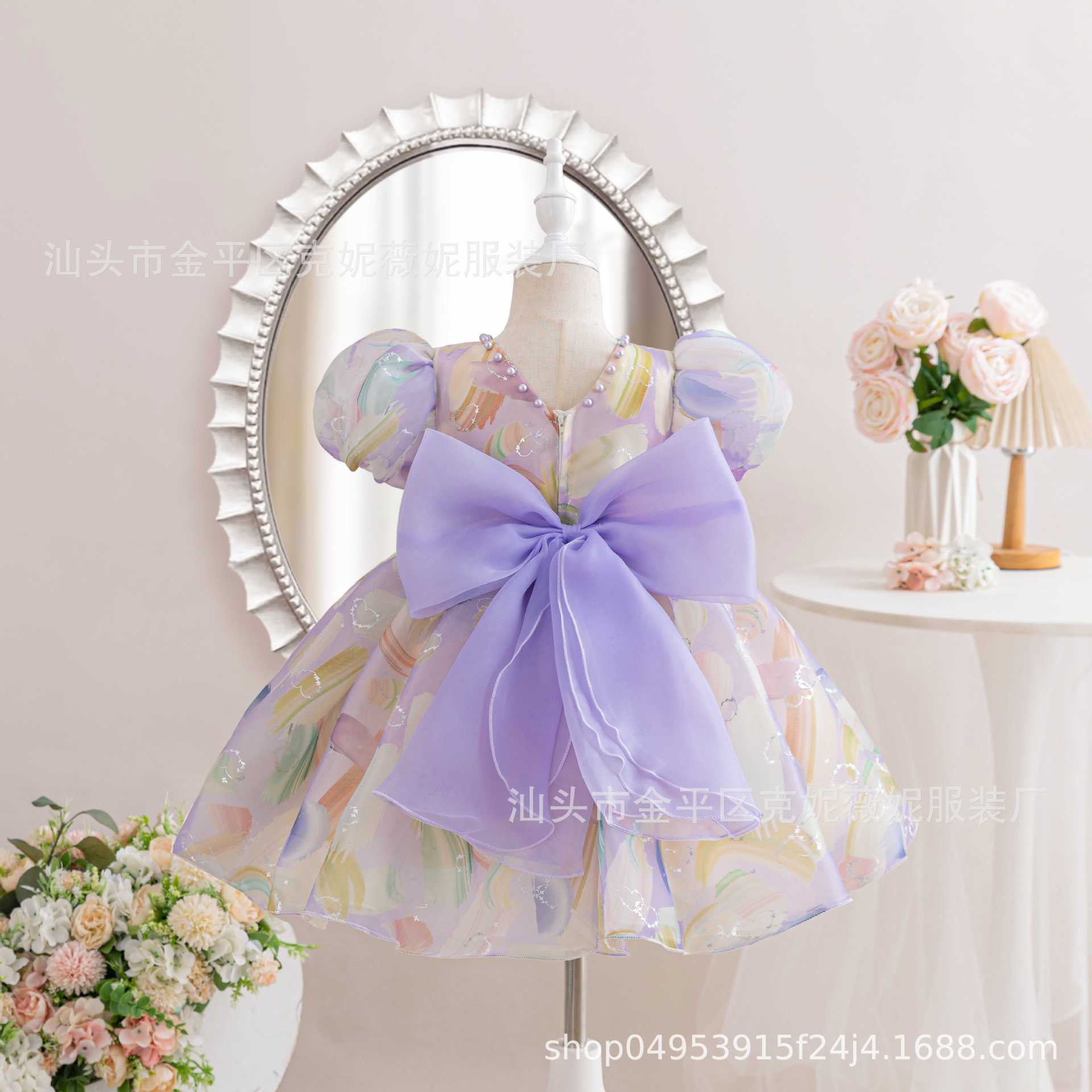 새로운 2024 여름 소녀 원피스 유럽과 미국의 퍼프 소매 공주 원피스 어린이 꽃 원피스 메쉬 페티 스커트스토어 가기