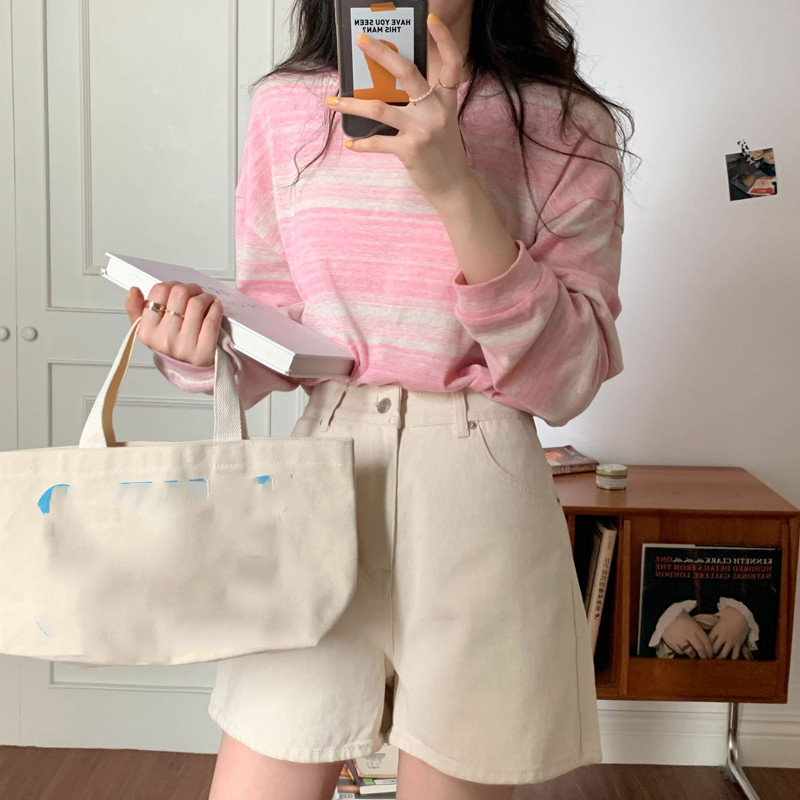 동남아시아 2021 새로운 디자인 감각 틈새 느슨한 탑 옷 봄과 가을 줄무늬 긴 소매 티셔츠 여성 의류 I