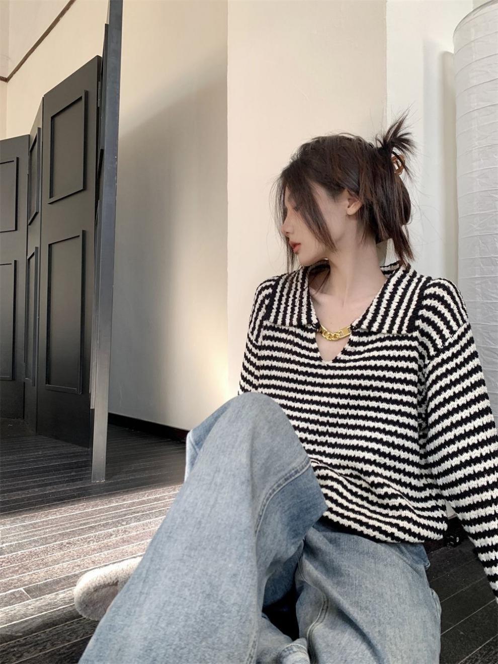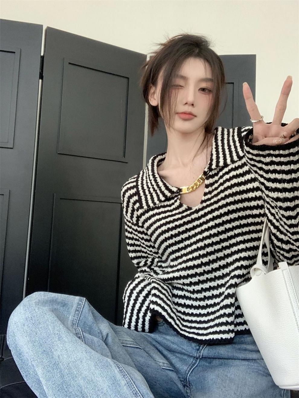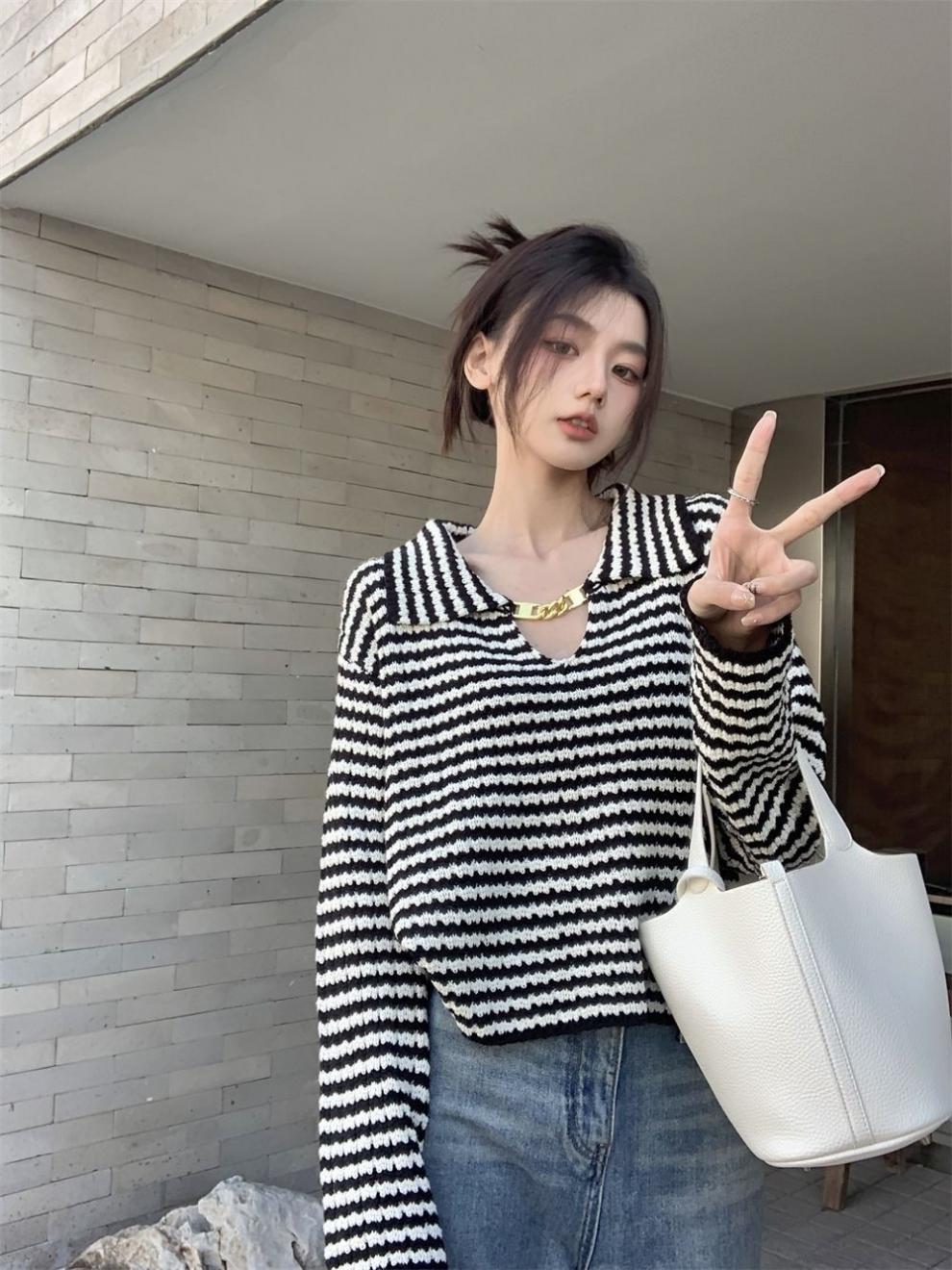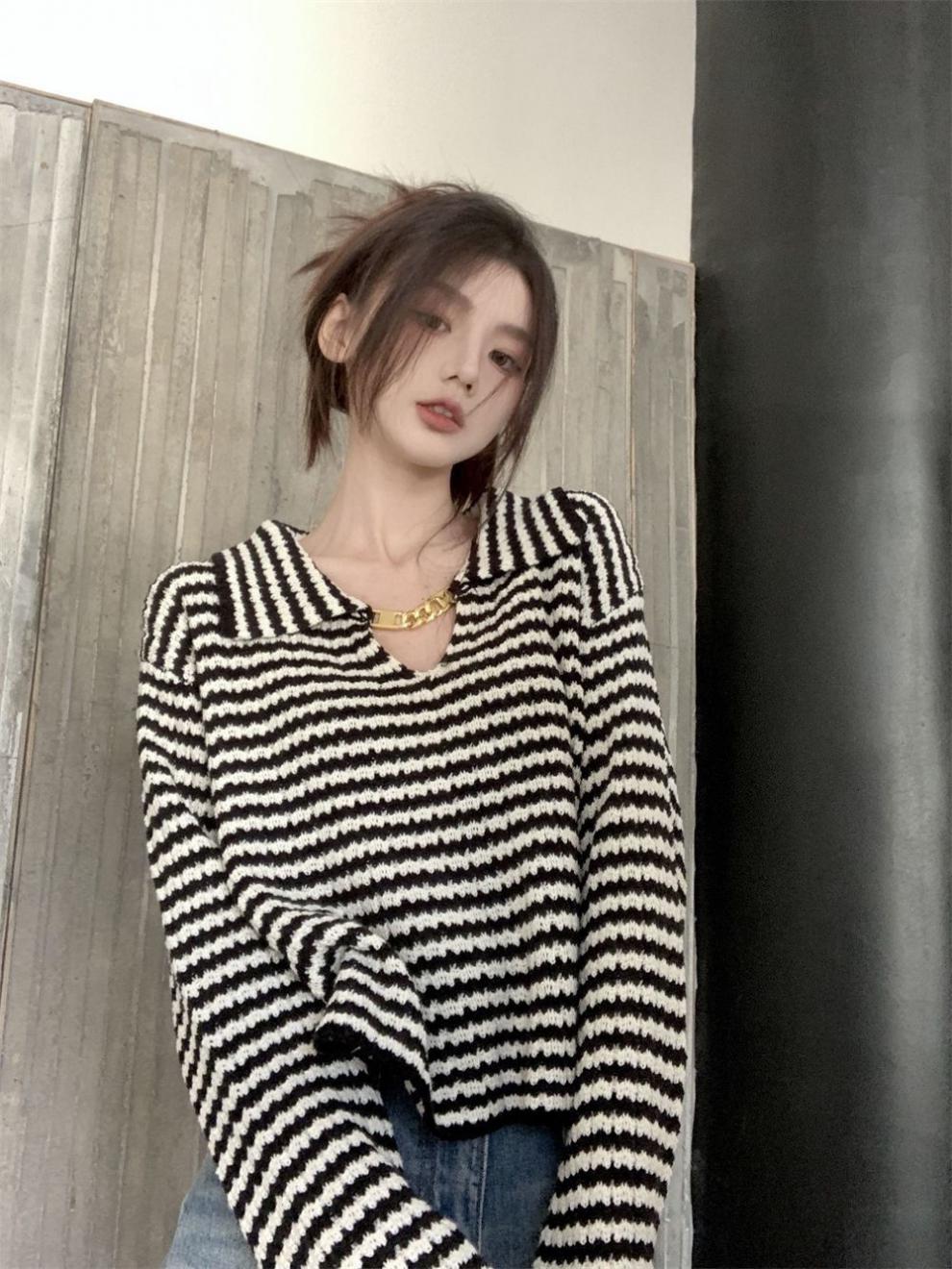 프랑스 헵번 스타일 옷깃 줄무늬 스웨터 여성의 봄 2023 새로운 스타일의 세련된 금속 스트립 느슨한 스웨터 탑