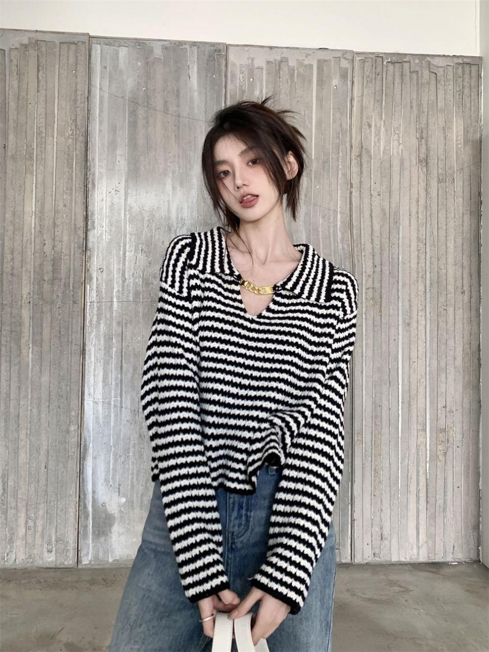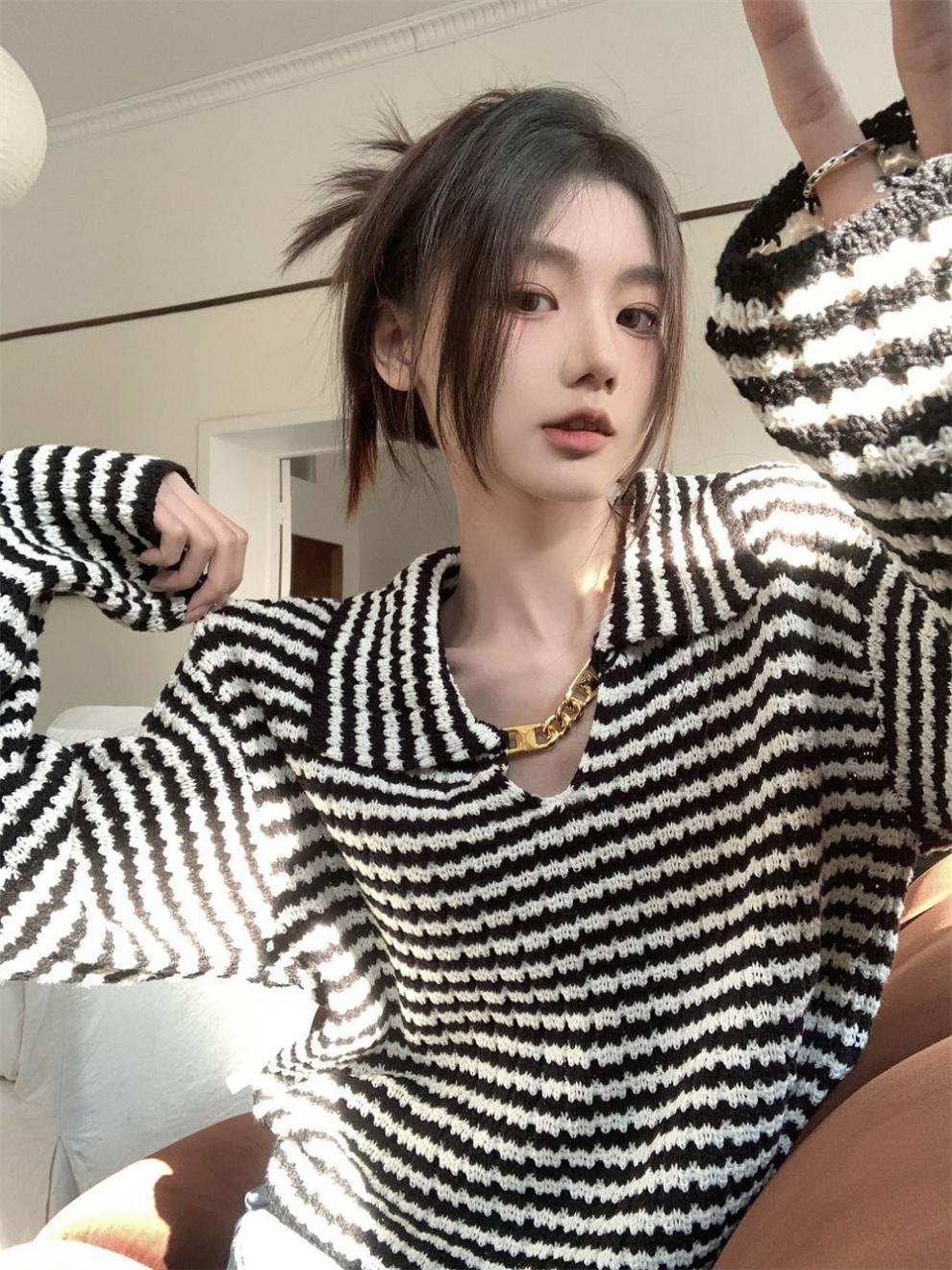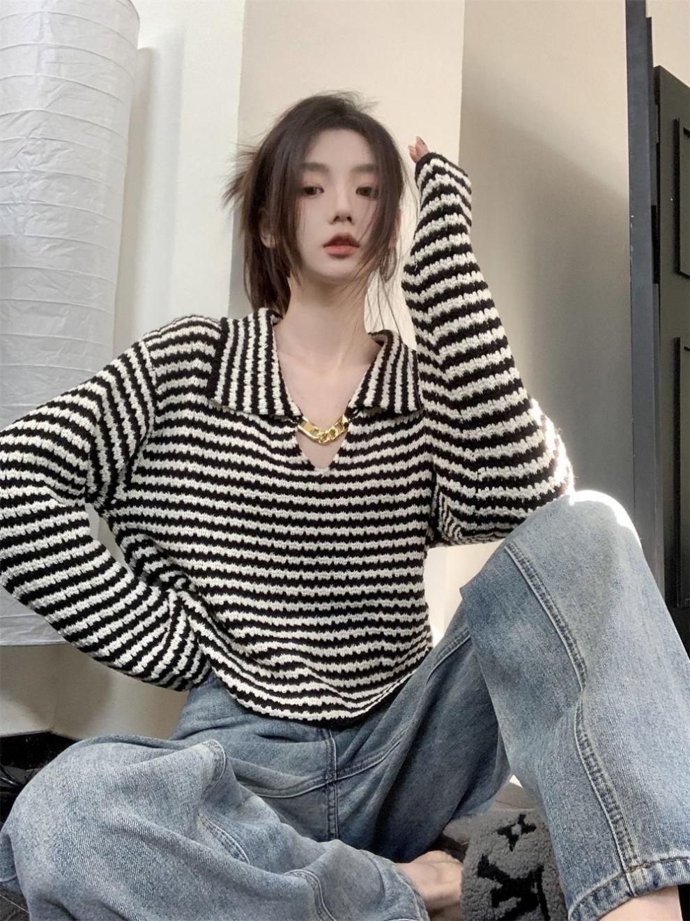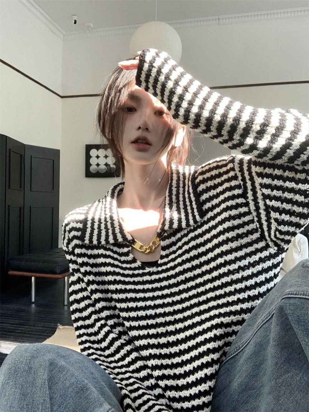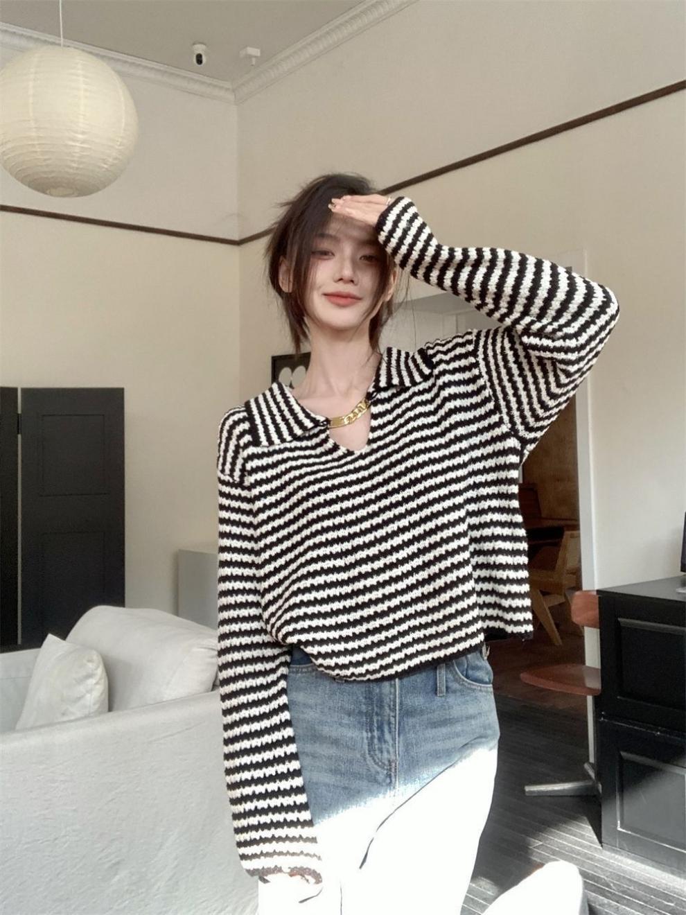 프랑스 헵번 스타일 옷깃 줄무늬 스웨터 여성의 봄 2023 새로운 스타일의 세련된 금속 스트립 느슨한 스웨터 탑