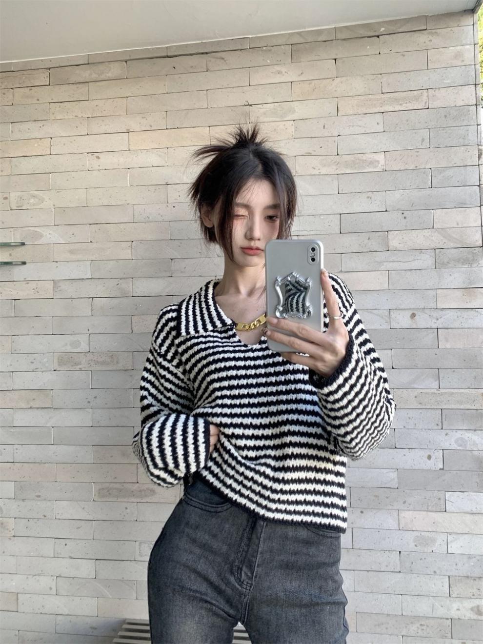 프랑스 헵번 스타일 옷깃 줄무늬 스웨터 여성의 봄 2023 새로운 스타일의 세련된 금속 스트립 느슨한 스웨터 탑스토어 가기