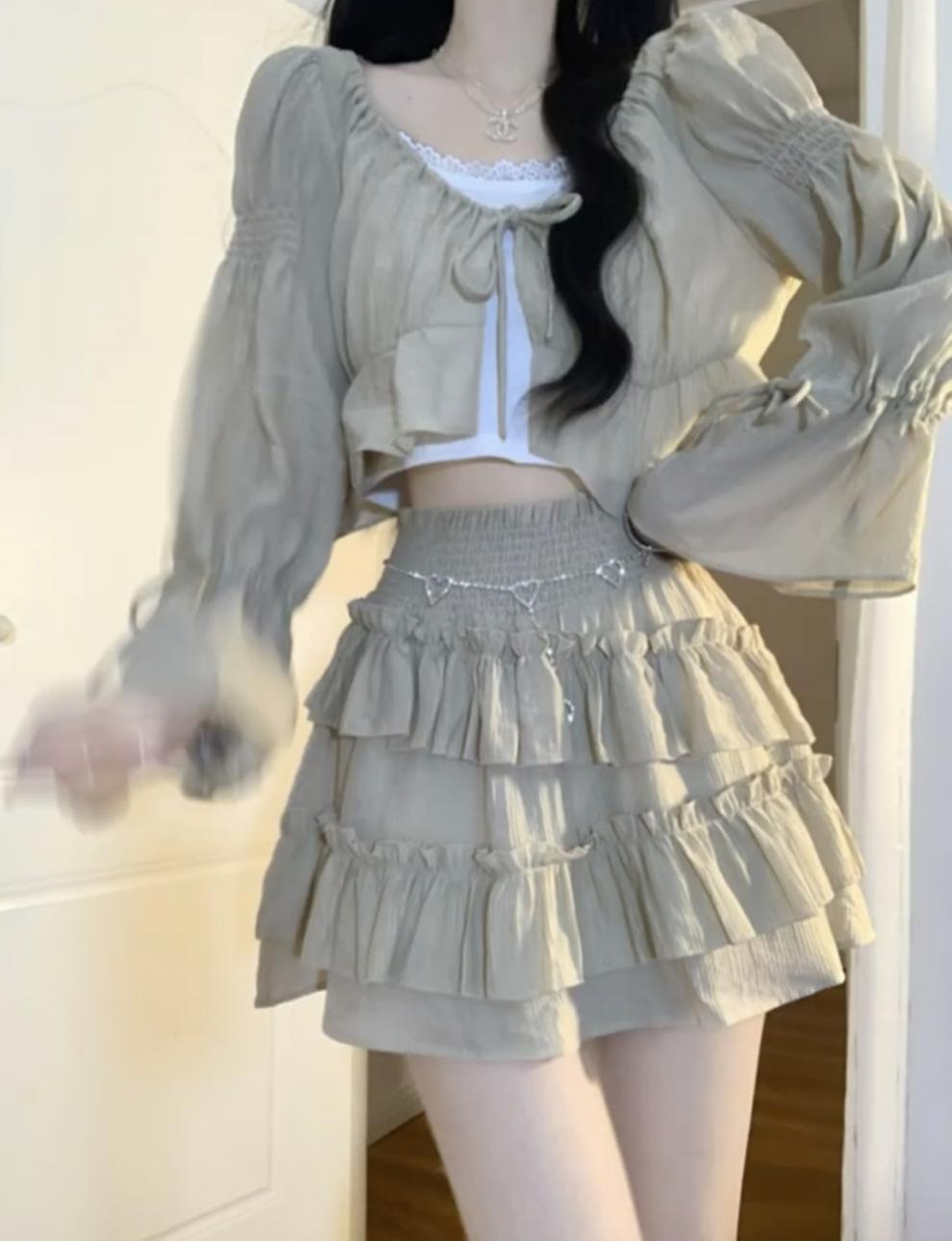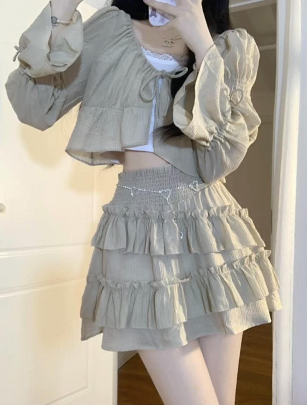 세트 여성의 2023 가을 새로운 순수 우아한 레이스 카미솔 짧은 탑 케이크 스커트 3 피스 세트 트렌디스토어 가기