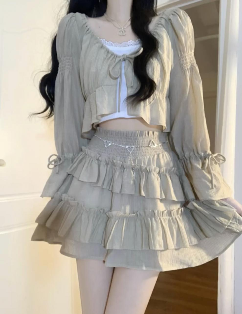 세트 여성의 2023 가을 새로운 순수 우아한 레이스 카미솔 짧은 탑 케이크 스커트 3 피스 세트 트렌디