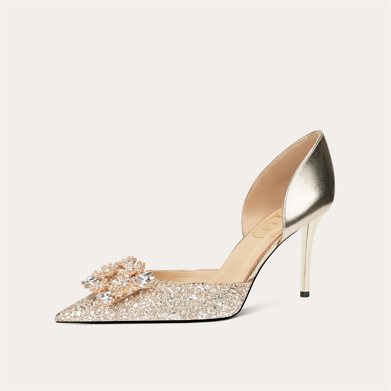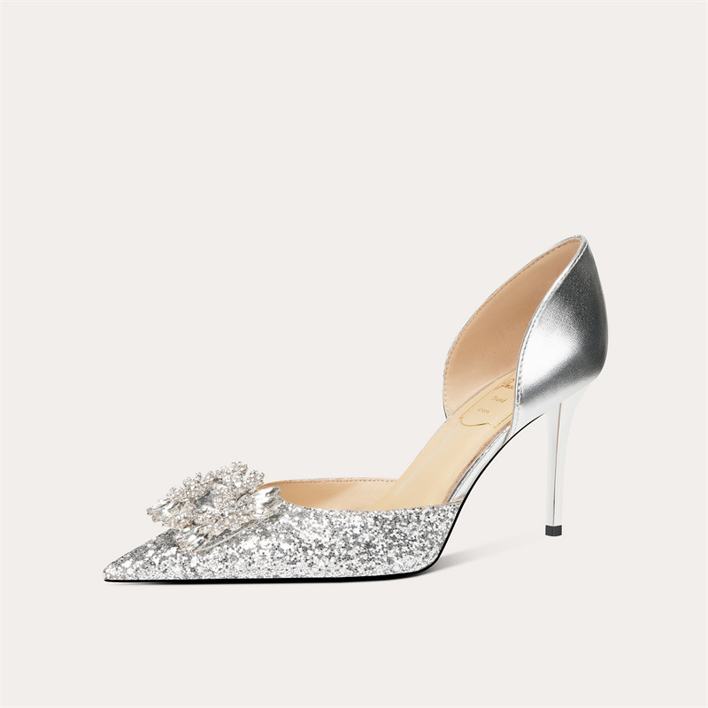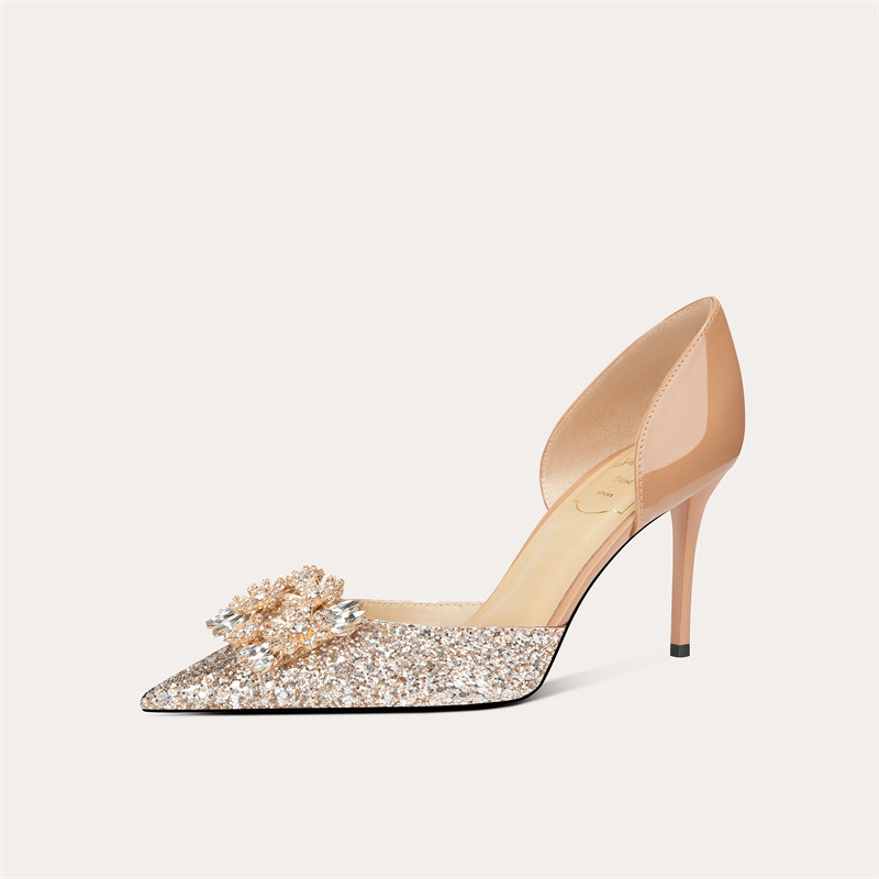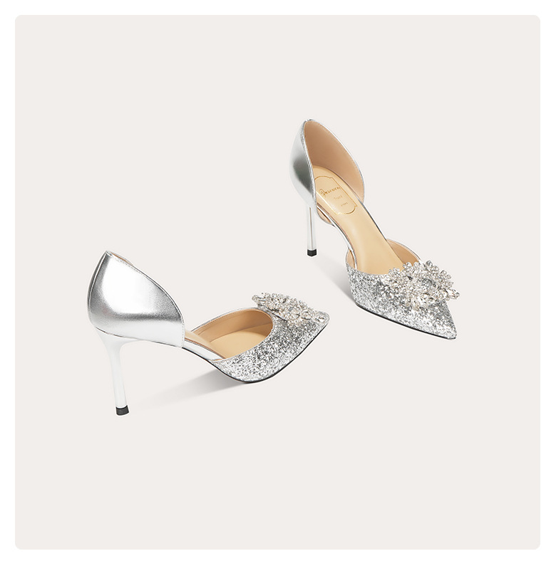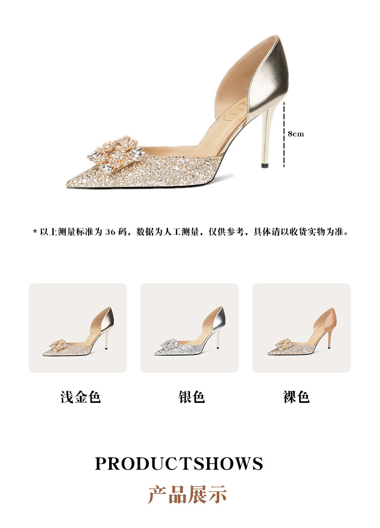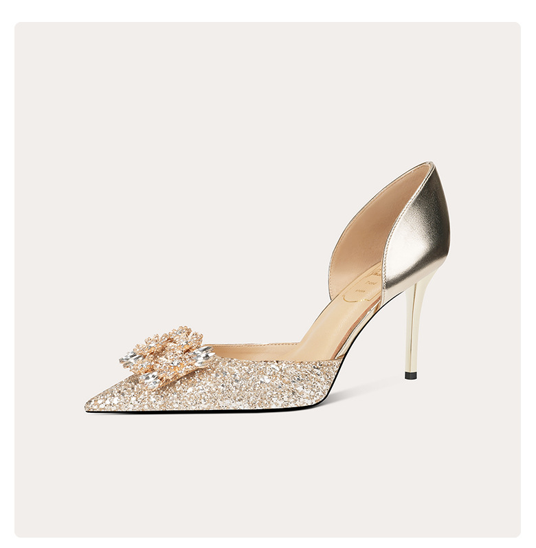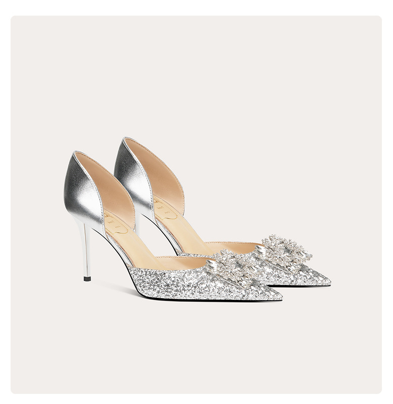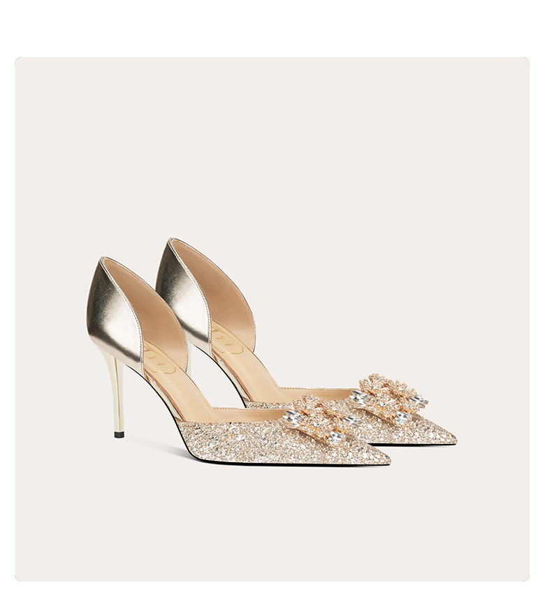 708-A69 프랑스 스타일 스퀘어 버클 양가죽 하이힐 신부 신발 원피스 단층 신발 뾰족한 여성용 속이 빈 연회 신발