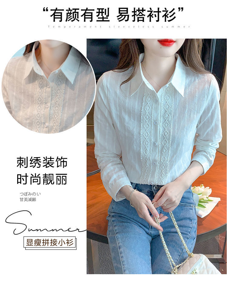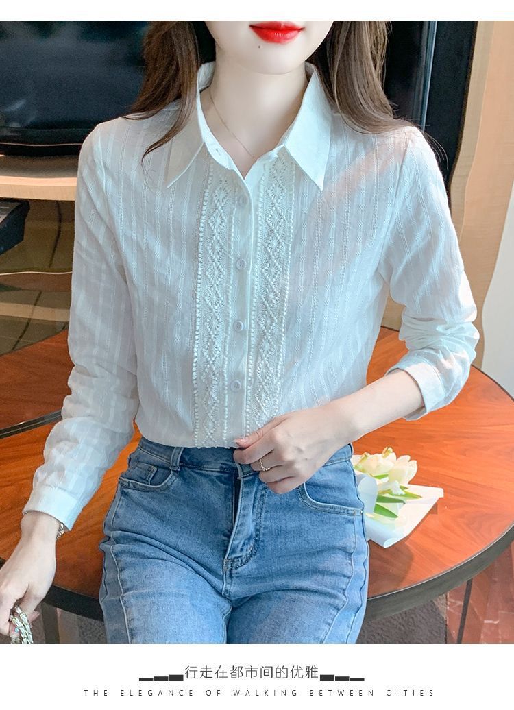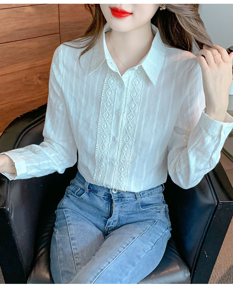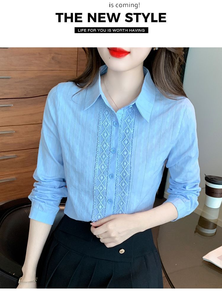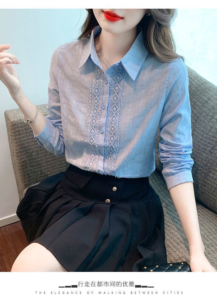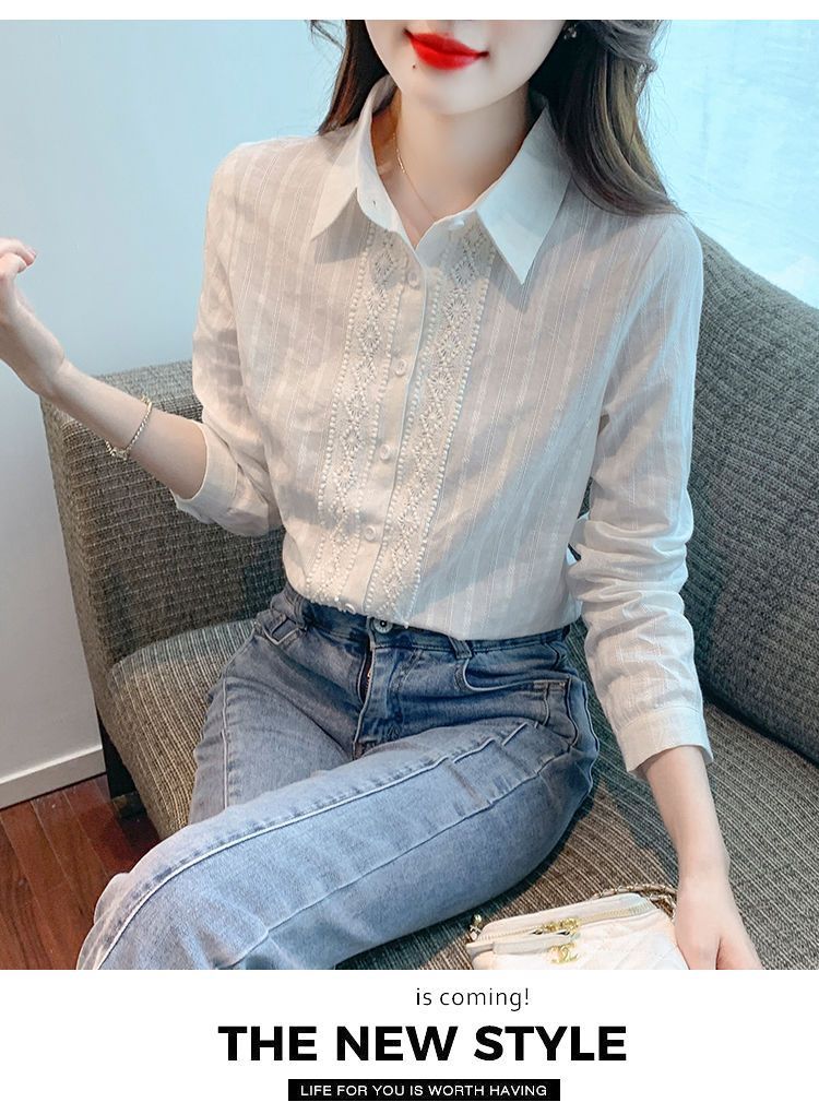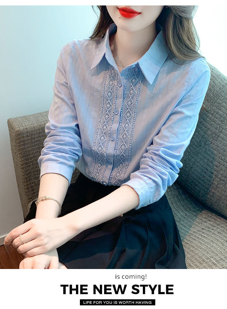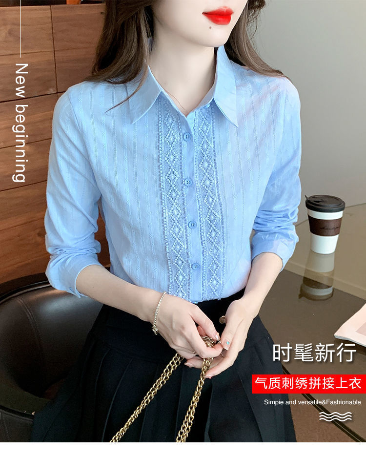 2025년 봄 신상 여성 패션 자수 순면 셔츠 여성용 세련된 면 셔츠 레이스 스티치 탑