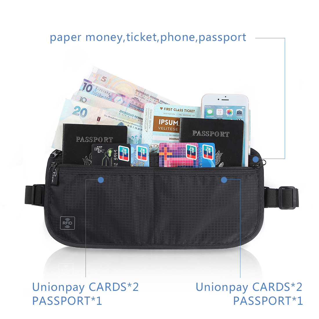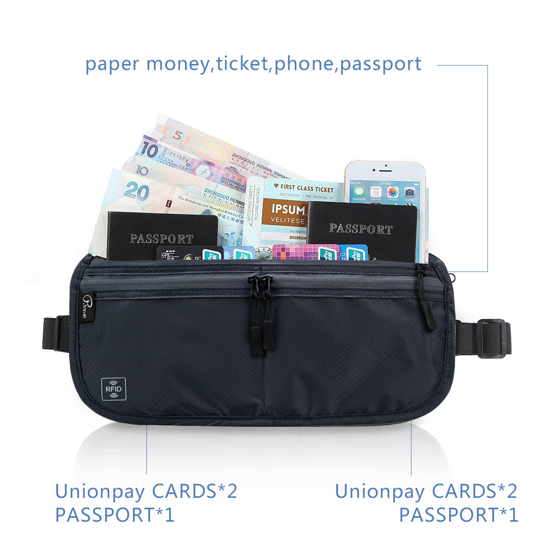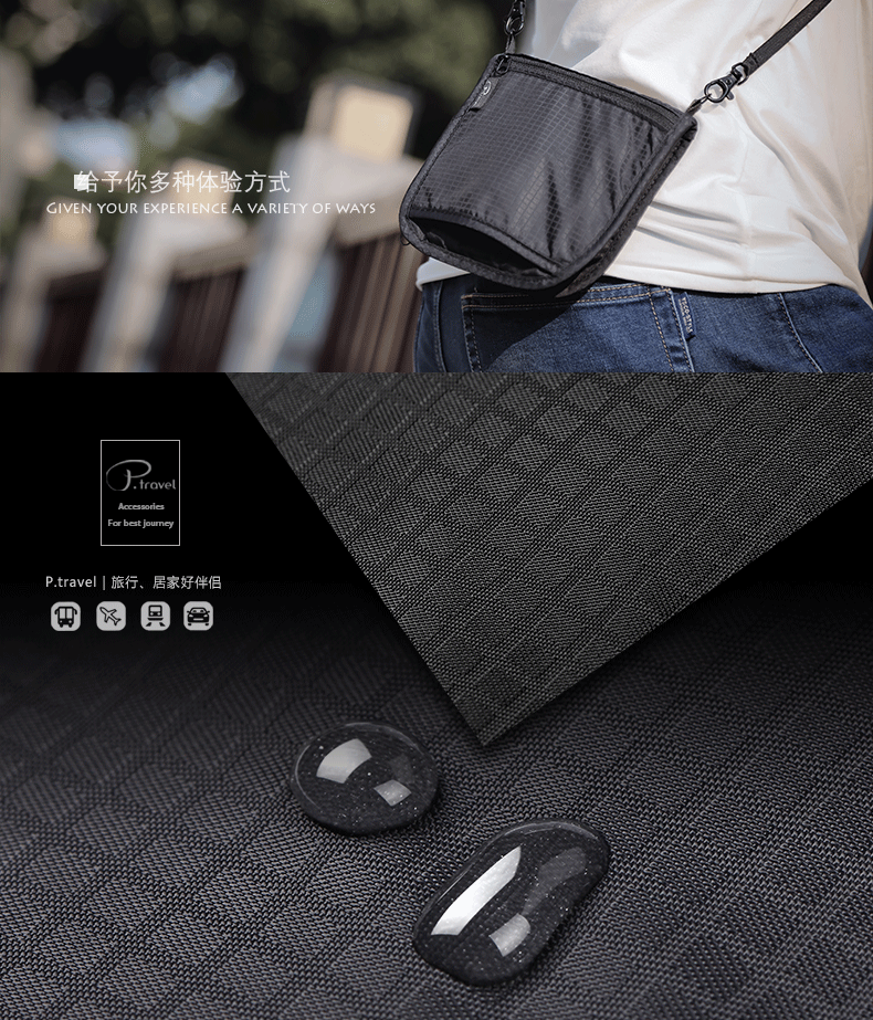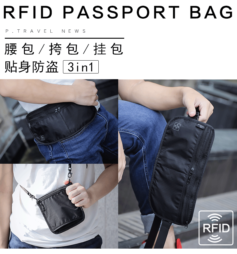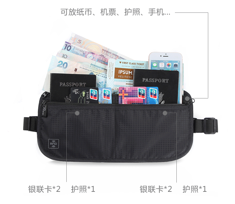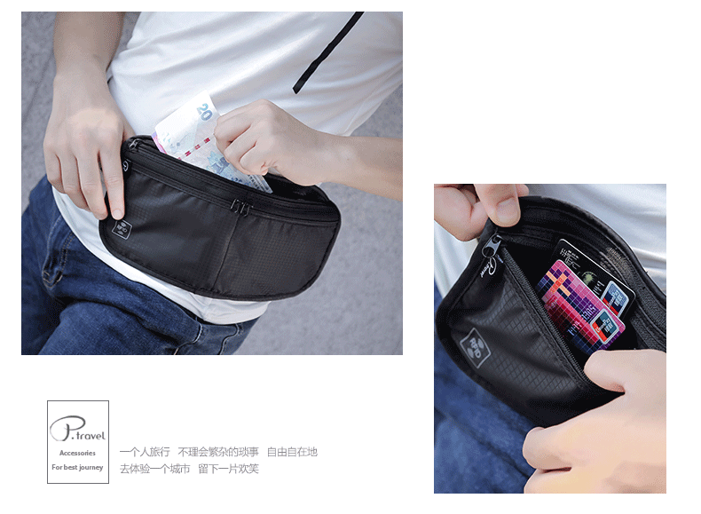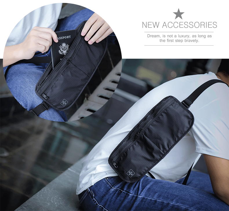 다기능 접이식 허리 가방 도난 방지 브러시 조정 가능한 사첼 인증서 저장 가방 대용량 휴대용 여행 필수품