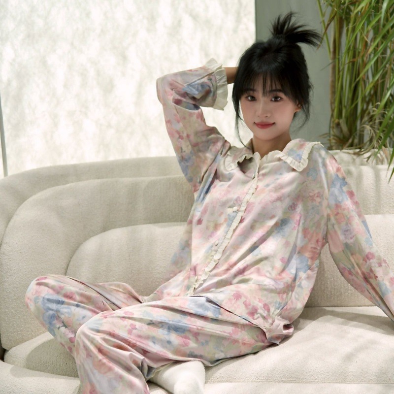[꽃 신 플로라] 새 봄 아이스 실크 파자마 여성 달콤한 긴 소매 바지 세트 홈 옷 착용 가능