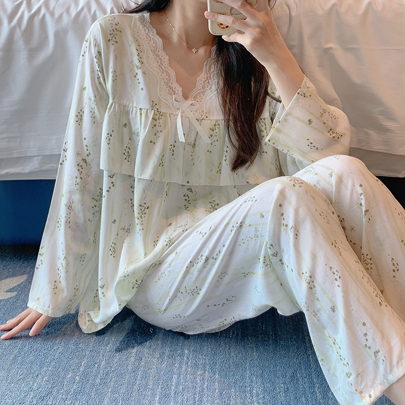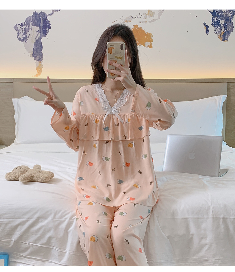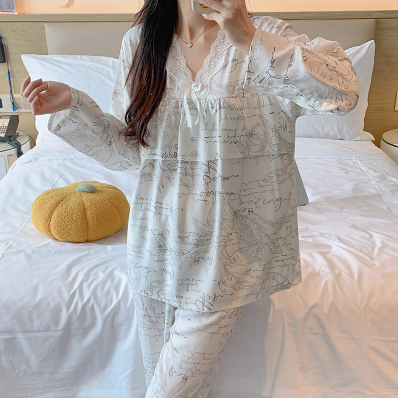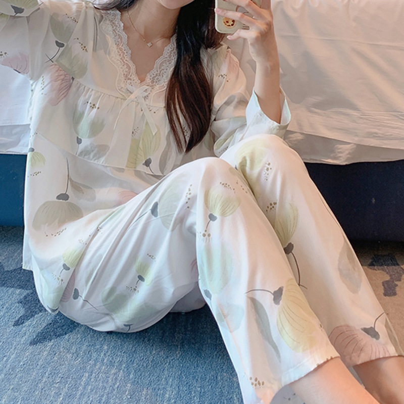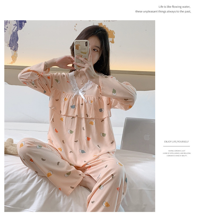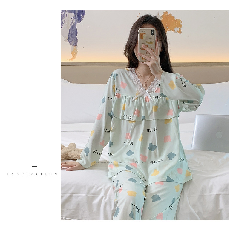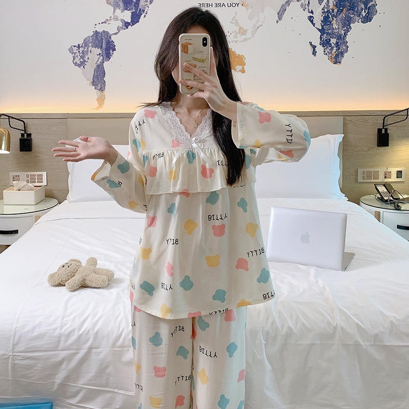 봄과 가을 여성면 실크 파자마 레이스 엣지 프린트 긴팔 바지 투피스 안티 범프 귀여운 얇은 파자마스토어 가기