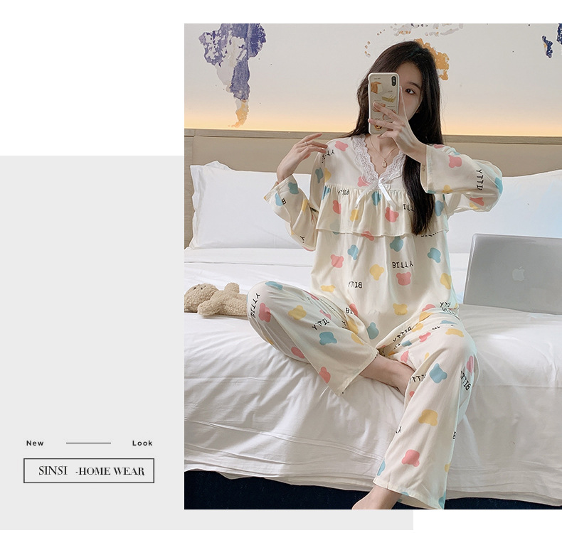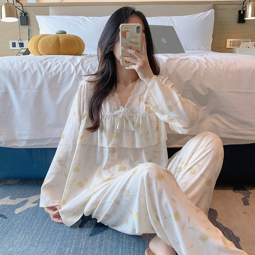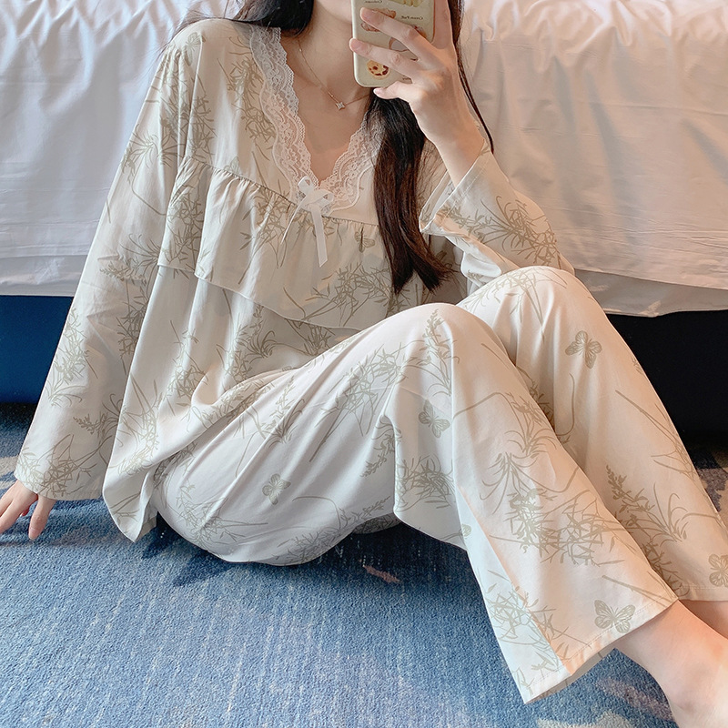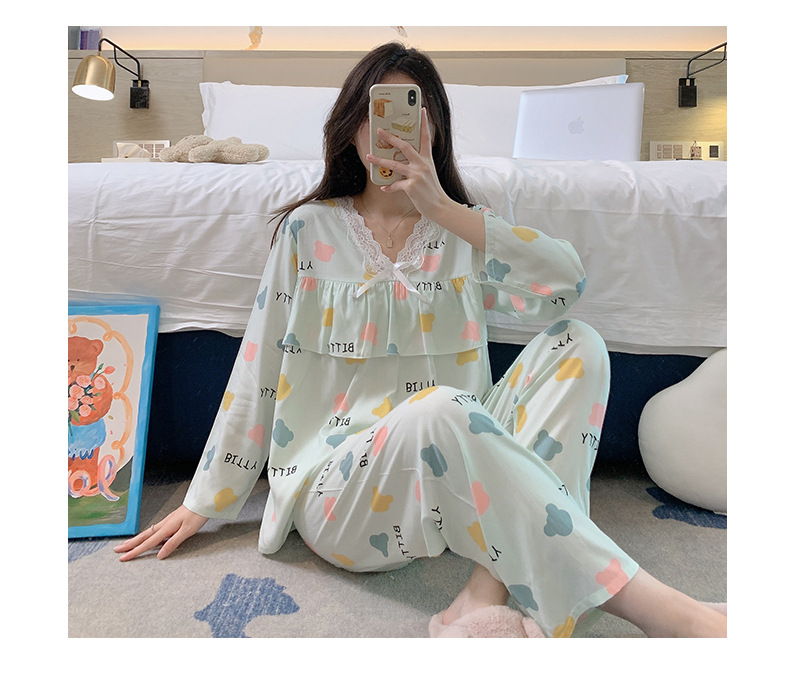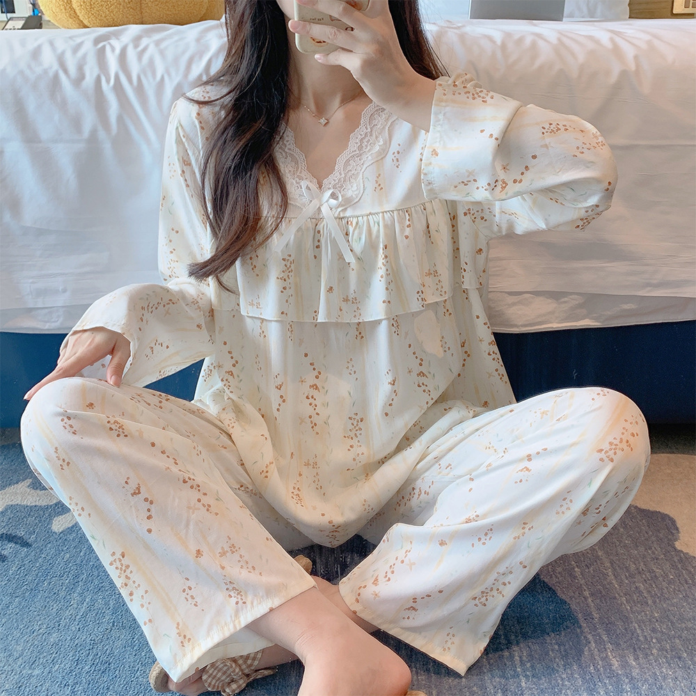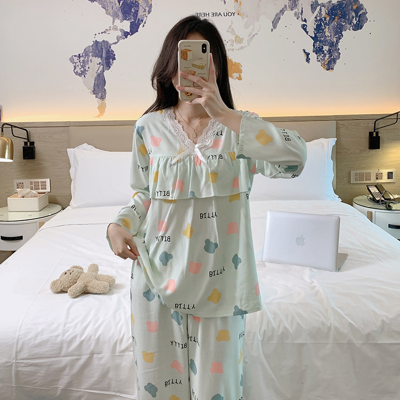 봄과 가을 여성면 실크 파자마 레이스 엣지 프린트 긴팔 바지 투피스 안티 범프 귀여운 얇은 파자마스토어 가기