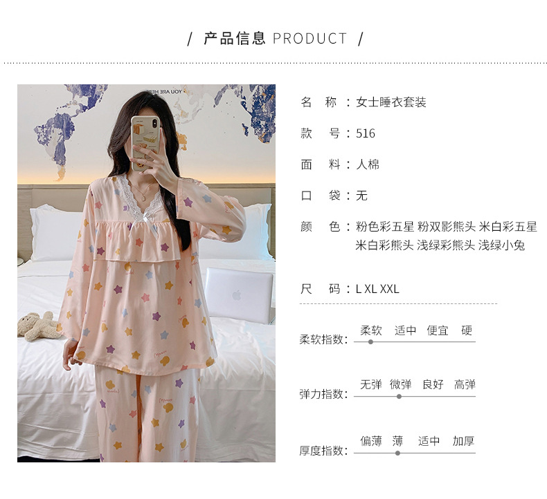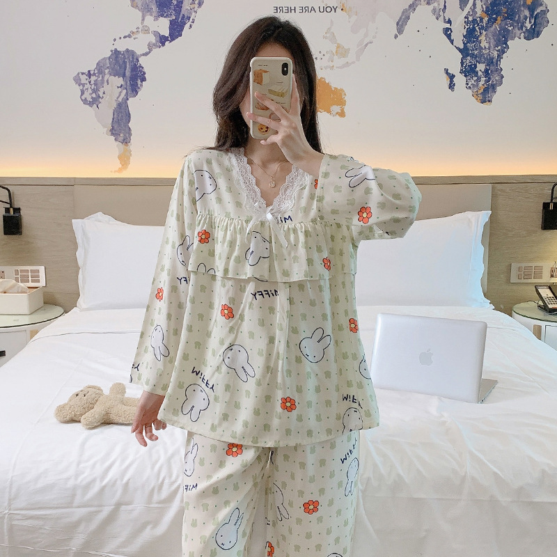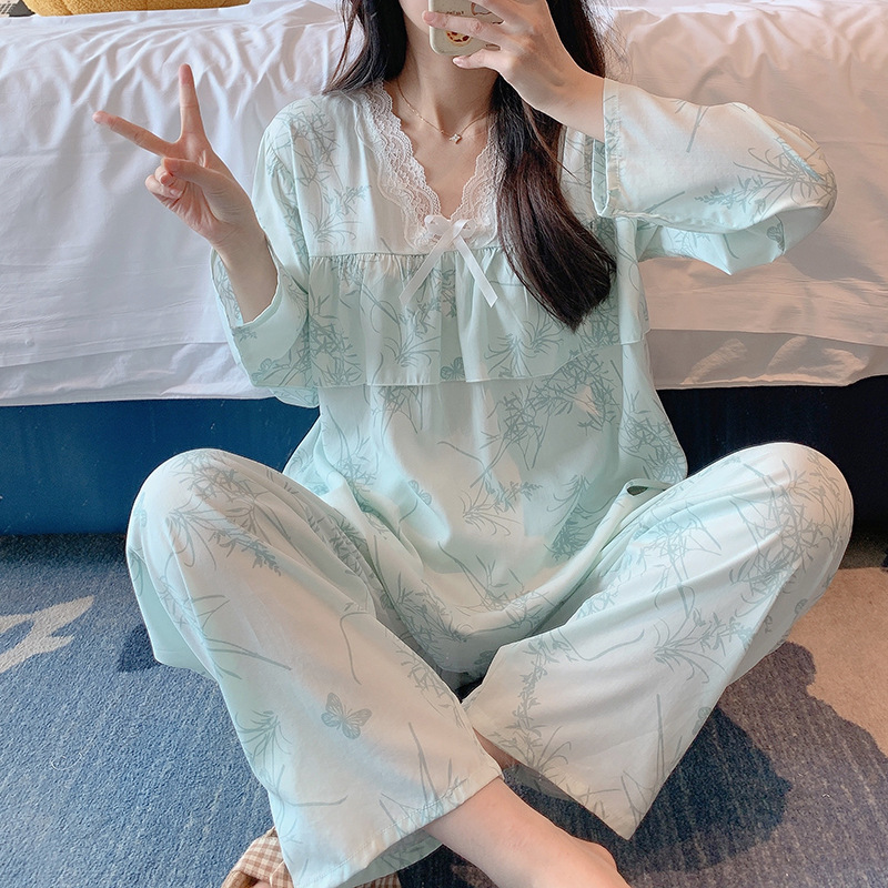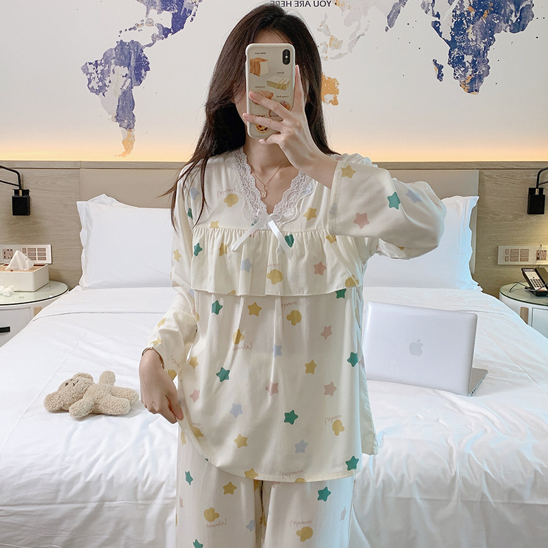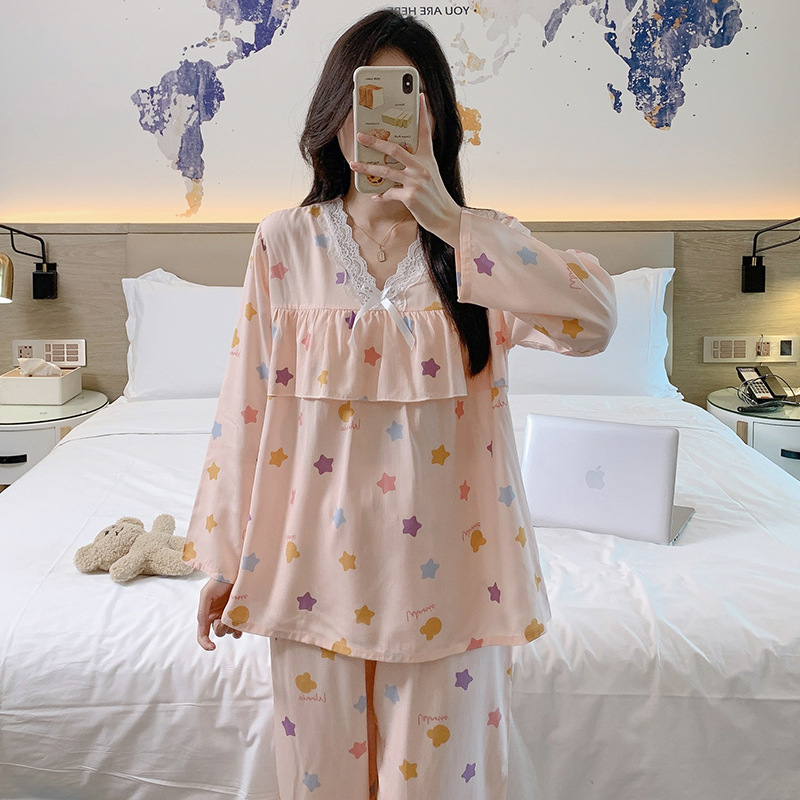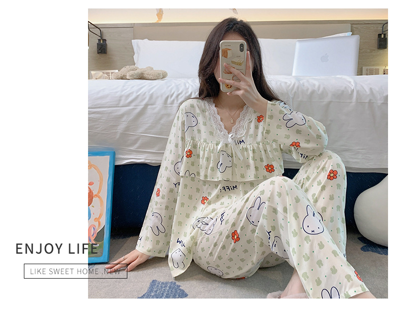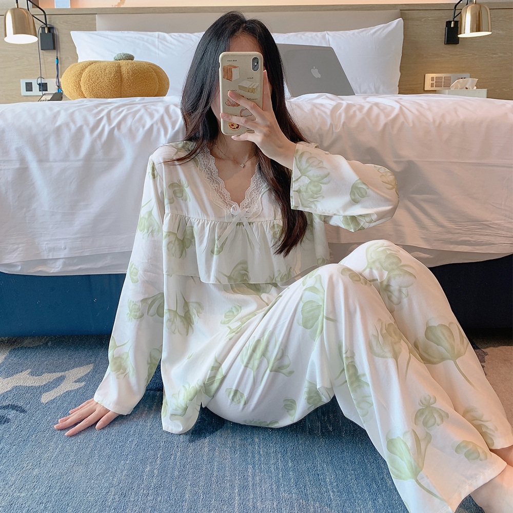 봄과 가을 여성면 실크 파자마 레이스 엣지 프린트 긴팔 바지 투피스 안티 범프 귀여운 얇은 파자마스토어 가기