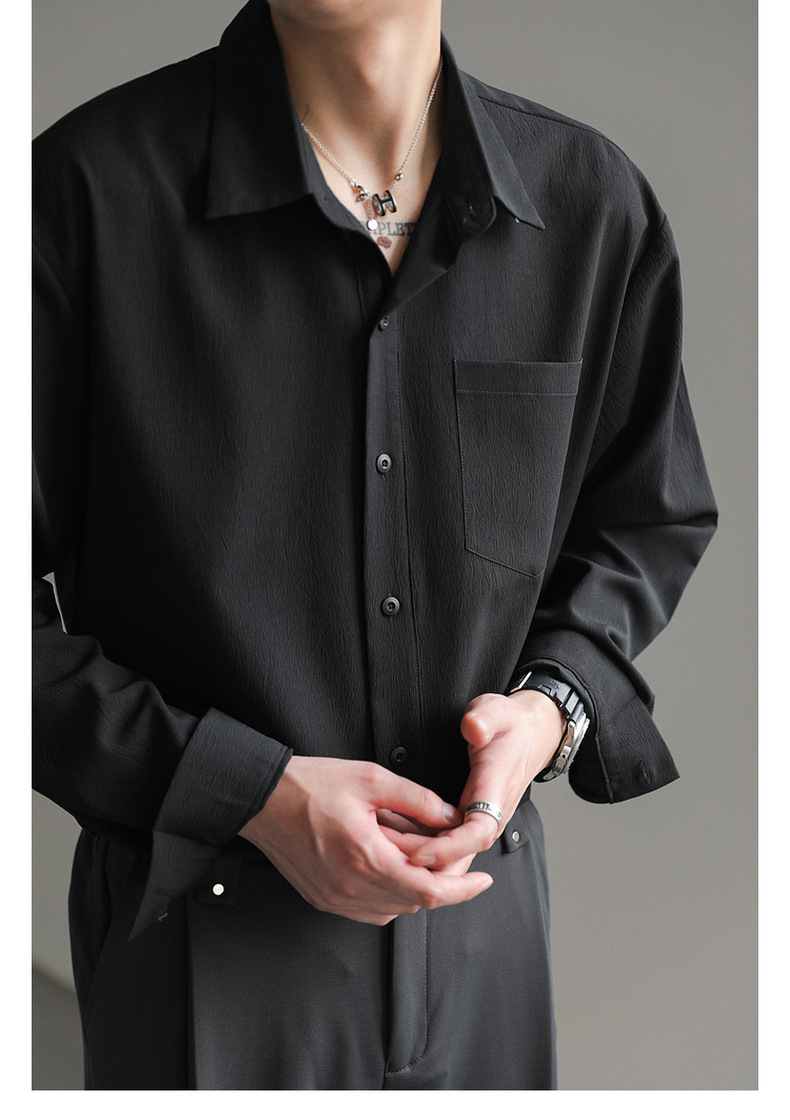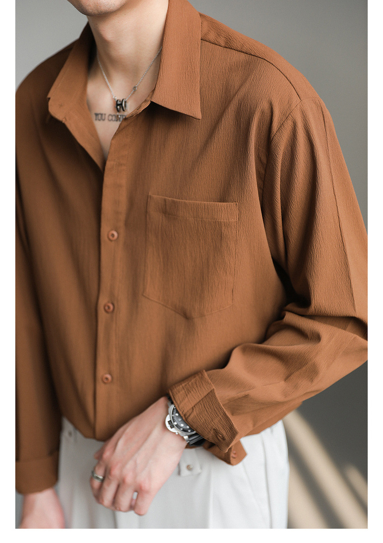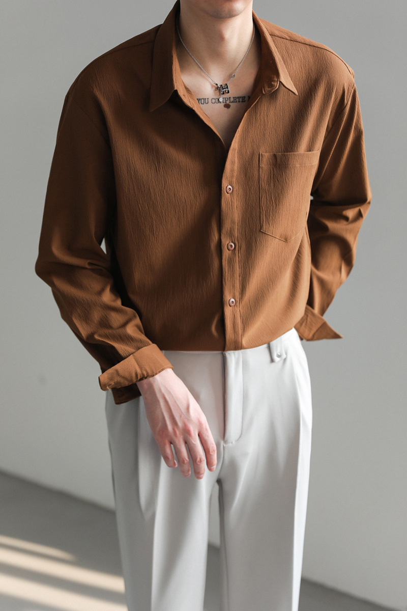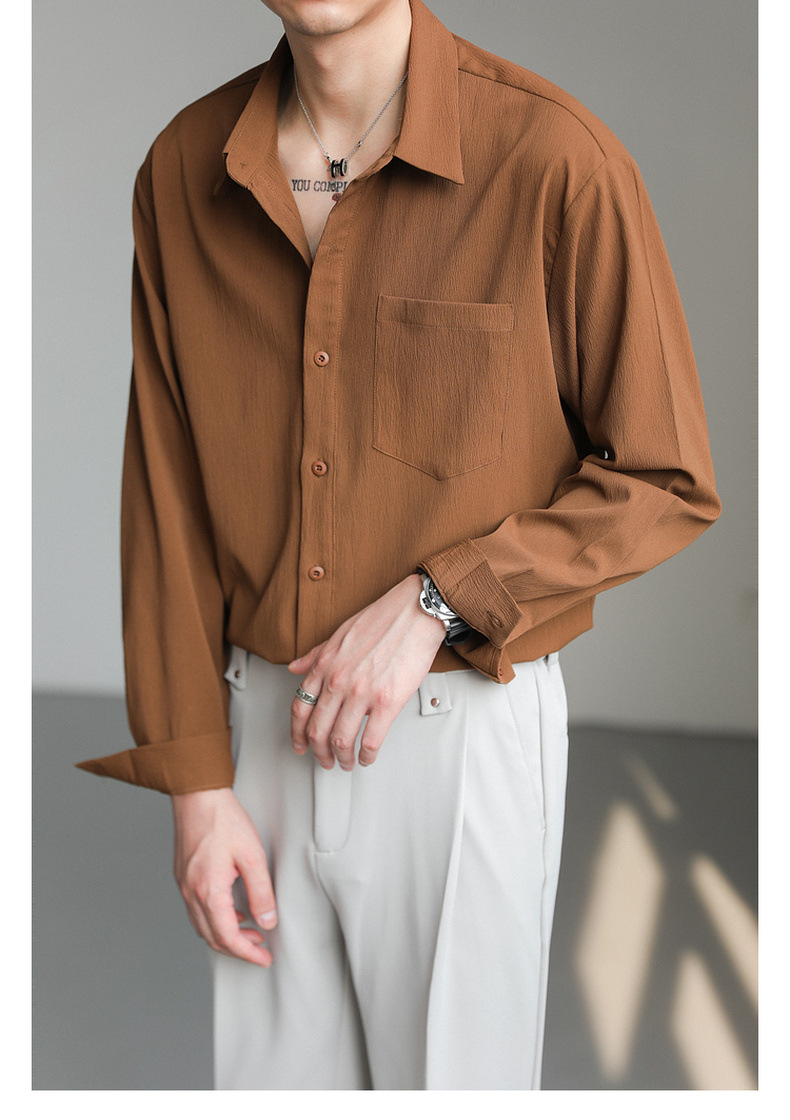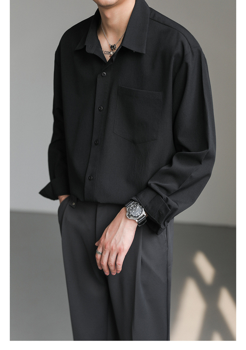 가벼운 성숙한 한국 스타일 유행 잘 생긴 긴팔 셔츠 남자의 느슨한 캐주얼 단색 비 다림질 셔츠 봄과 가을 탑스토어 가기