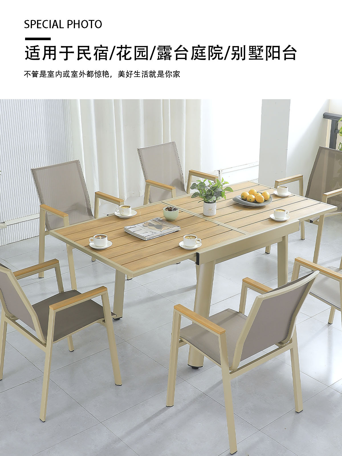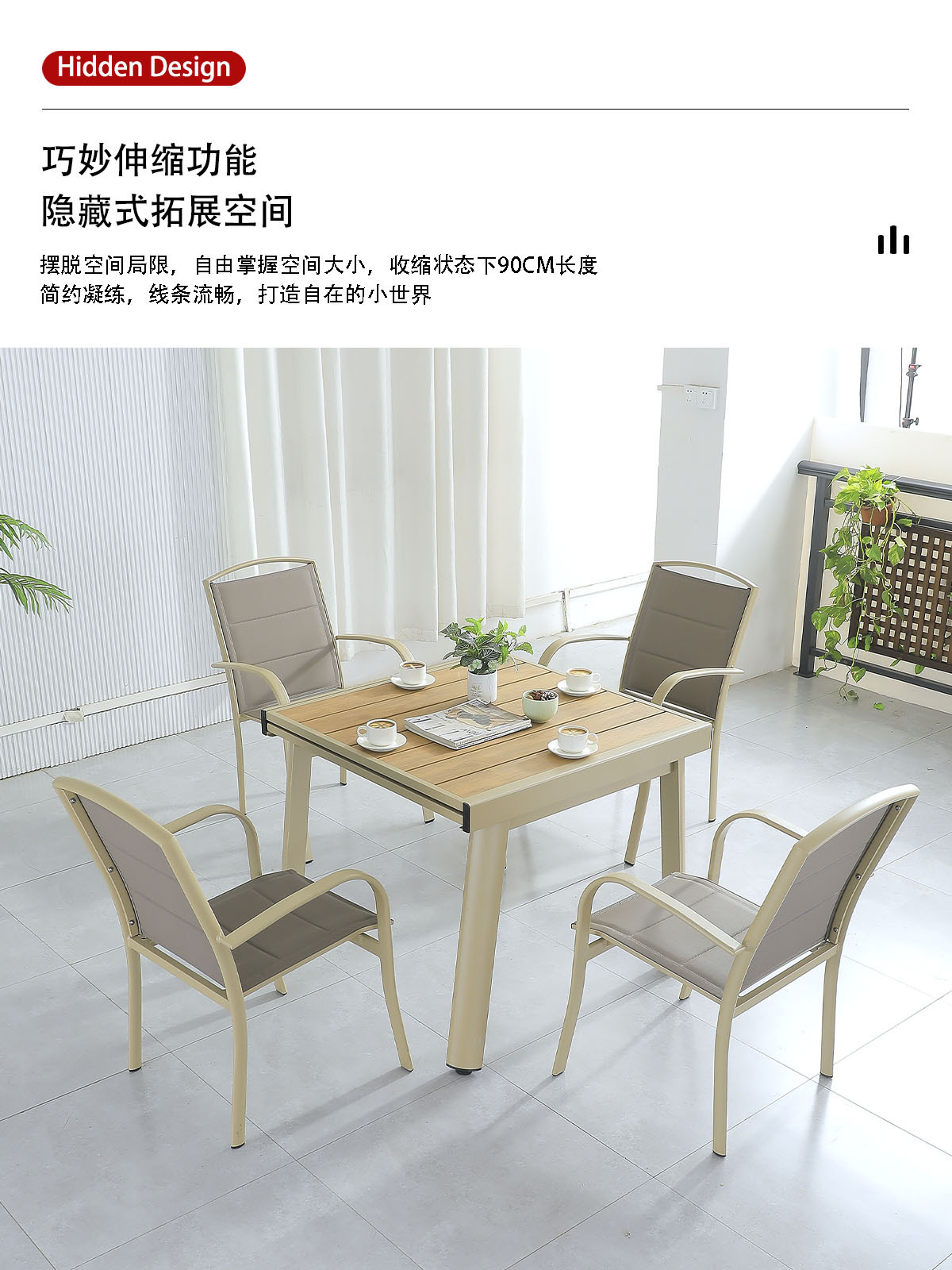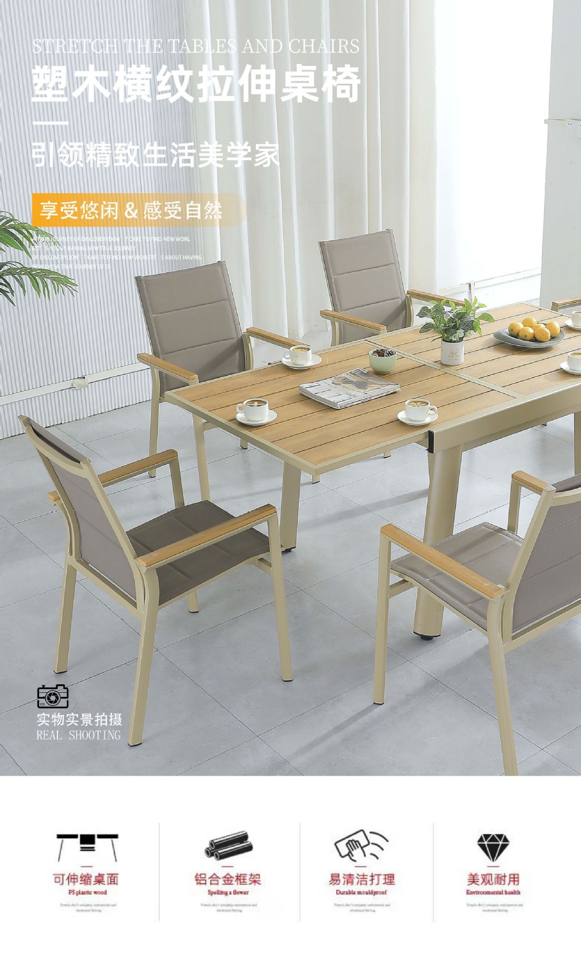 야외 테이블과 의자 안뜰 플라스틱 나무 빛 고급 선샤인 룸 레저 인터넷 유명 야외 야외 방수 자외선 차단제 플라스틱 나무 스트레치 테이블
