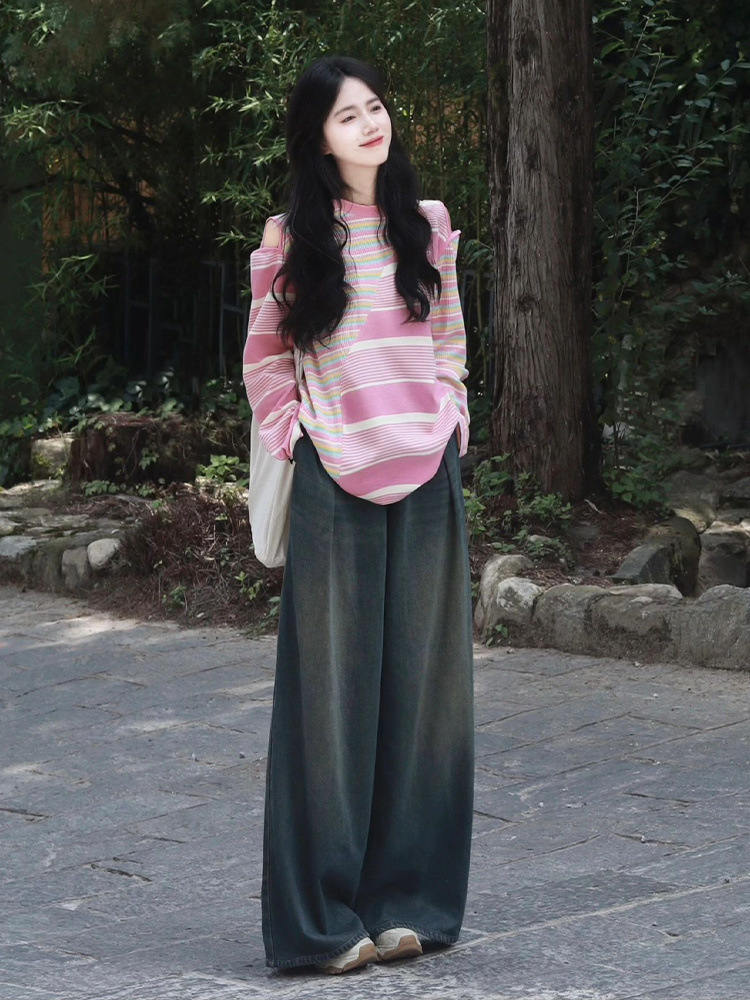 가을 새로운 달콤하고 부드러운 줄무늬 둥근 목 땀 여성용 할로우 오프 숄더 탑 와이드 레그 청바지 투피스 세트스토어 가기