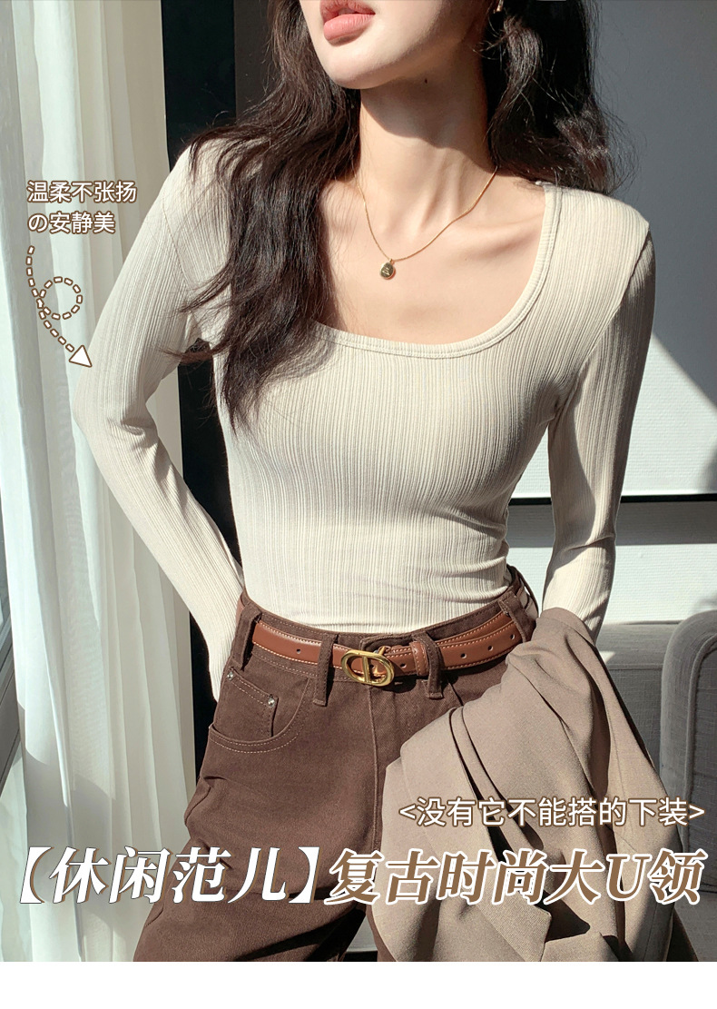 H235 새로운 대형 U 넥 티셔츠 여성 바닥 셔츠 티셔츠 긴팔 탑 로우 넥 내부 슬림 여성 봄 스타일스토어 가기