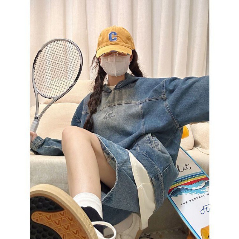 가을 2023 여자 캐주얼 스포츠 작은 얇은 파란색 데님 땀 투피스 세트 세트 착용스토어 가기