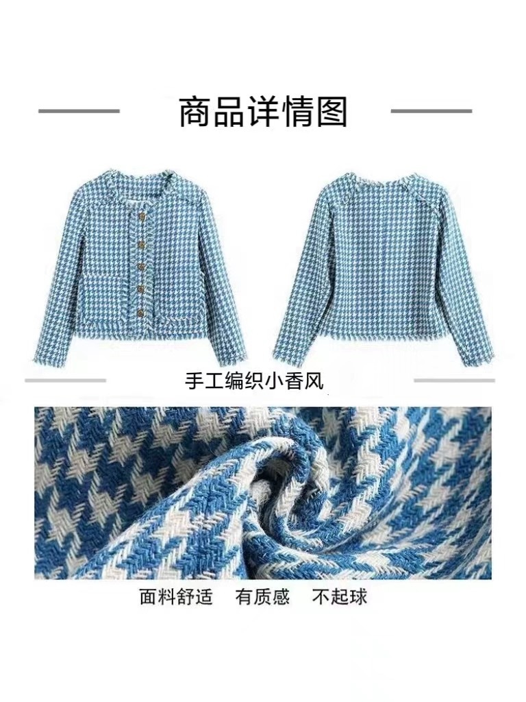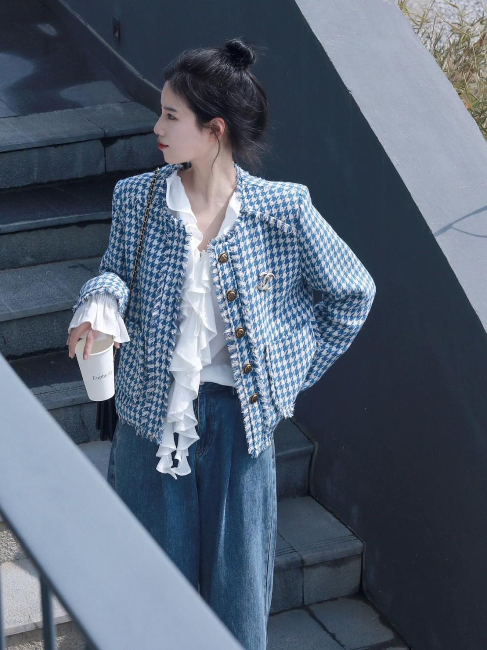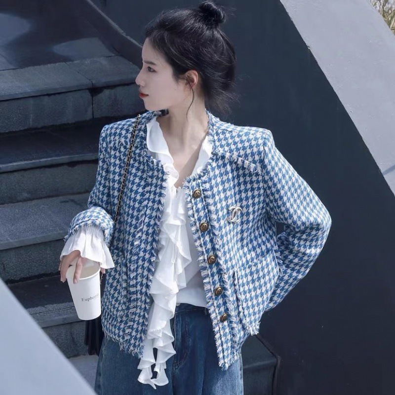샤넬 스타일 코트 여성 2023 새로운 가을과 겨울 스타일 레트로 홍콩 스타일 작은 하이 엔드 하운드 투스 탑