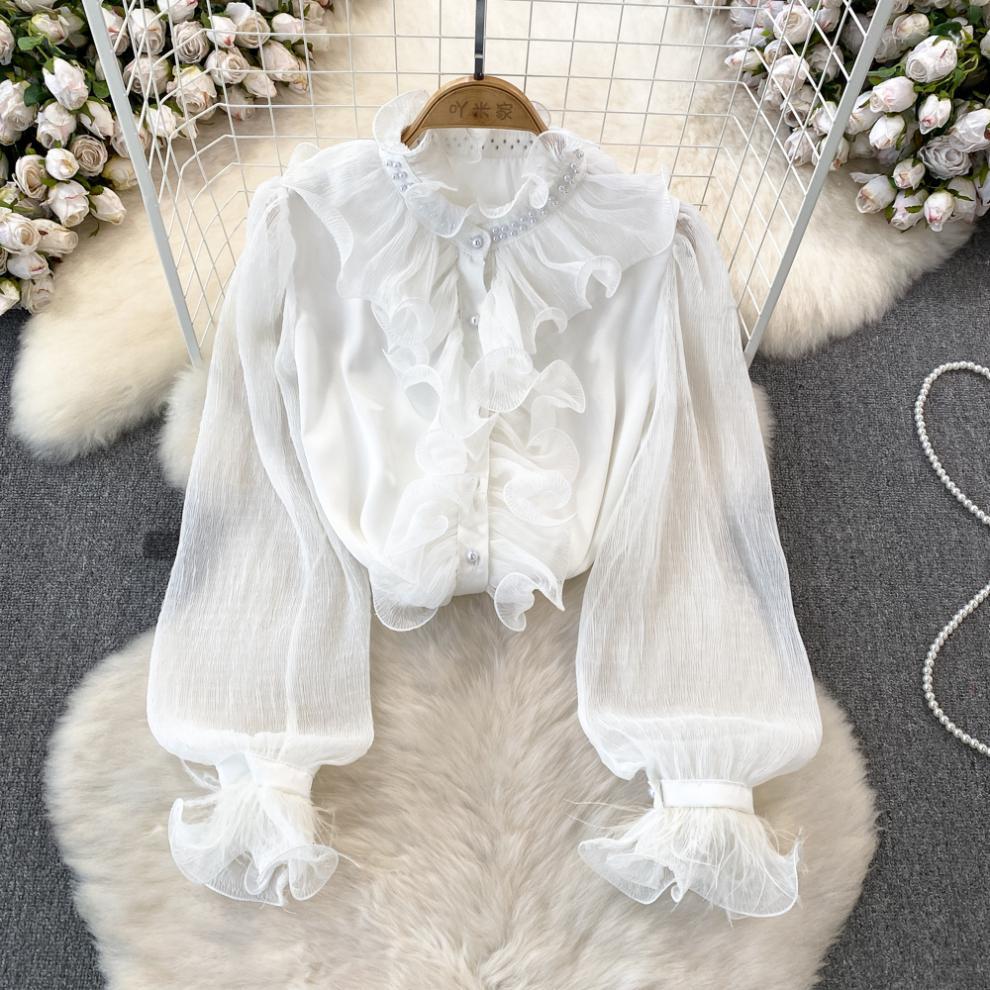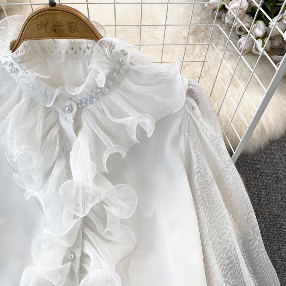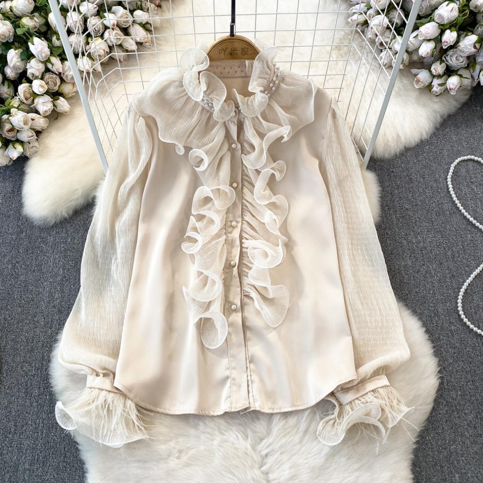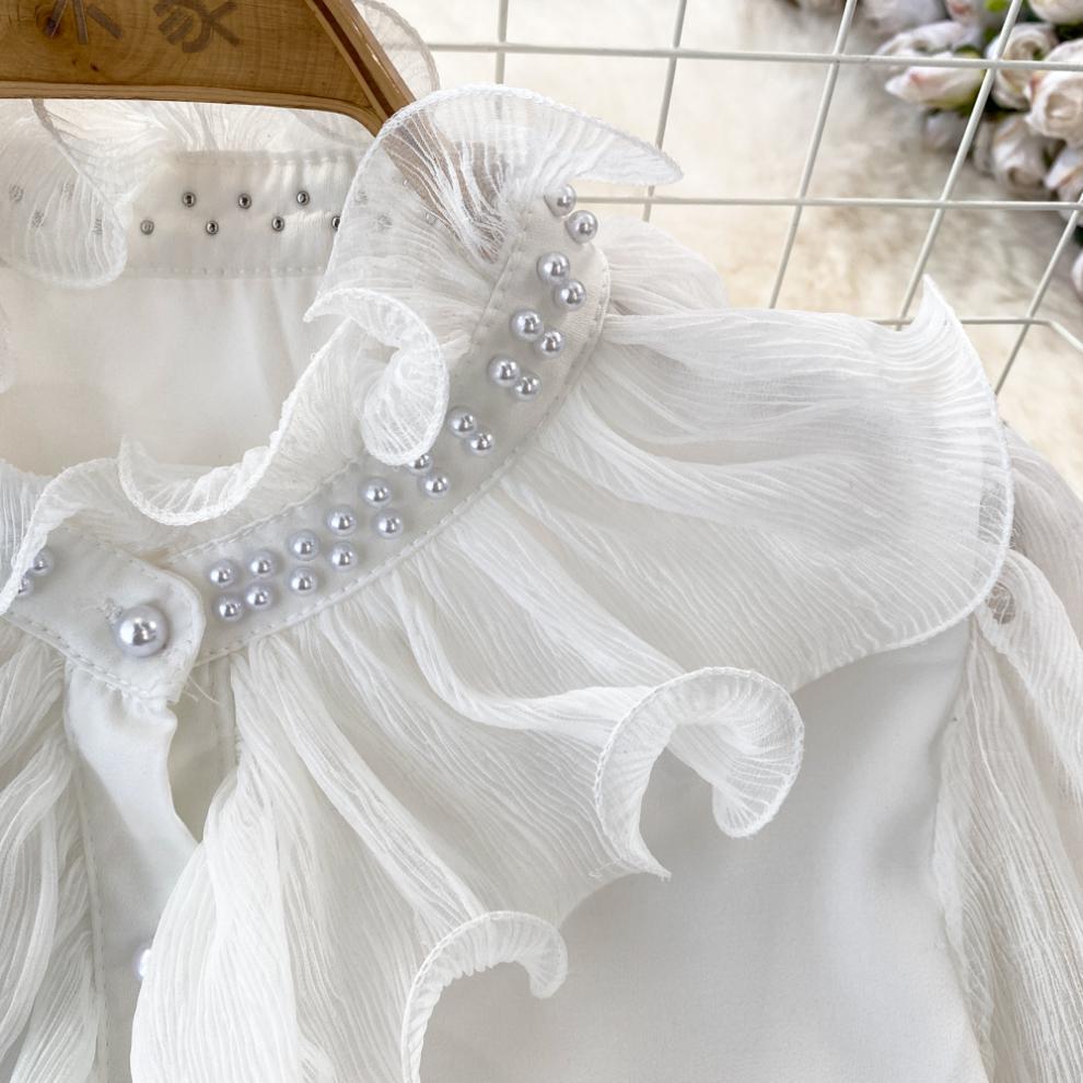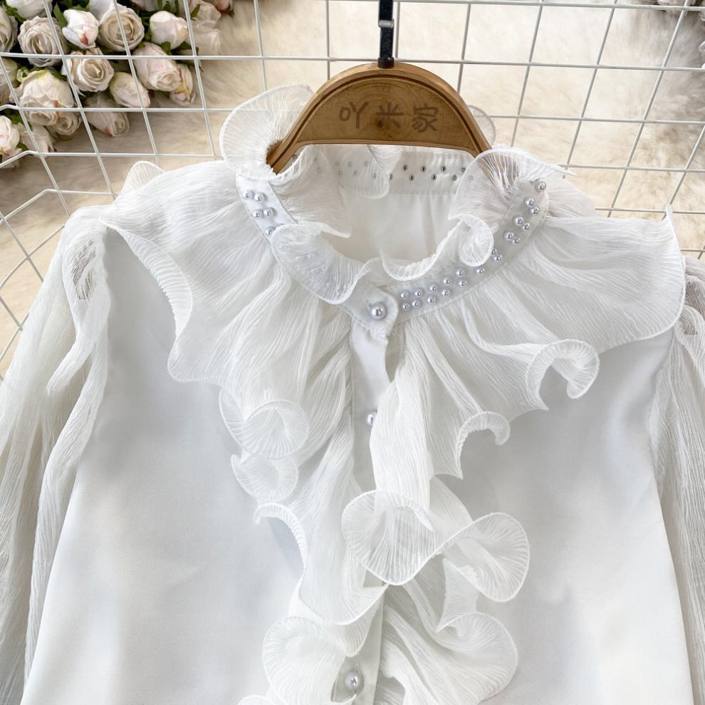 시폰 셔츠 여자 봄과 가을 새로운 한국 스타일 달콤한 칼라 비드 바느질 모든 경기 연령 감소 셔츠 탑