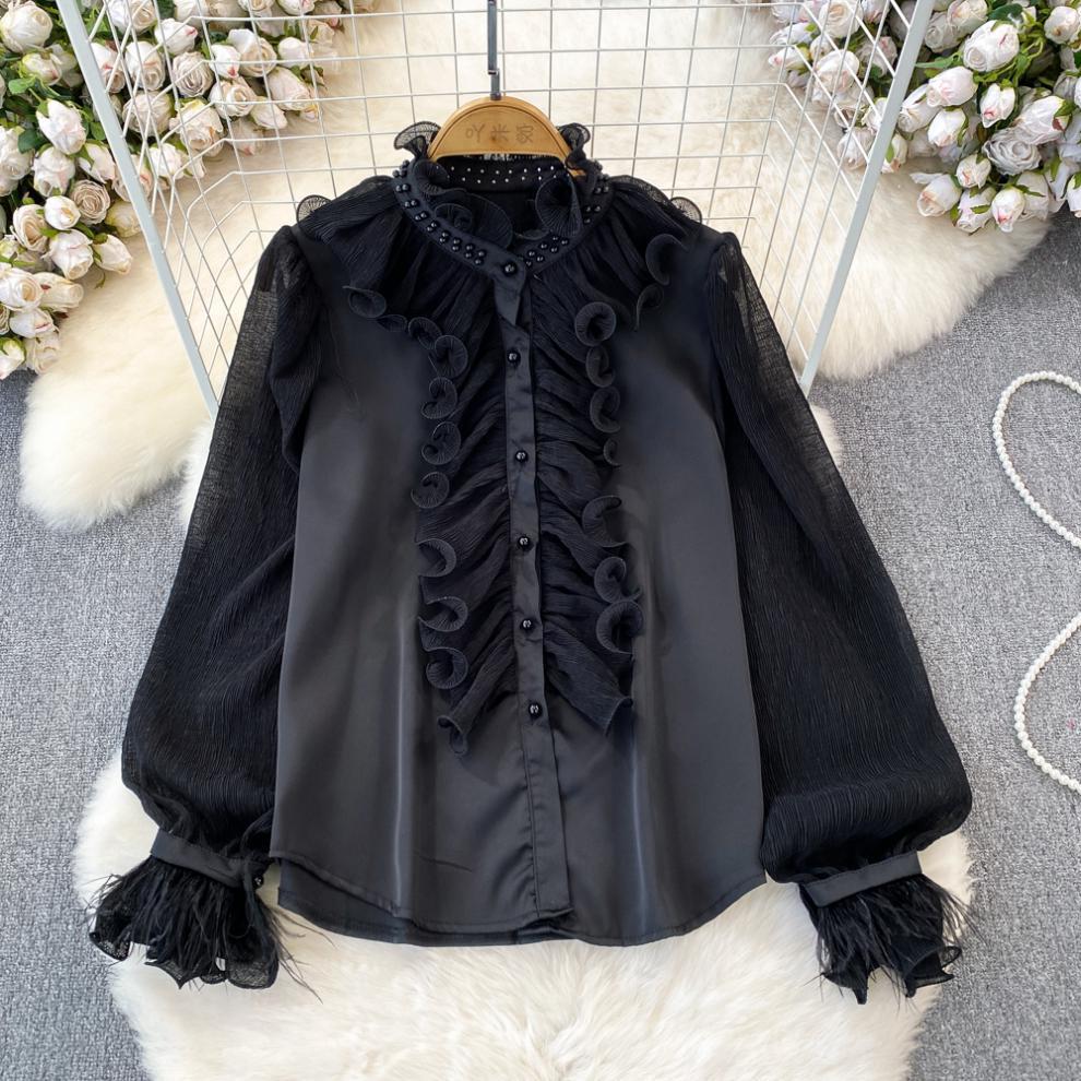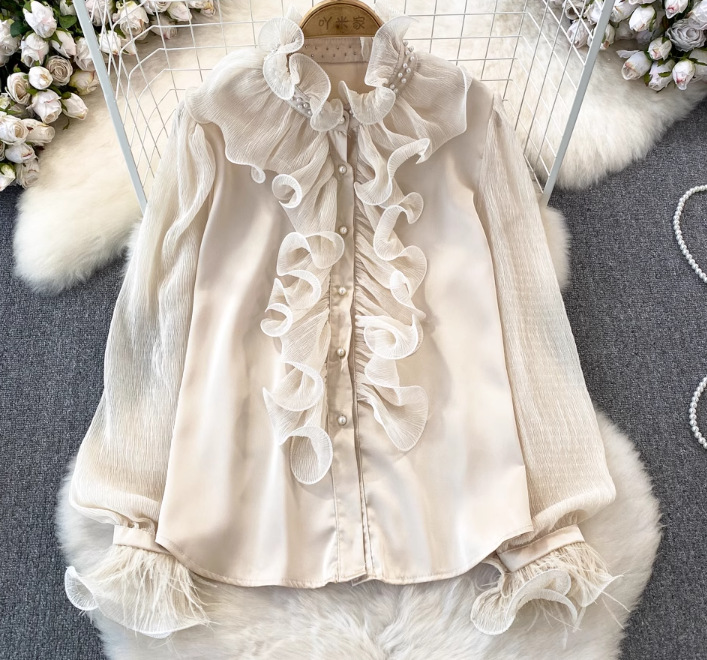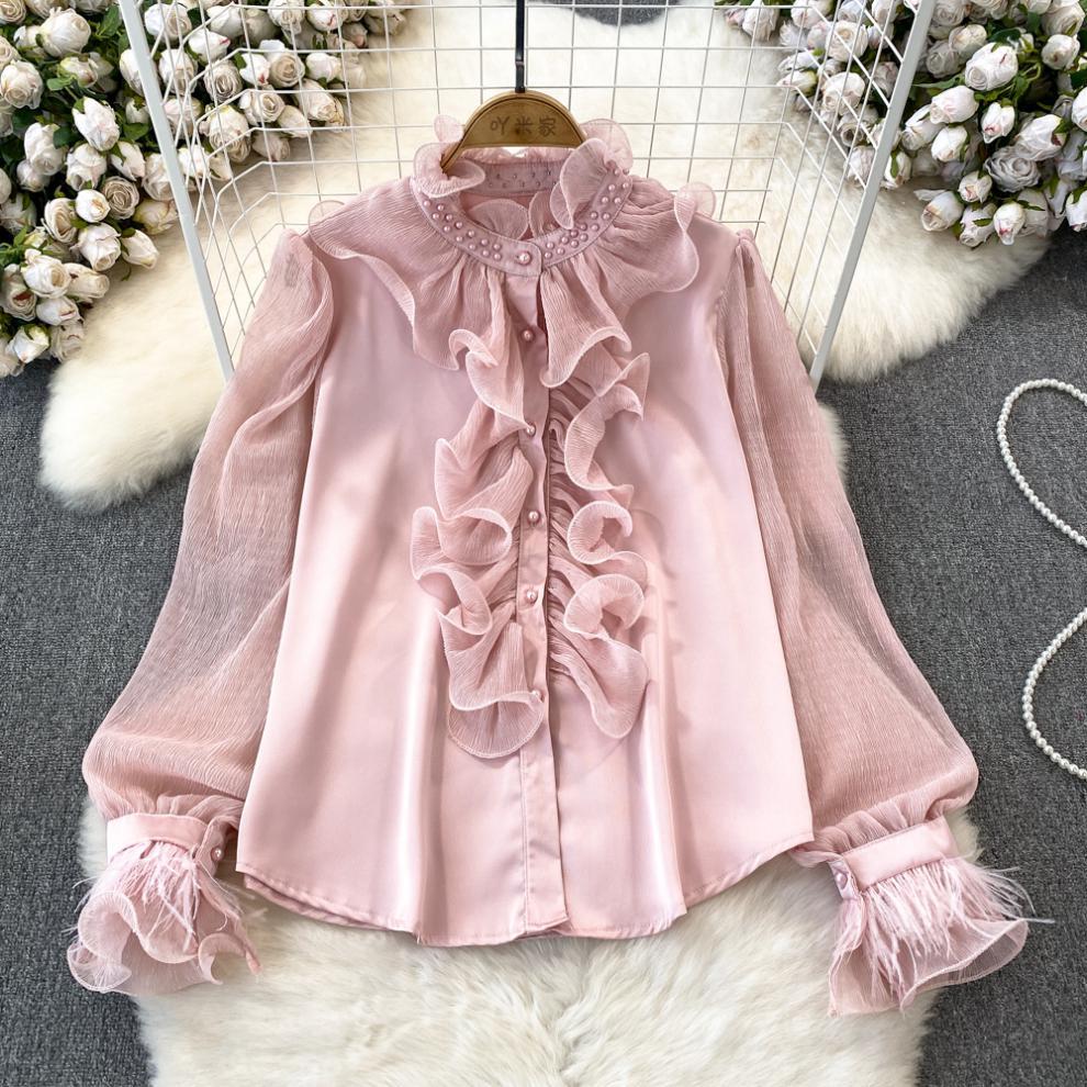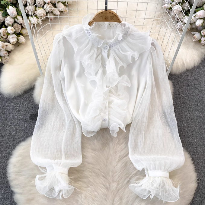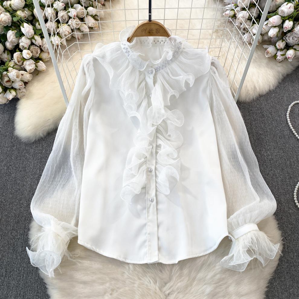 시폰 셔츠 여자 봄과 가을 새로운 한국 스타일 달콤한 칼라 비드 바느질 모든 경기 연령 감소 셔츠 탑