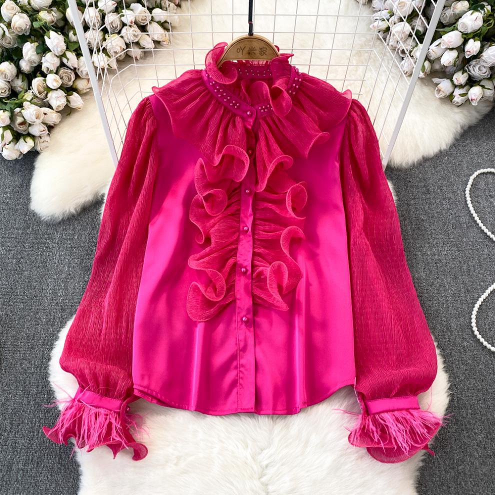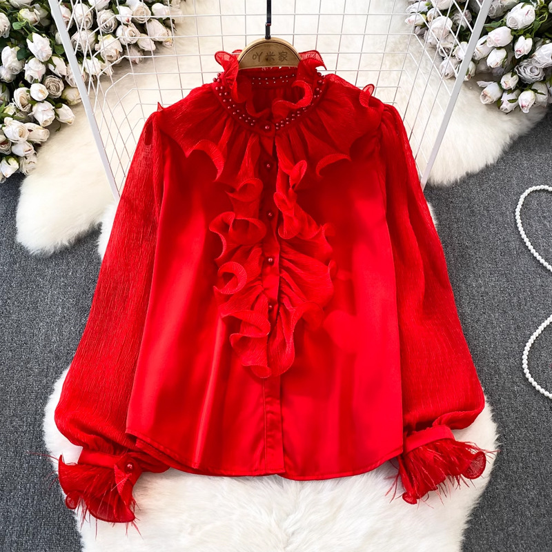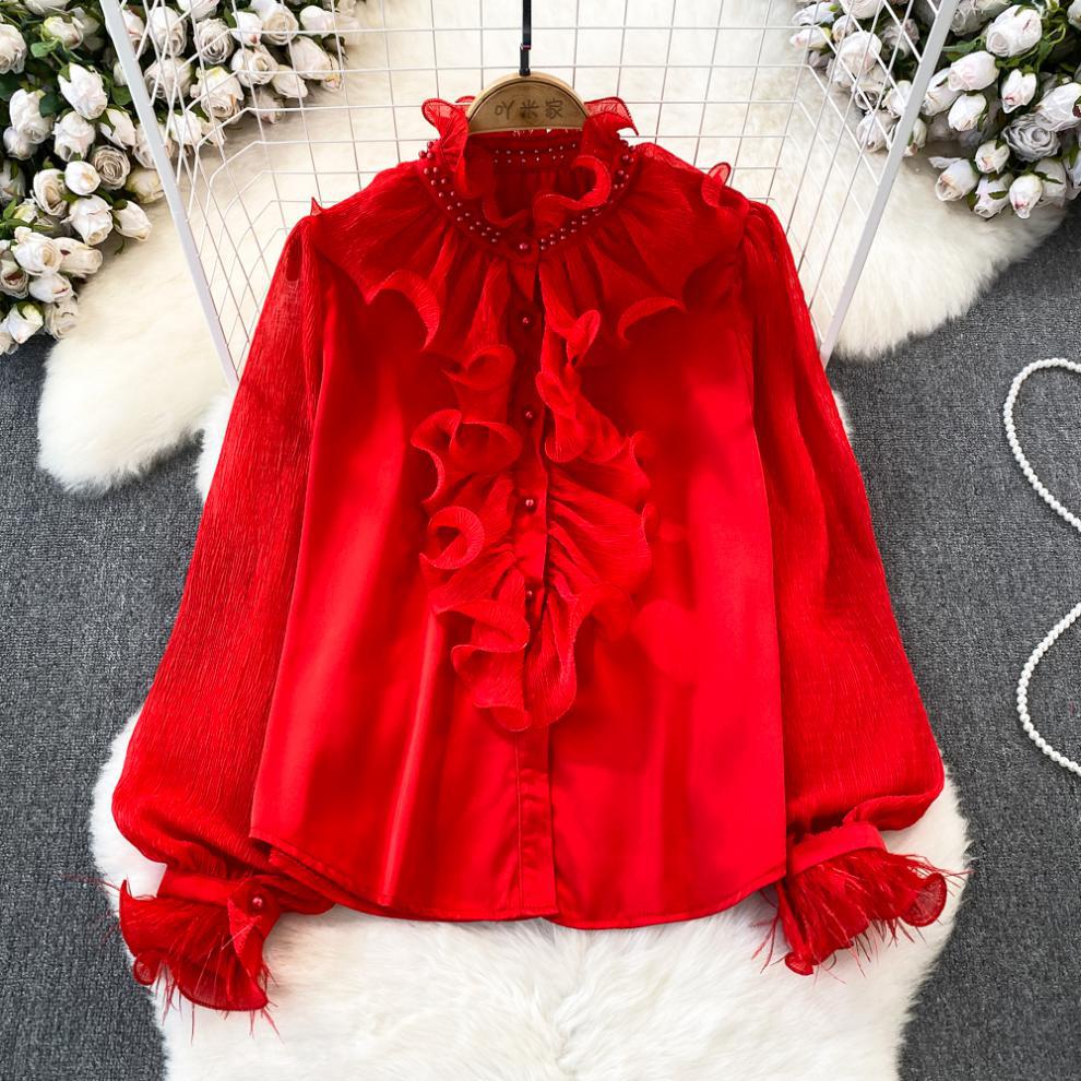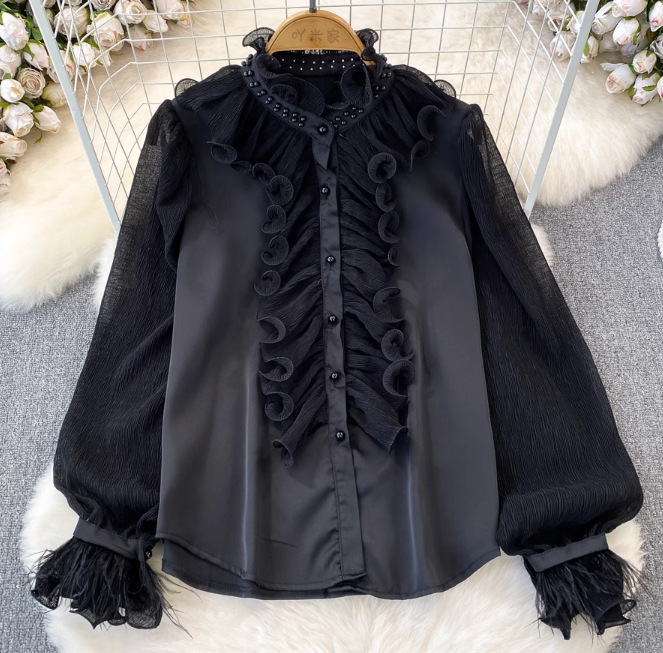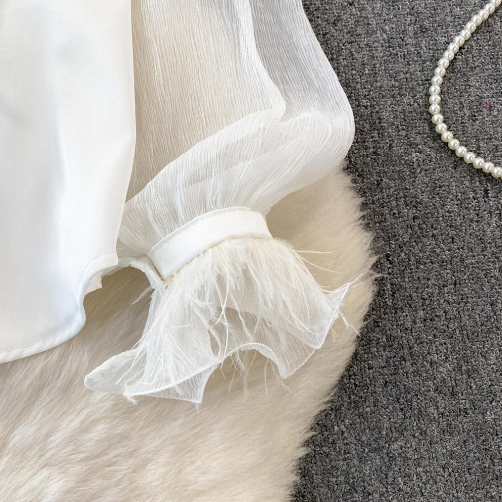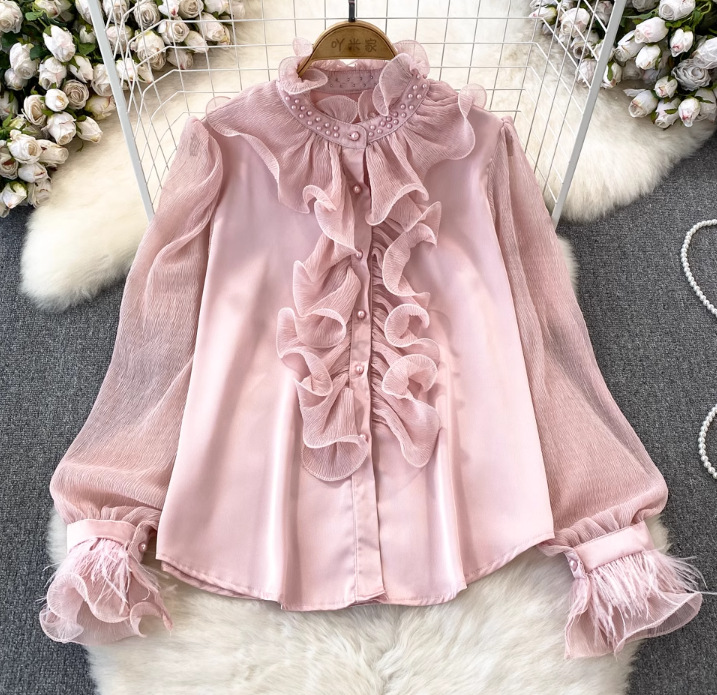 시폰 셔츠 여자 봄과 가을 새로운 한국 스타일 달콤한 칼라 비드 바느질 모든 경기 연령 감소 셔츠 탑