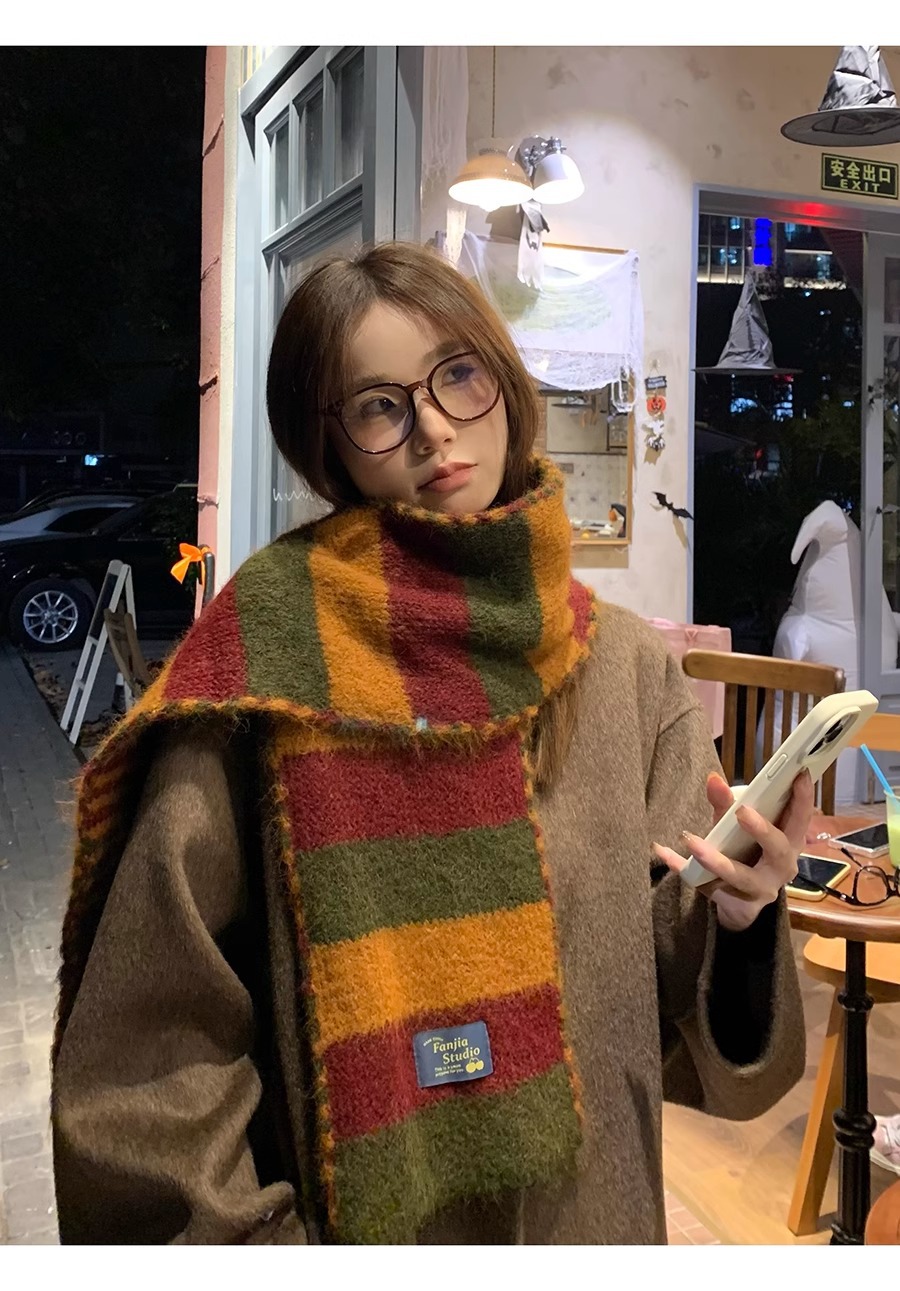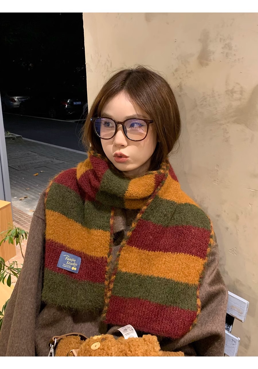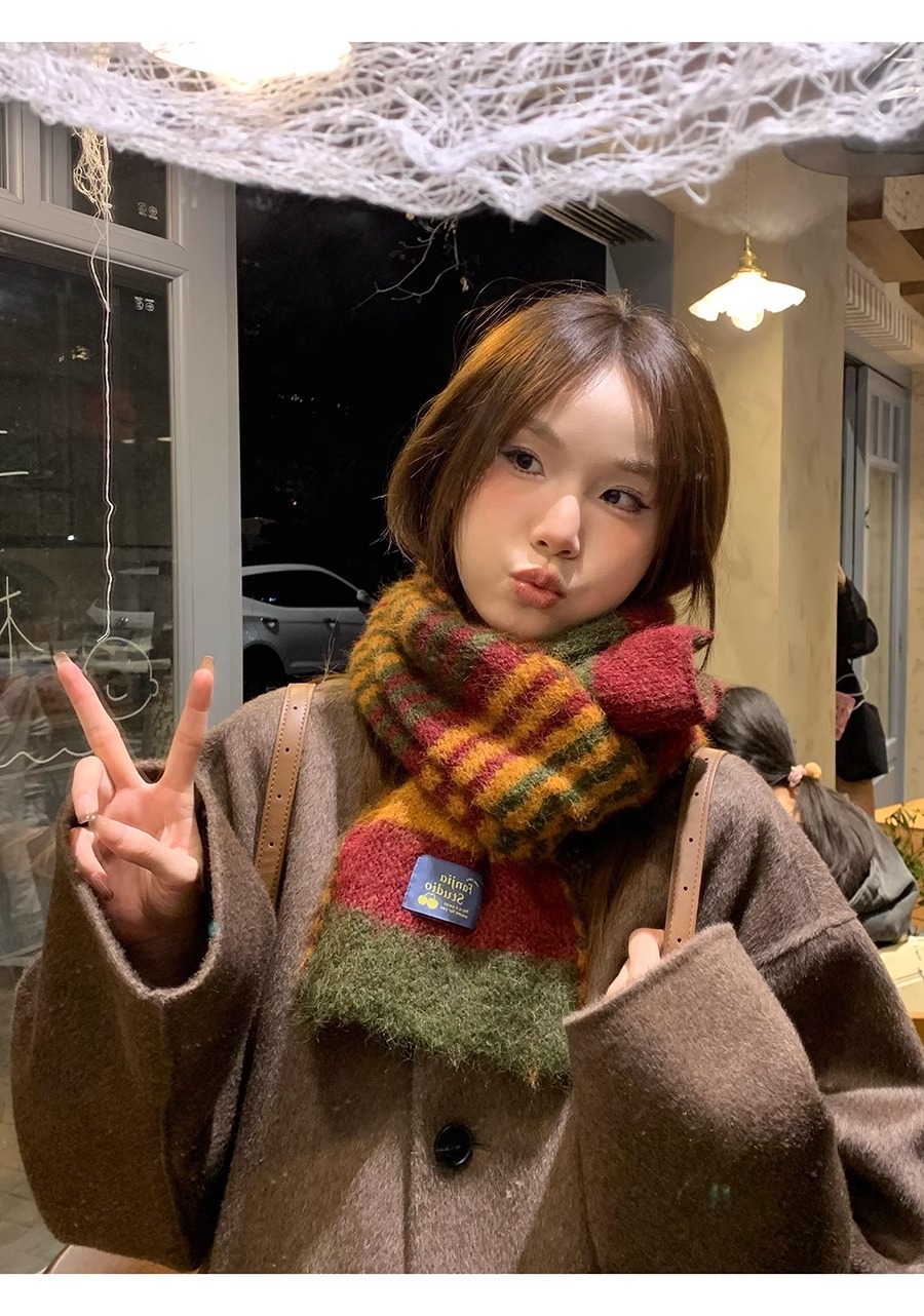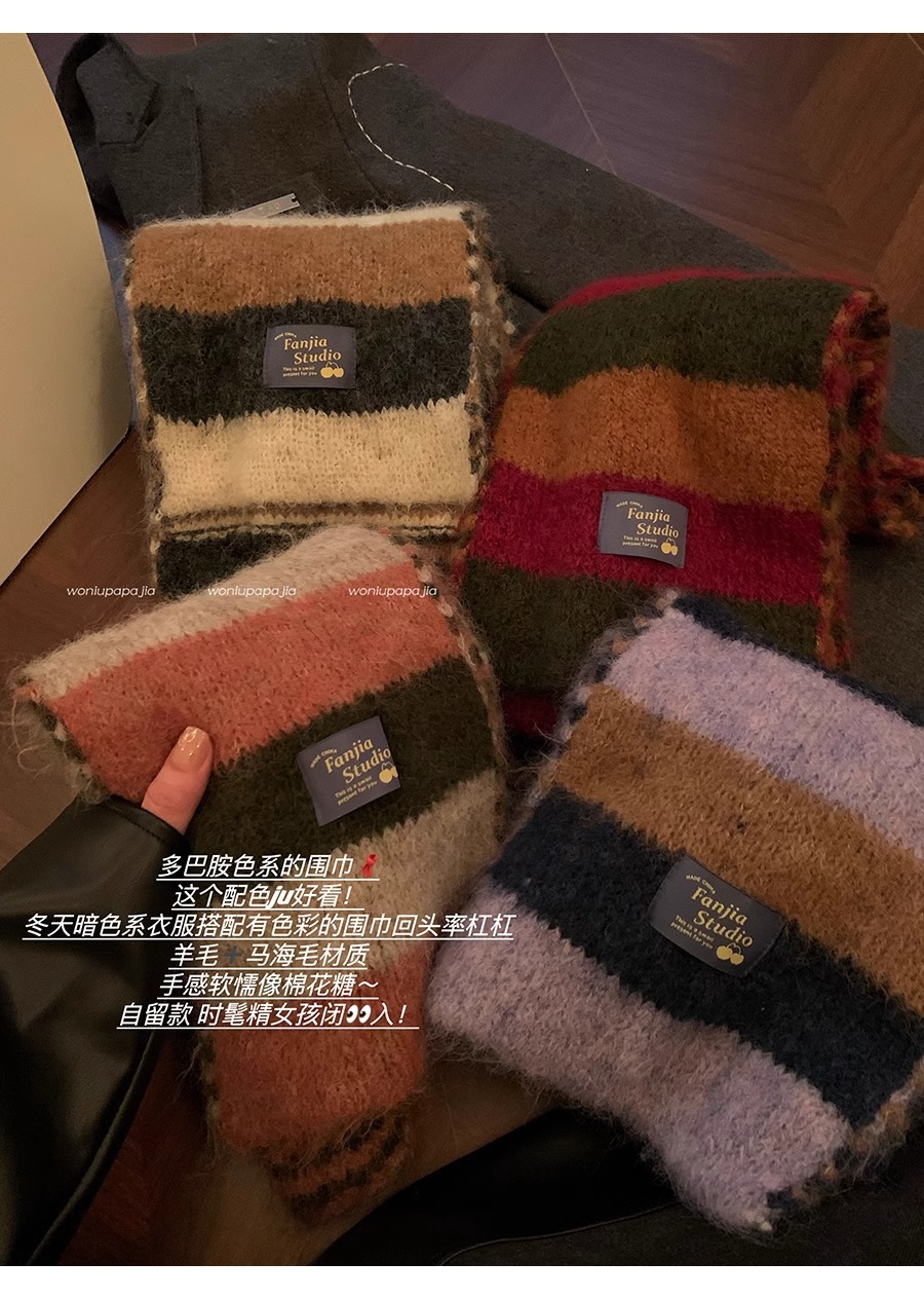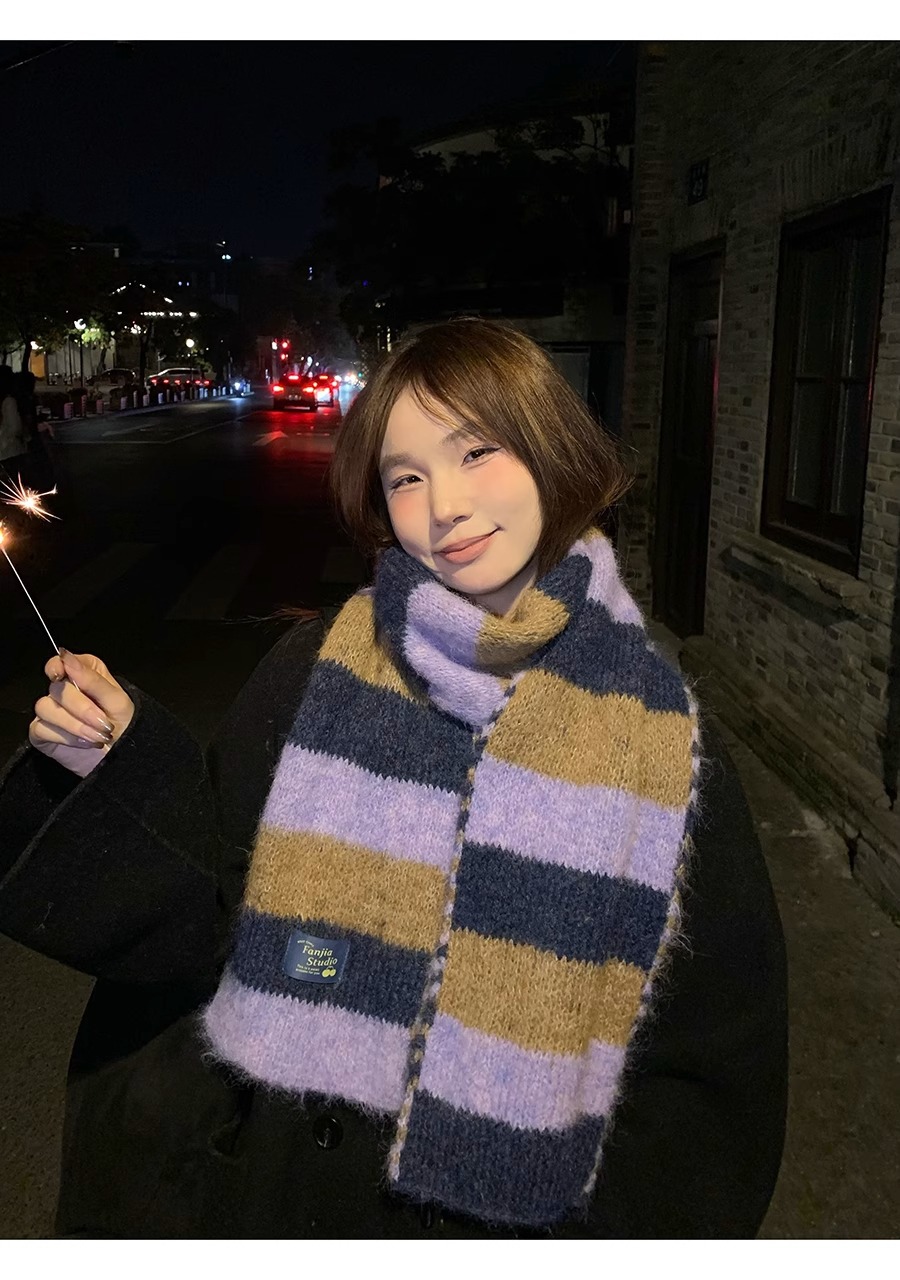 2024 겨울 새로운 여성 도파민 대비 색 스카프 따뜻한 양모 혼합 줄무늬 복고풍 다목적 두꺼운 목도리스토어 가기