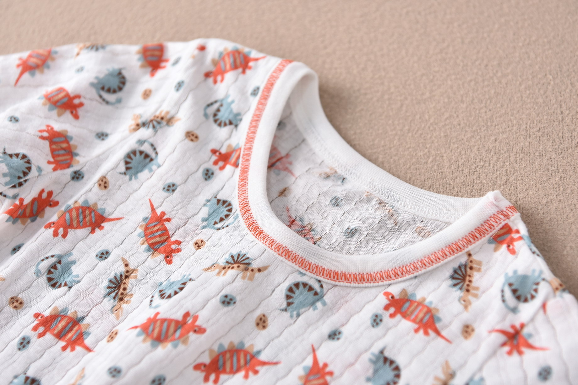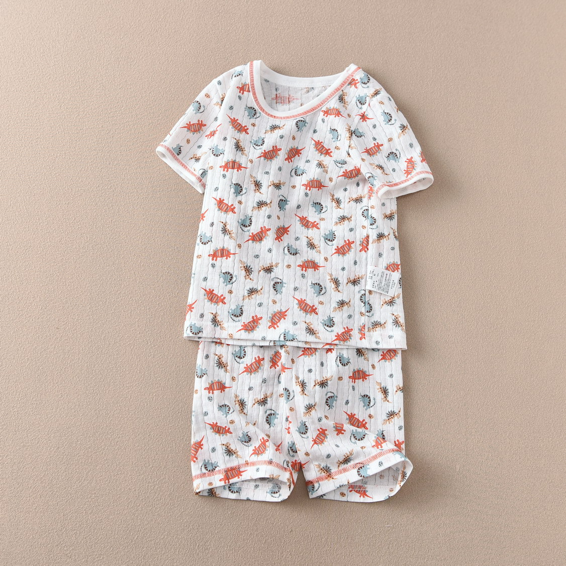 • 수직 줄무늬 짧은 소매 5 점 세트 오렌지 가장자리 전체 인쇄 공룡 (한 세트)