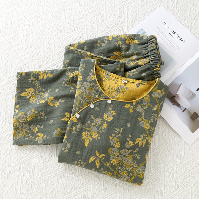 봄 가을 중국풍 여성 잠옷 순면 색직물 거즈 잠옷 9부 소매 사선 여밈 홈웨어 세트 외출복 가능