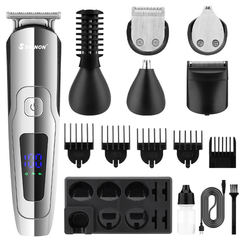 产品清单:主机+理发刀头+精修刀头+雕刻刀头+鼻毛修建刀头+剃须刀头+修眉刀头+限位梳*4(3.6.9.12mm)+精修刀头限位梳+收纳盒+清洁刷+USB充电线+英文说明书.