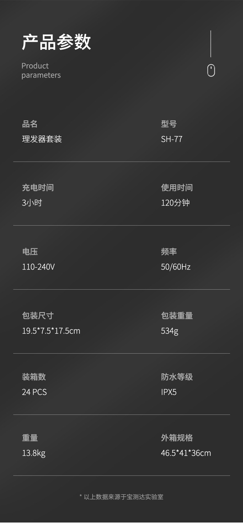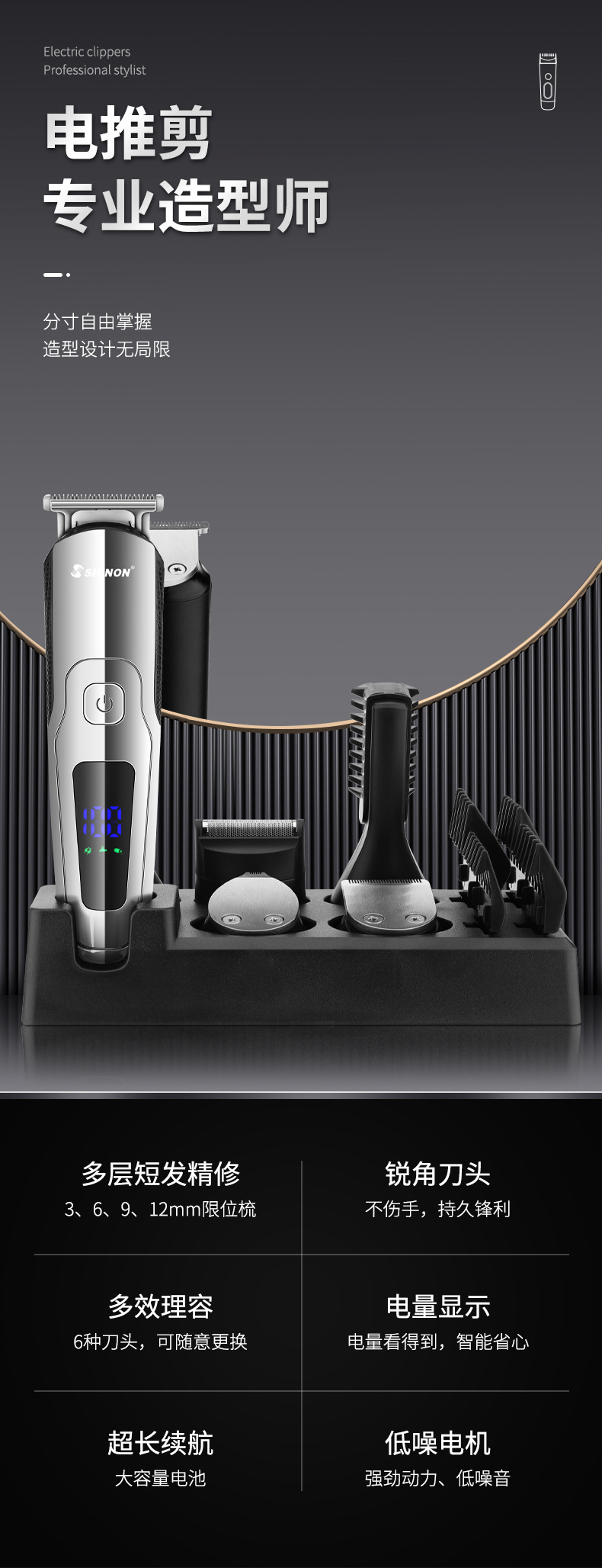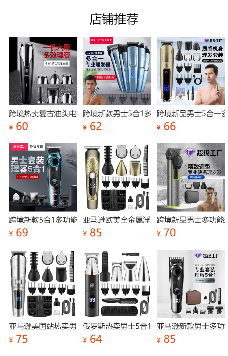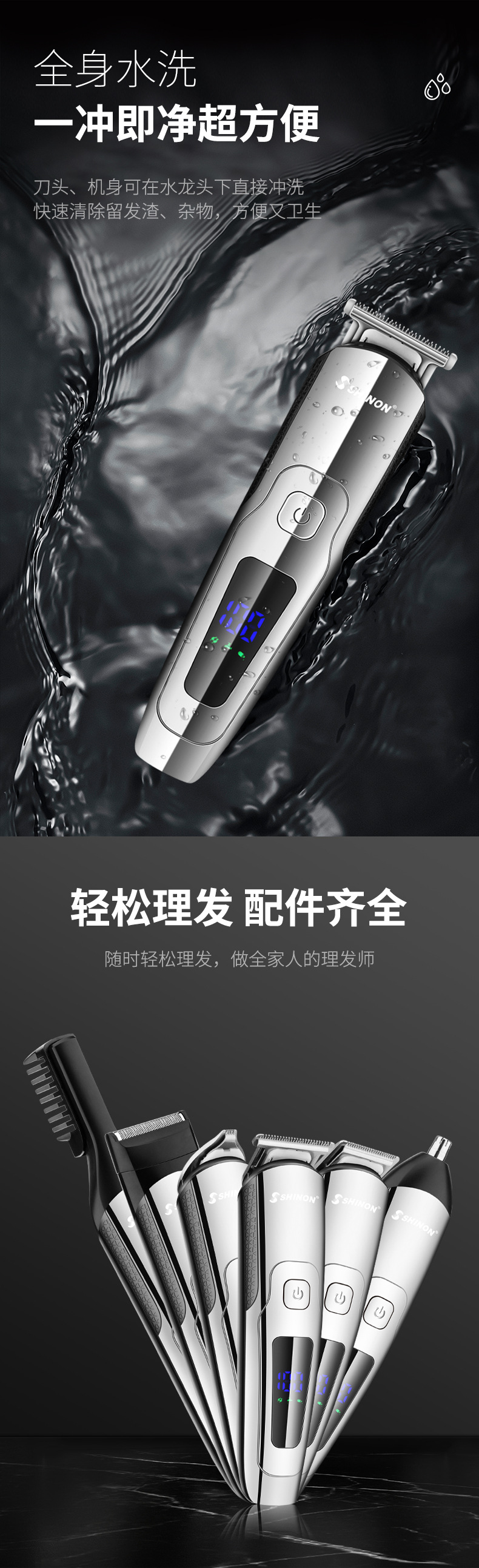 产品特点:机身全身水洗、6合1换头电推剪