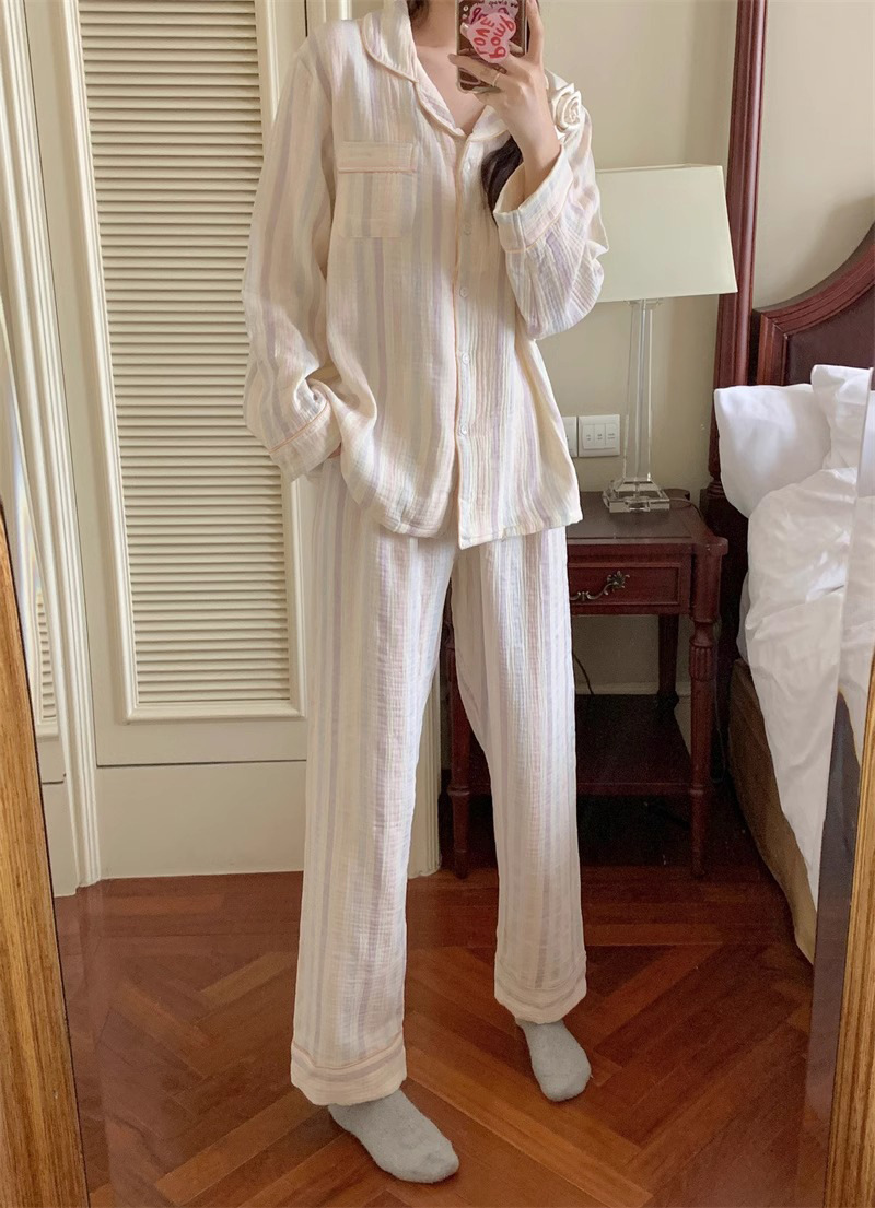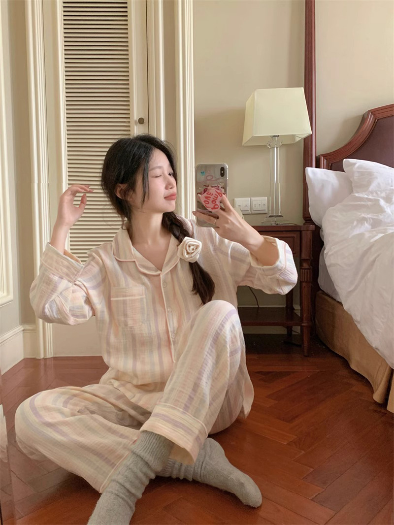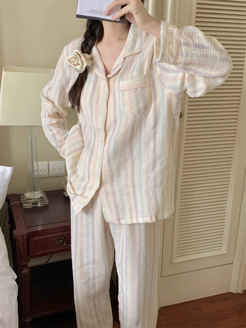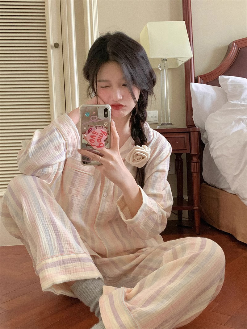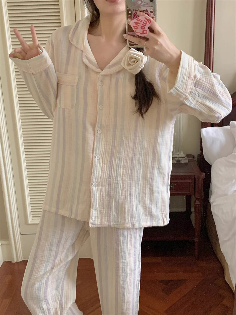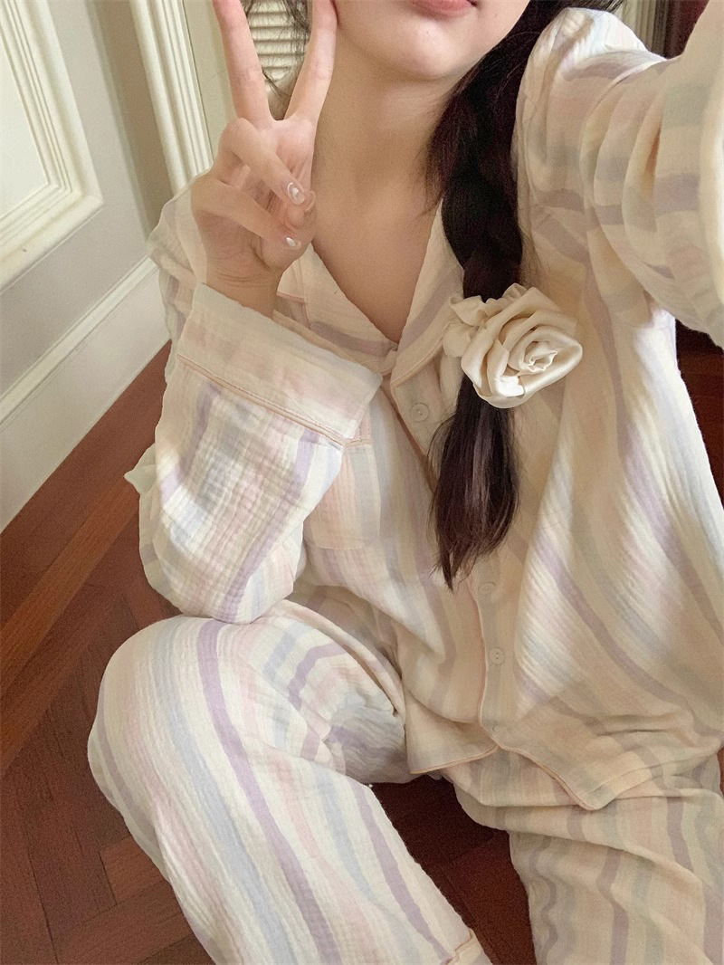 일본 복고풍 무지개 줄무늬 간단한 잠옷 봄과 가을 긴 소매 세트 달콤한 얇은 소녀의 가정복 세트스토어 가기
