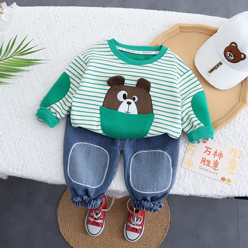 2024 봄 새 소년 만화 줄무늬 둥근 목 긴 소매 세트 소년 캐주얼 데님 바지 투피스 세트스토어 가기