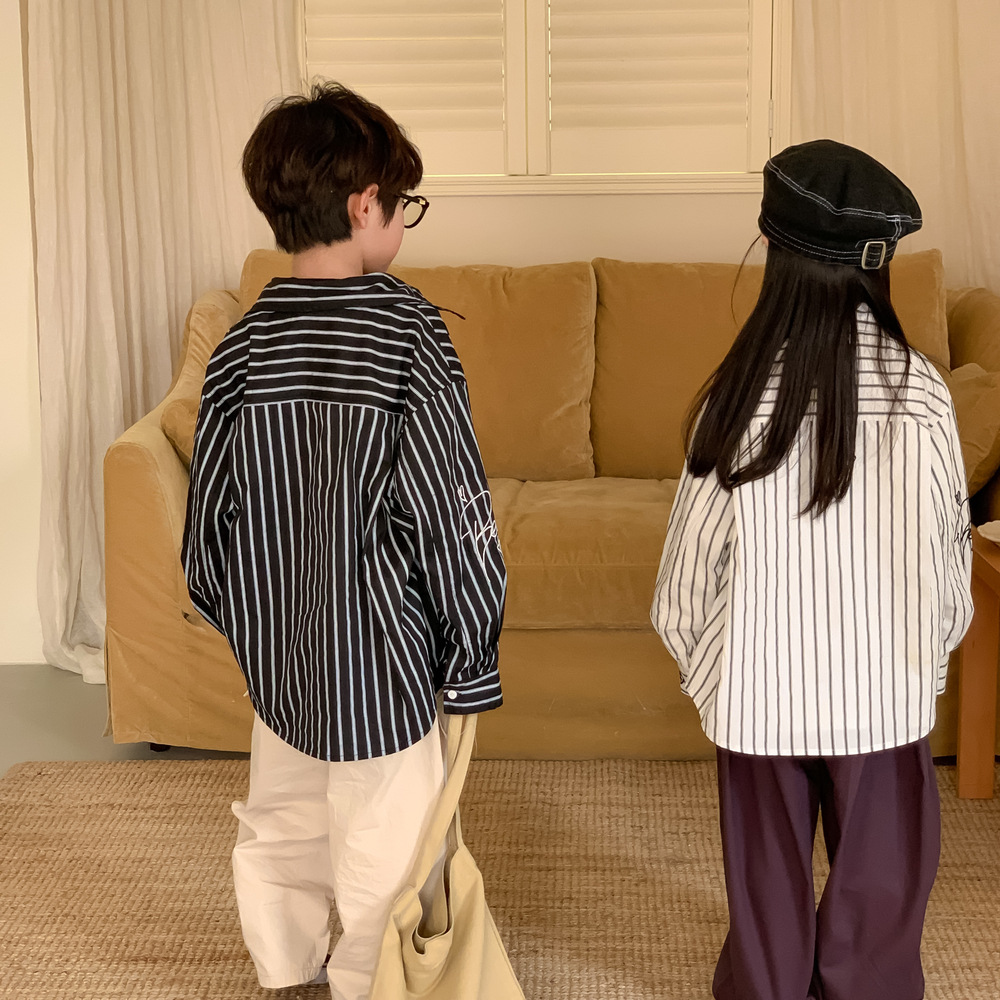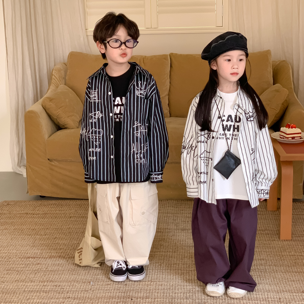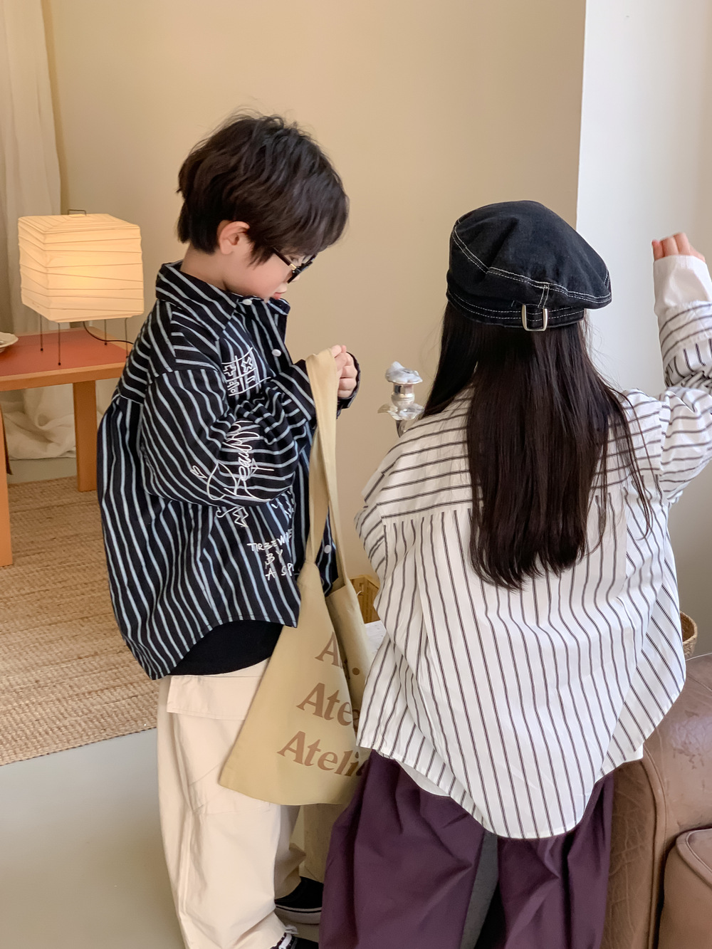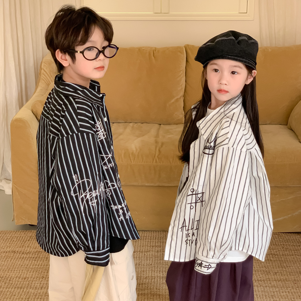 아동용 셔츠 2024 가을 한국 스타일 옷깃 스트라이프 셔츠 소년 소녀용, 아동용 캐주얼 루즈 다용도 레터 탑스토어 가기