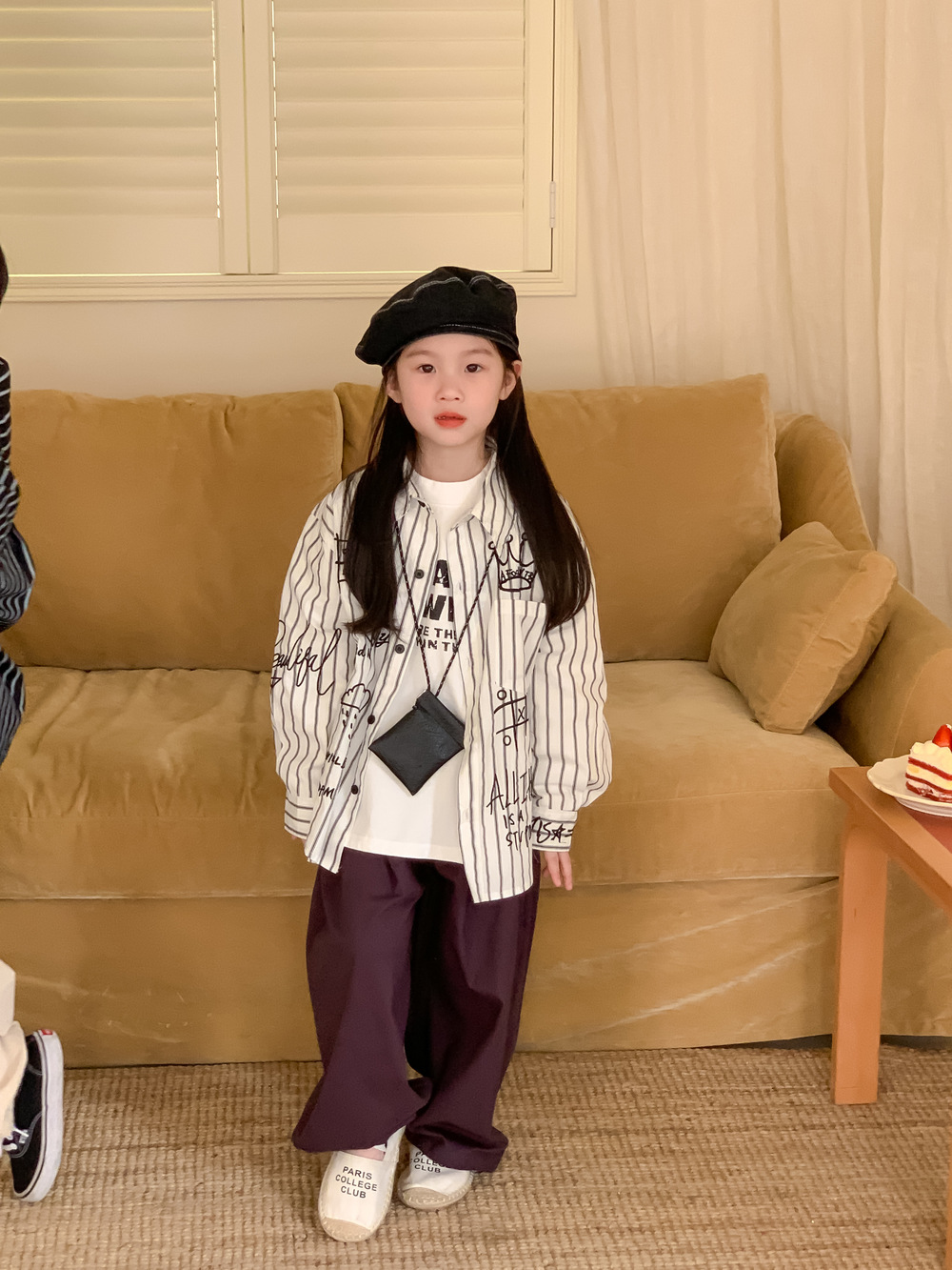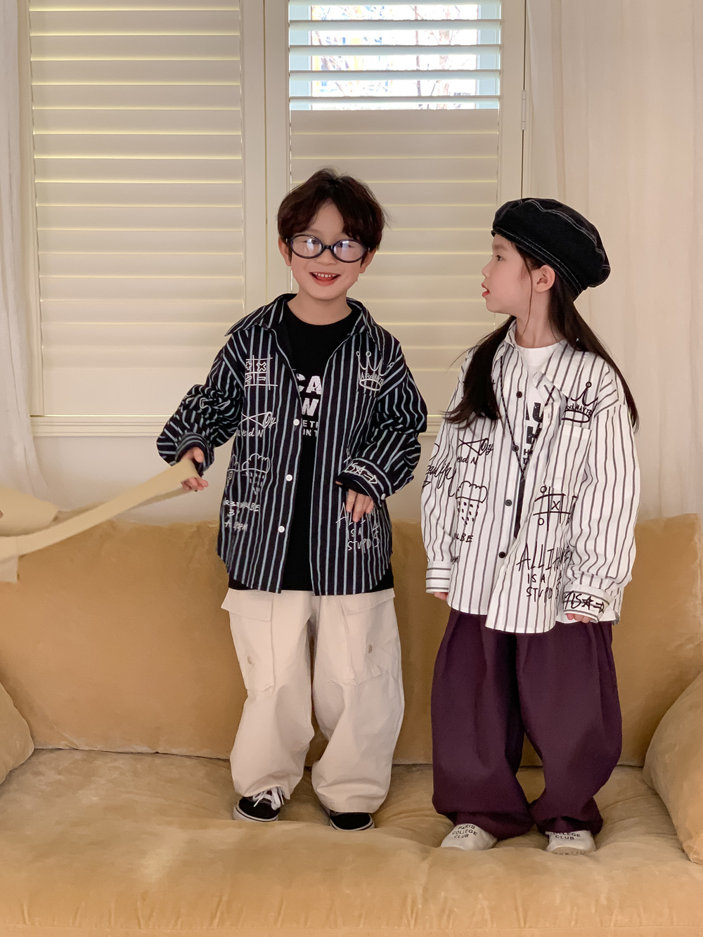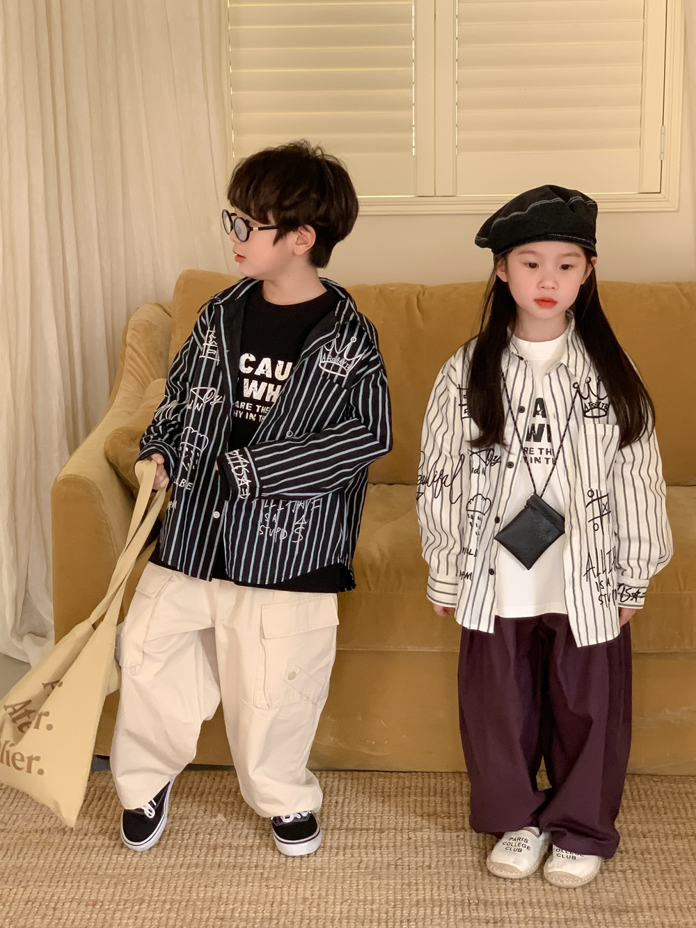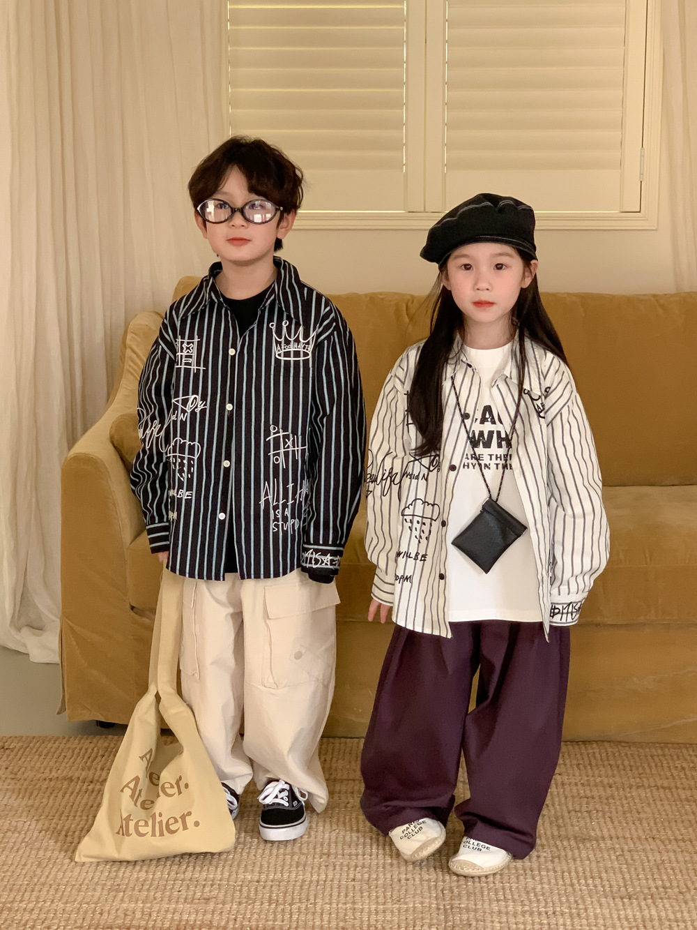 아동용 셔츠 2024 가을 한국 스타일 옷깃 스트라이프 셔츠 소년 소녀용, 아동용 캐주얼 루즈 다용도 레터 탑스토어 가기