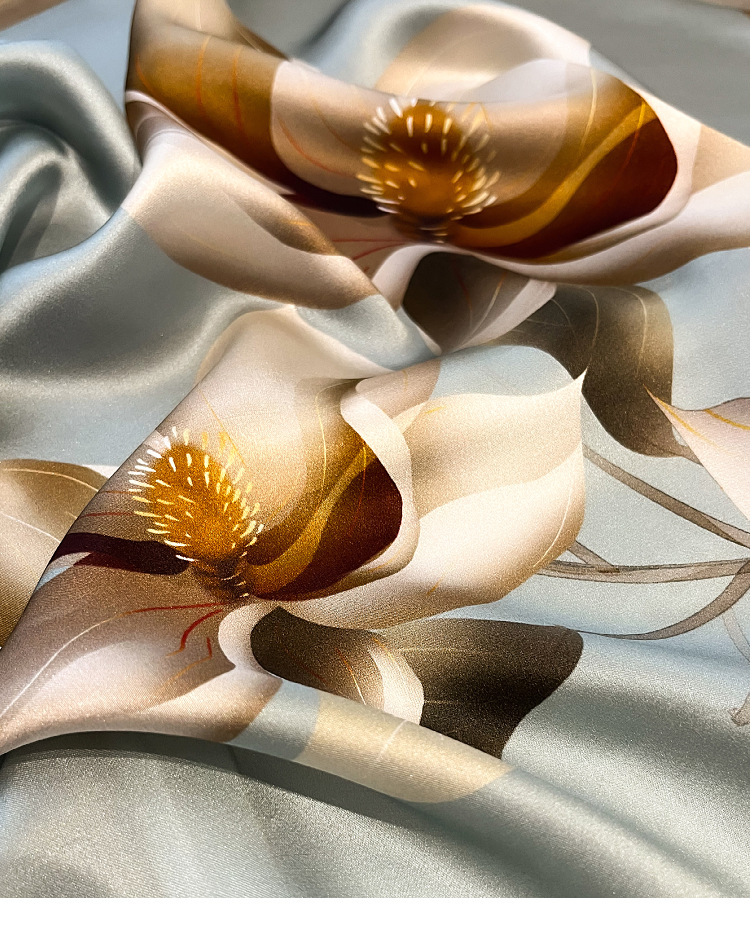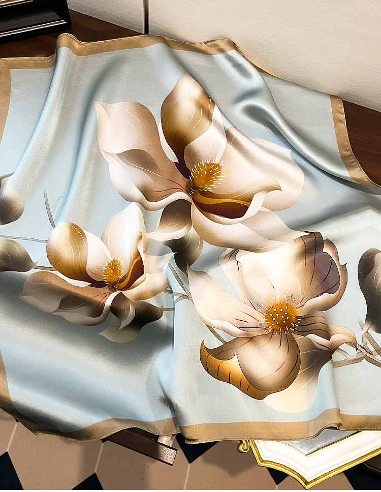 여성을위한 고급 실크 스카프 봄 새로운 우아한 가벼운 고급 멀 베리 실크 스카프 목련 인쇄 53 작은 사각형 스카프