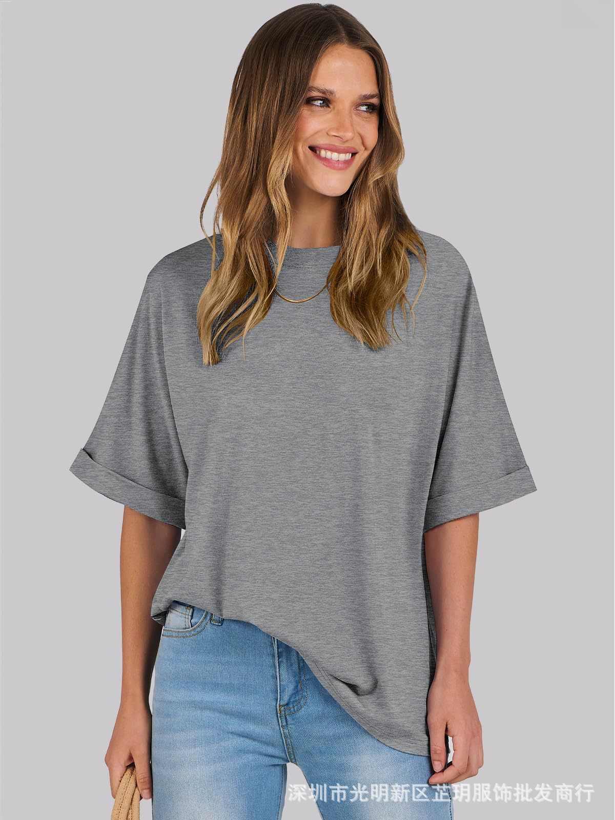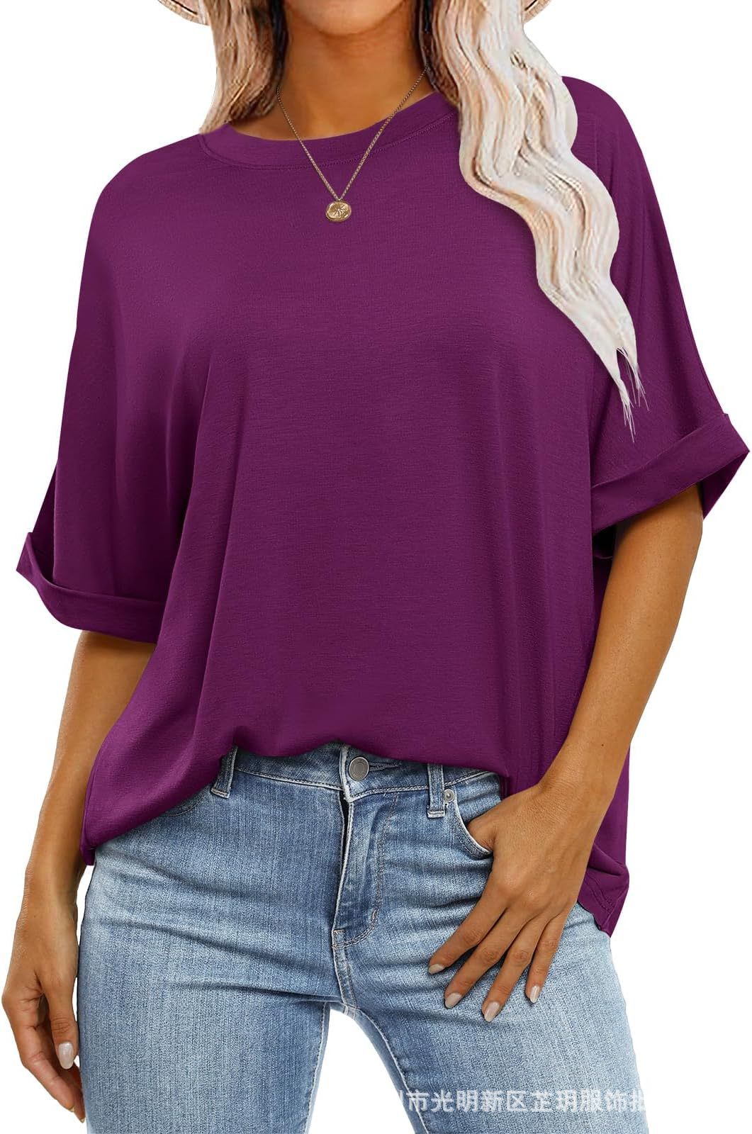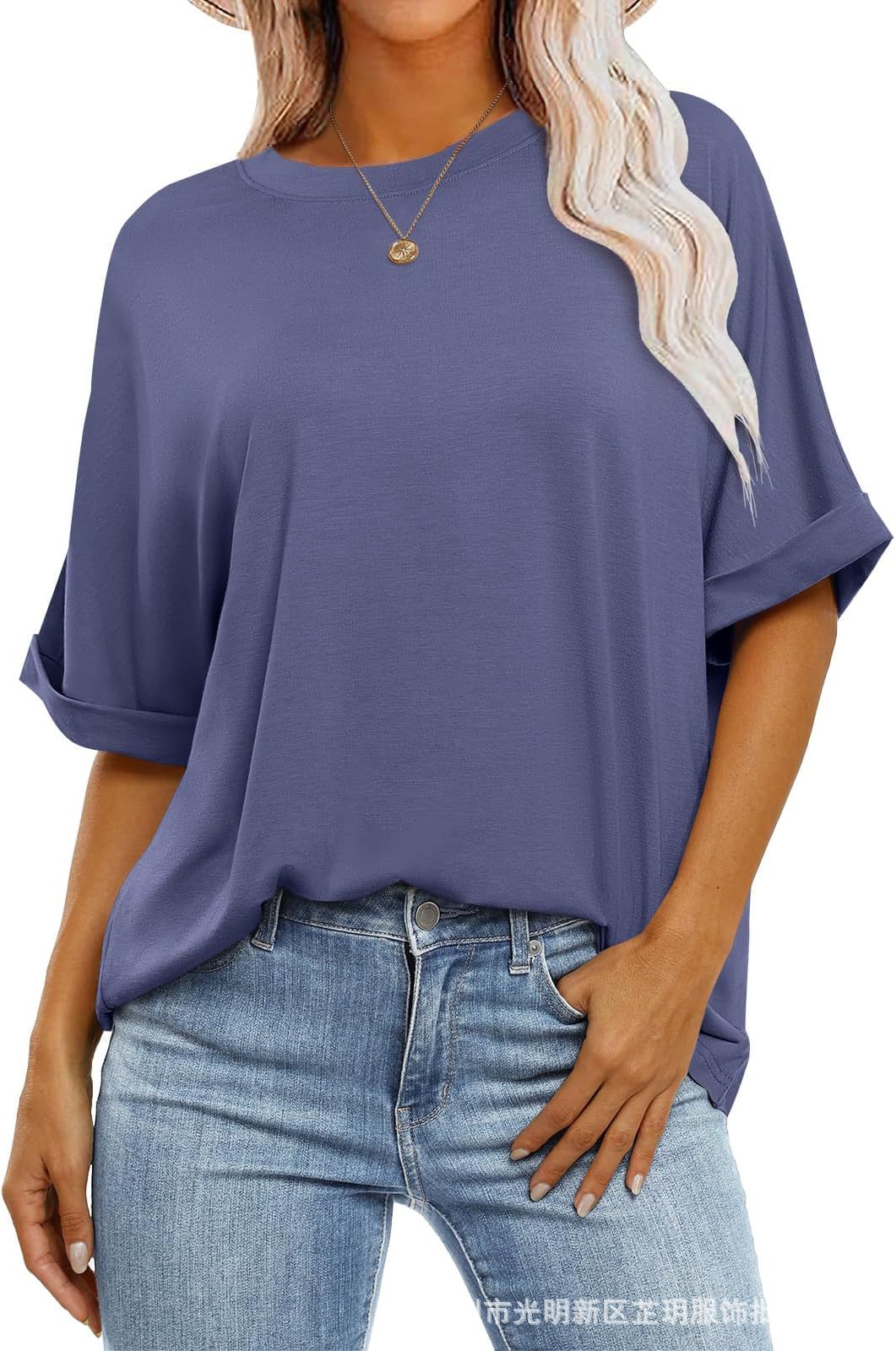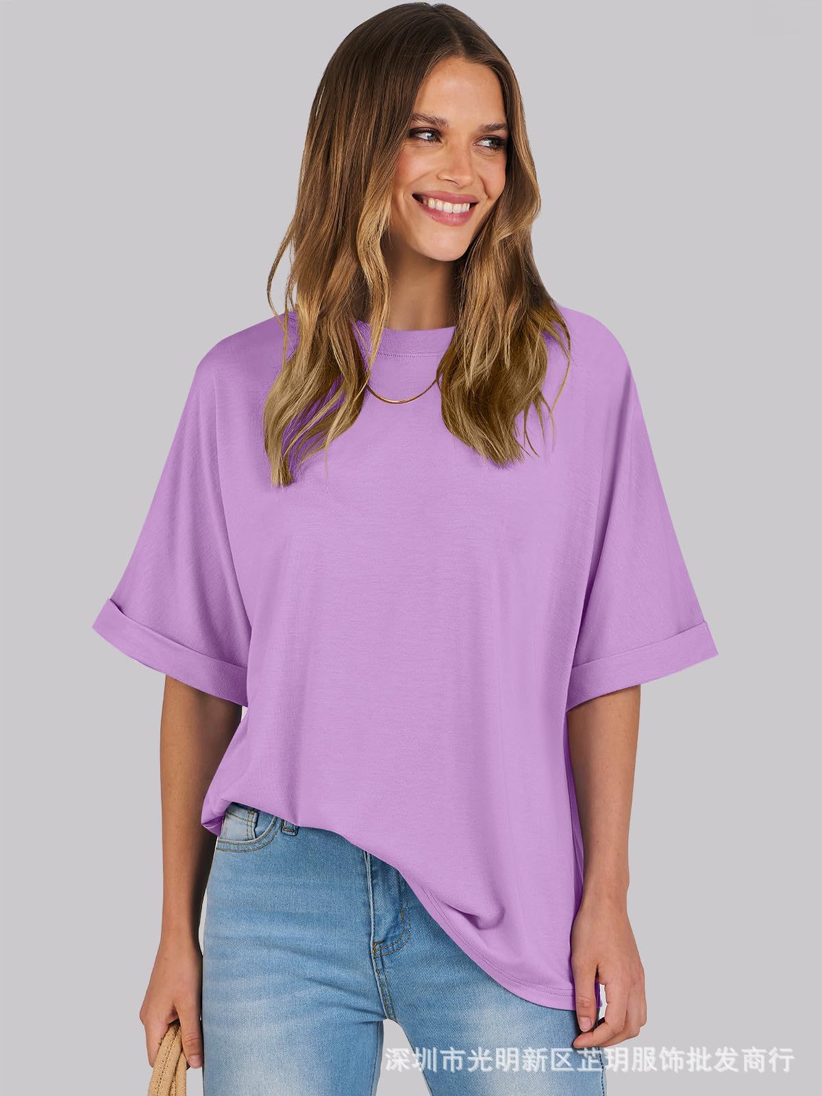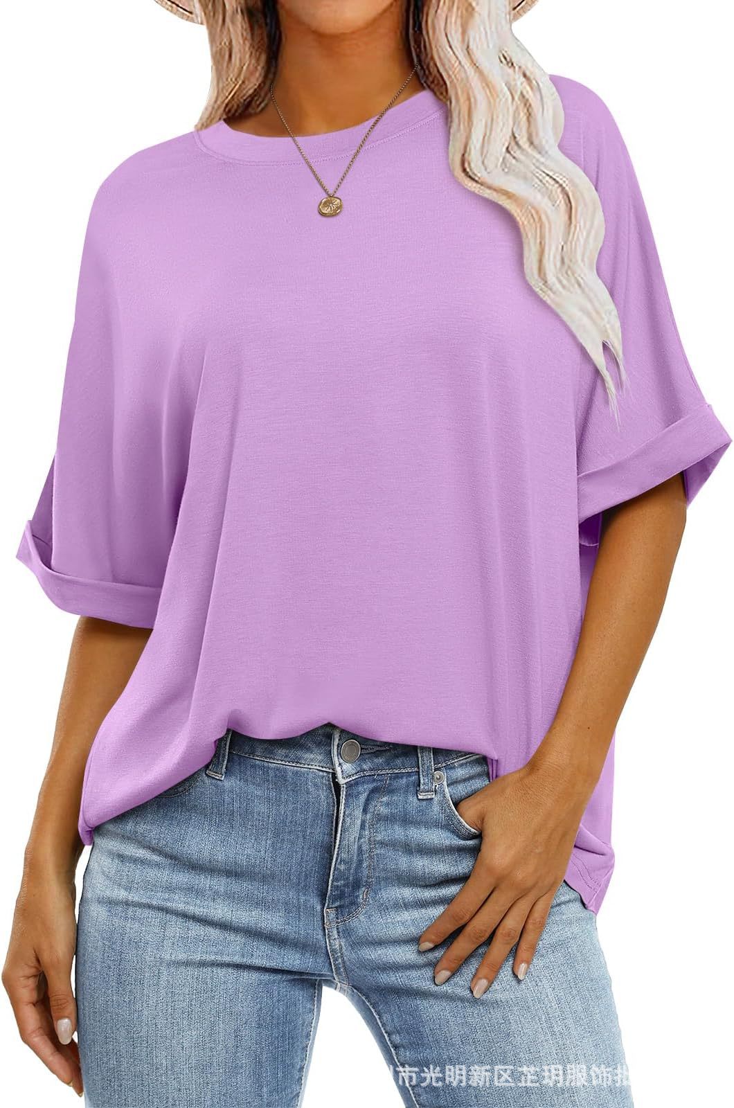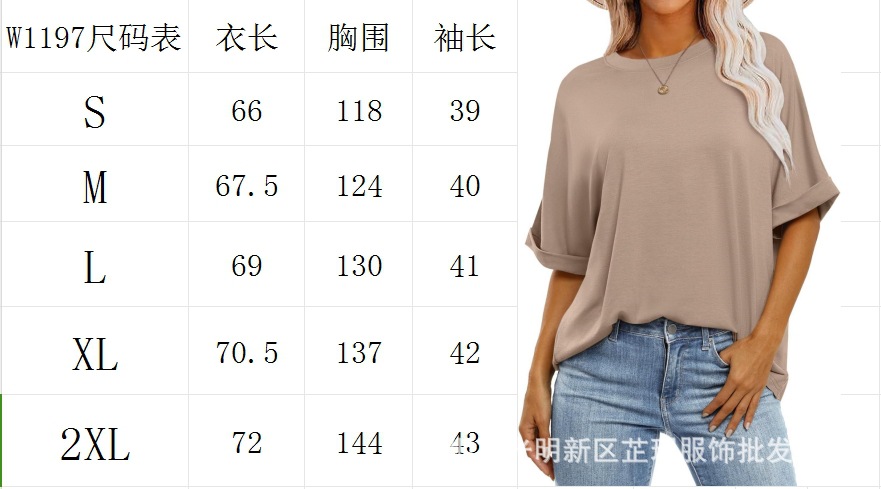 2025 유럽 및 미국 해외 무역 봄 여름 풀오버 단색 라운드넥 루즈핏 반팔 티셔츠 여성용 재고 있음 마카롱스토어 가기