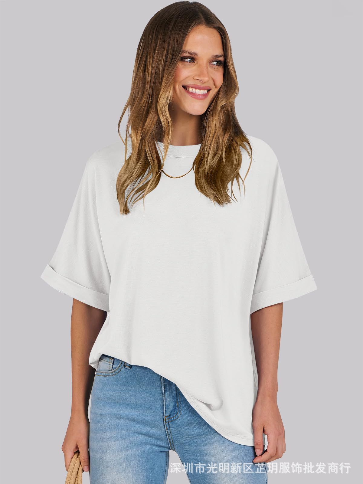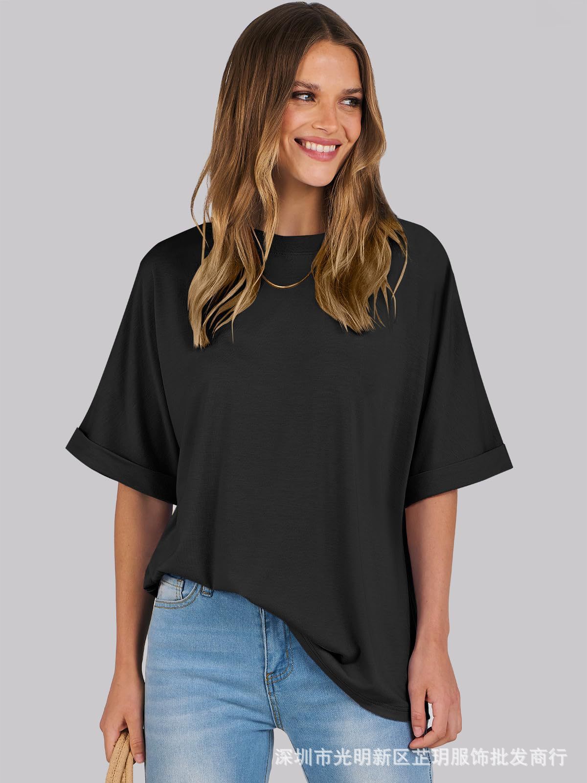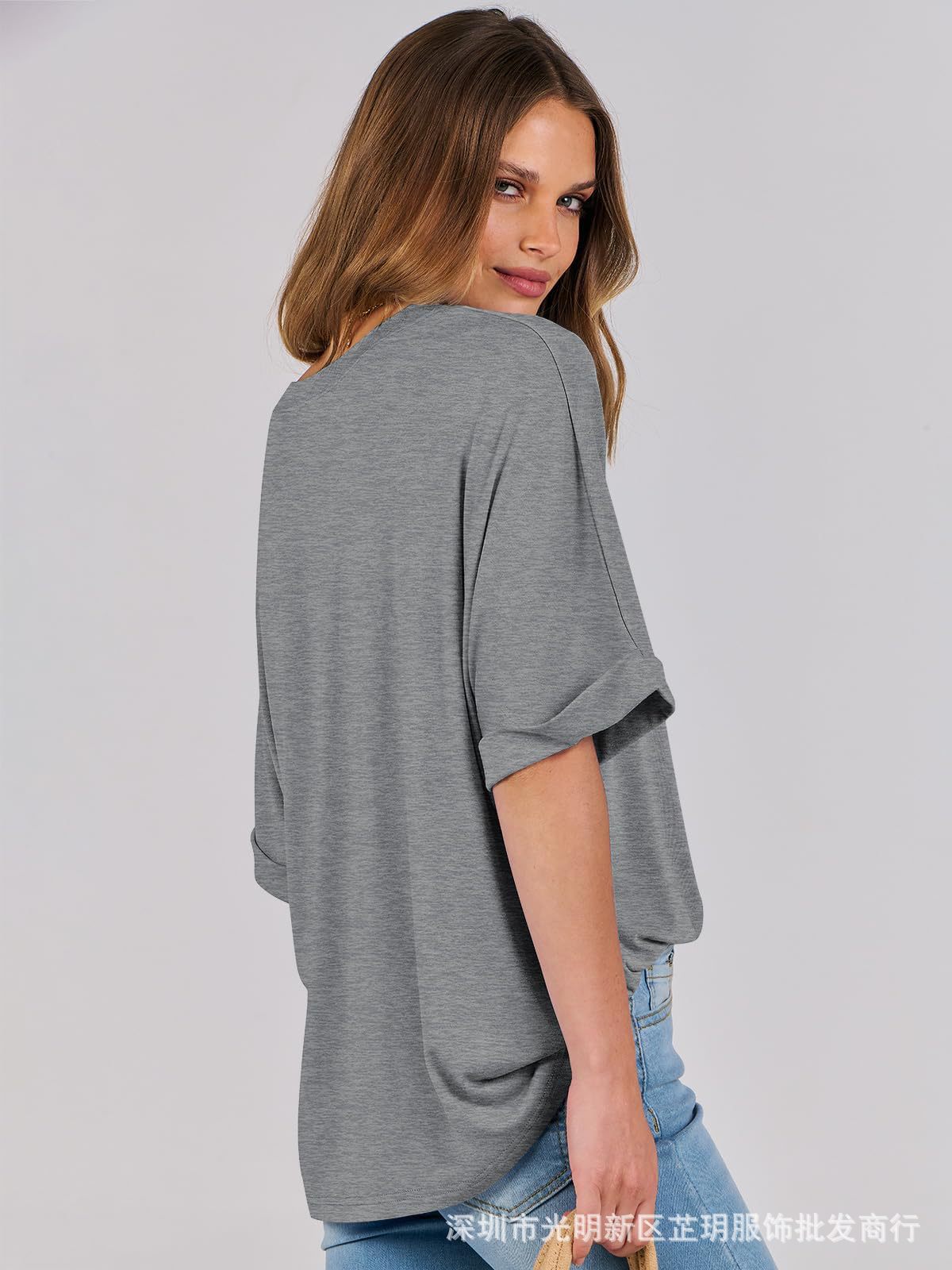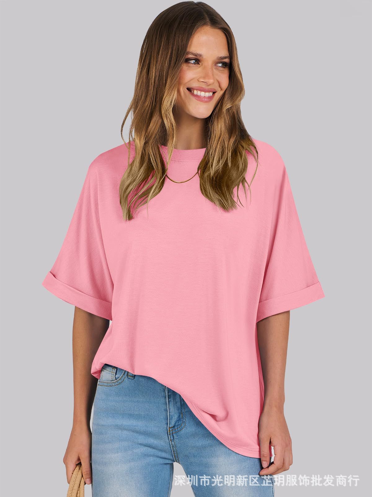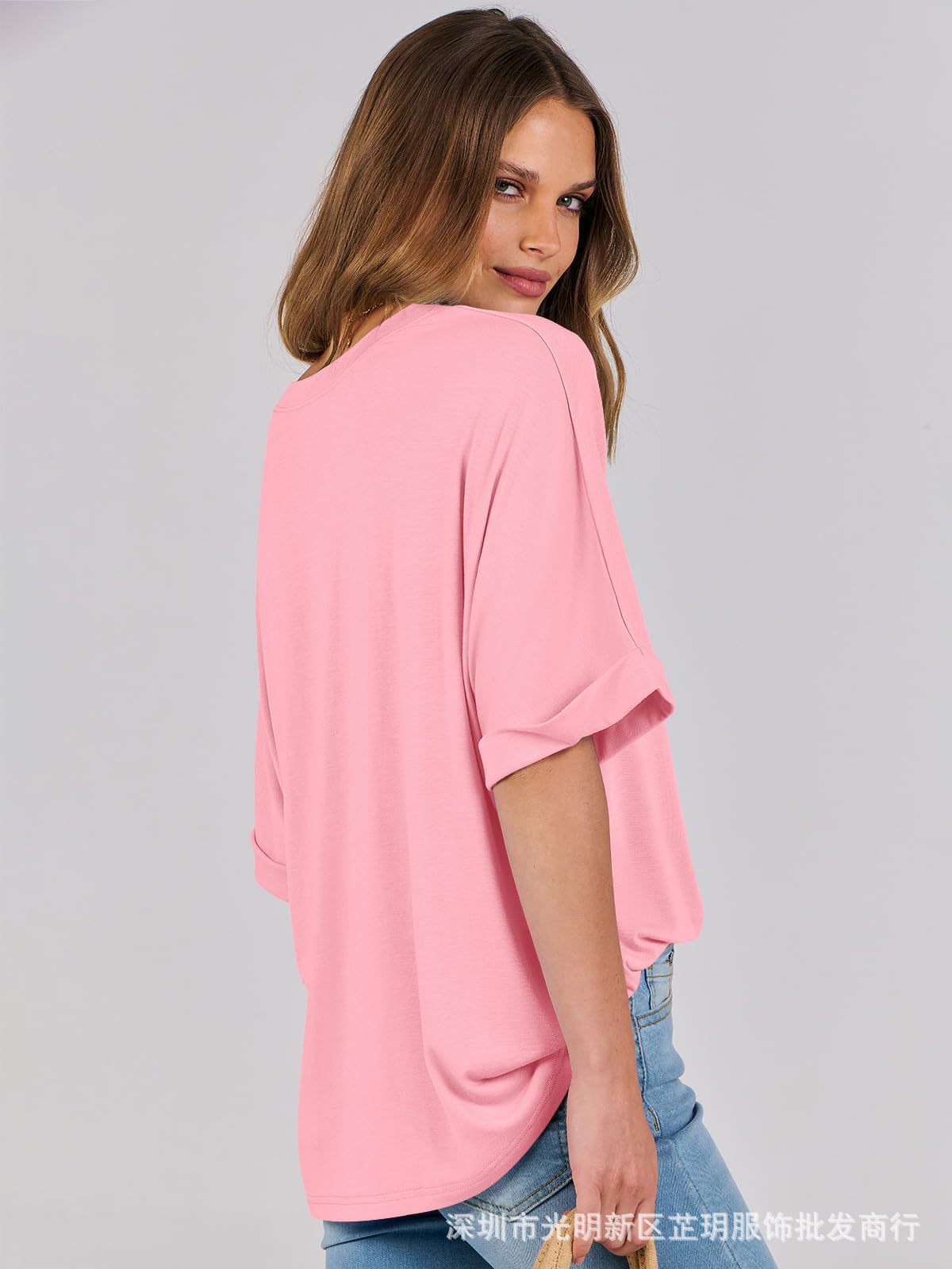 2025 유럽 및 미국 해외 무역 봄 여름 풀오버 단색 라운드넥 루즈핏 반팔 티셔츠 여성용 재고 있음 마카롱스토어 가기