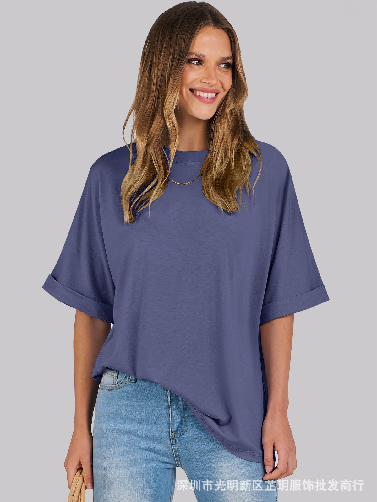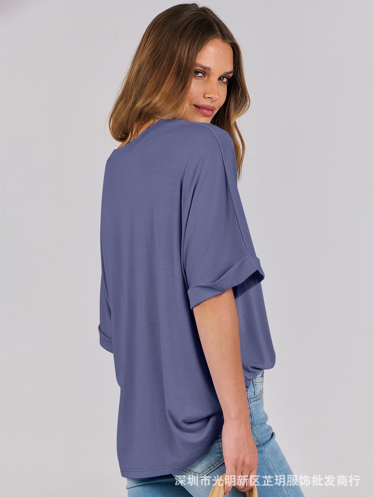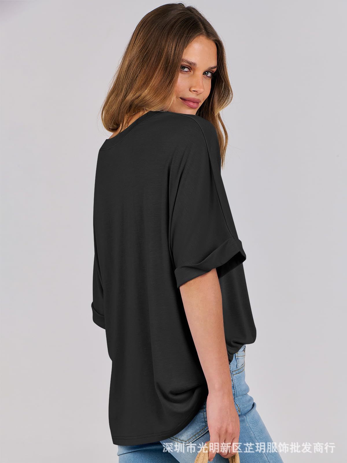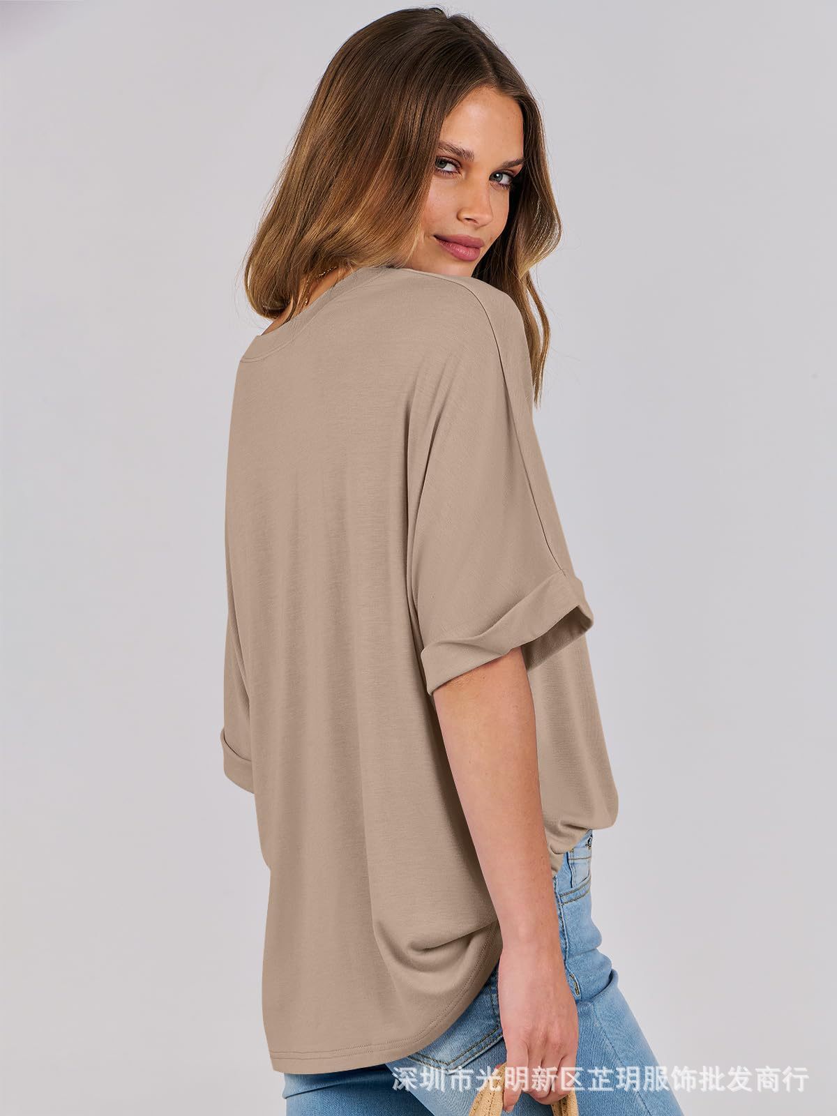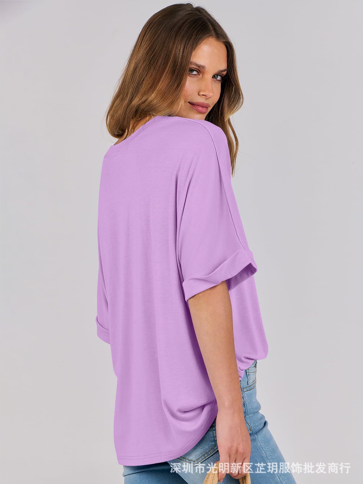 2025 유럽 및 미국 해외 무역 봄 여름 풀오버 단색 라운드넥 루즈핏 반팔 티셔츠 여성용 재고 있음 마카롱스토어 가기