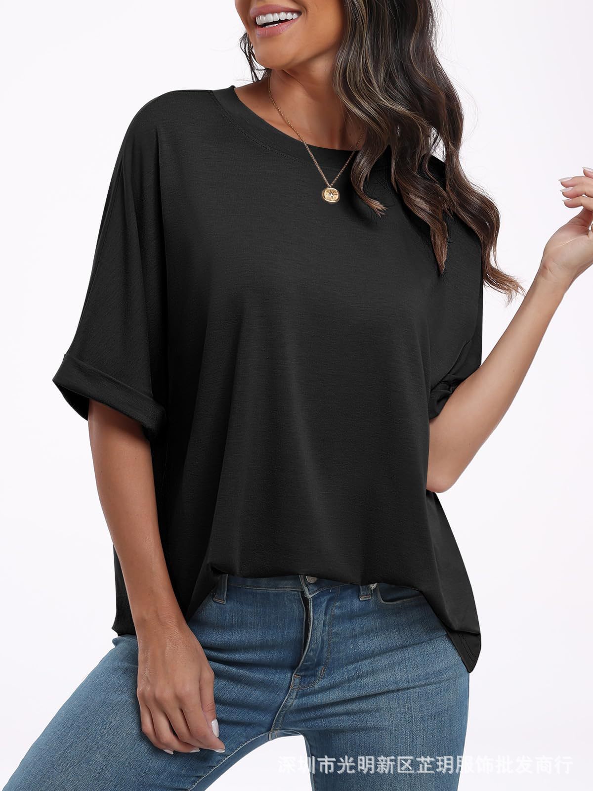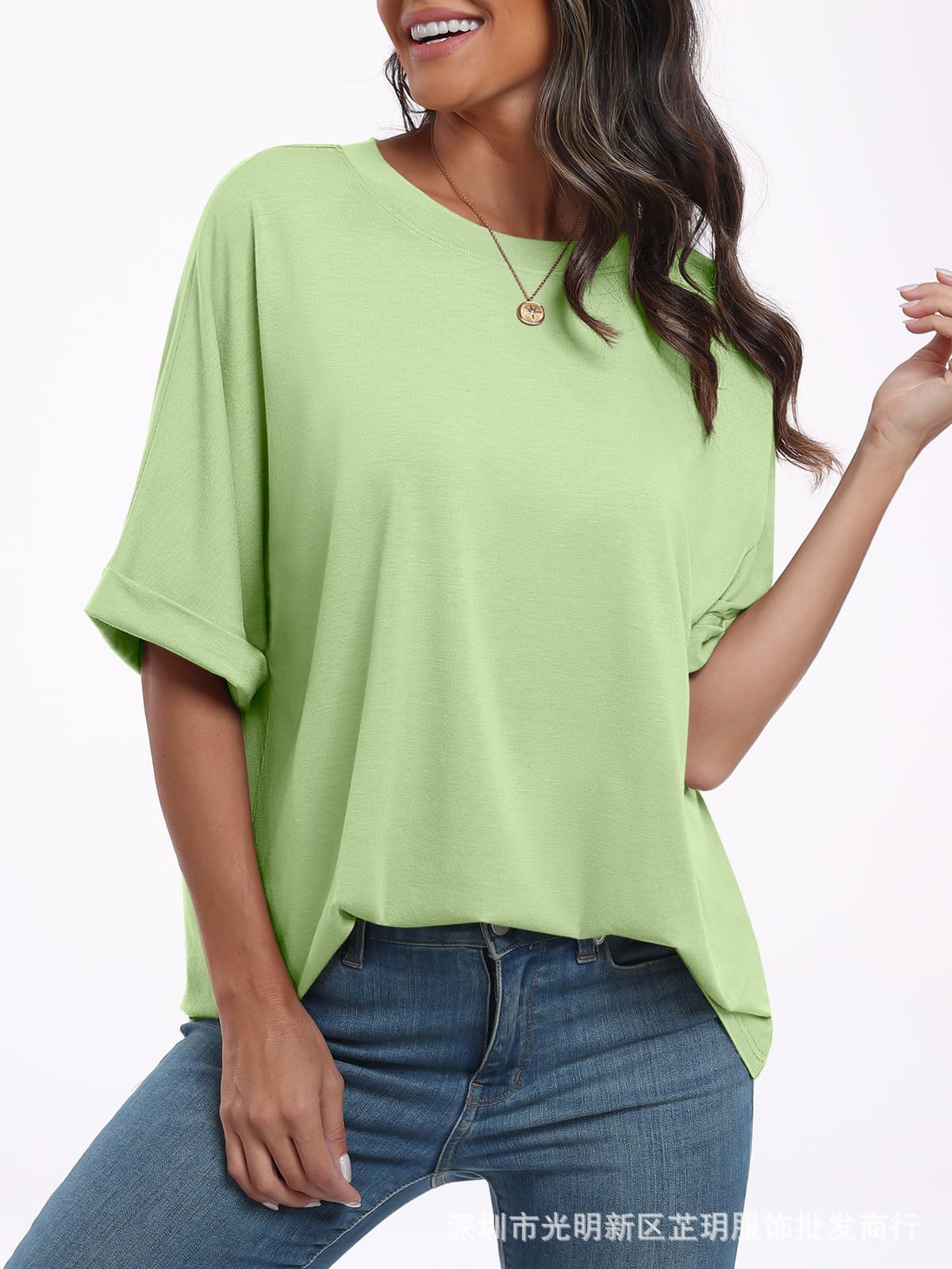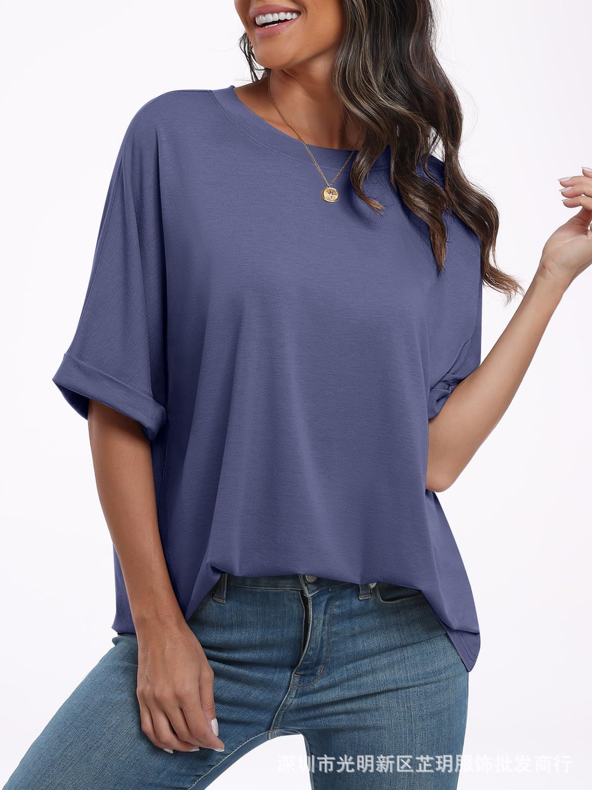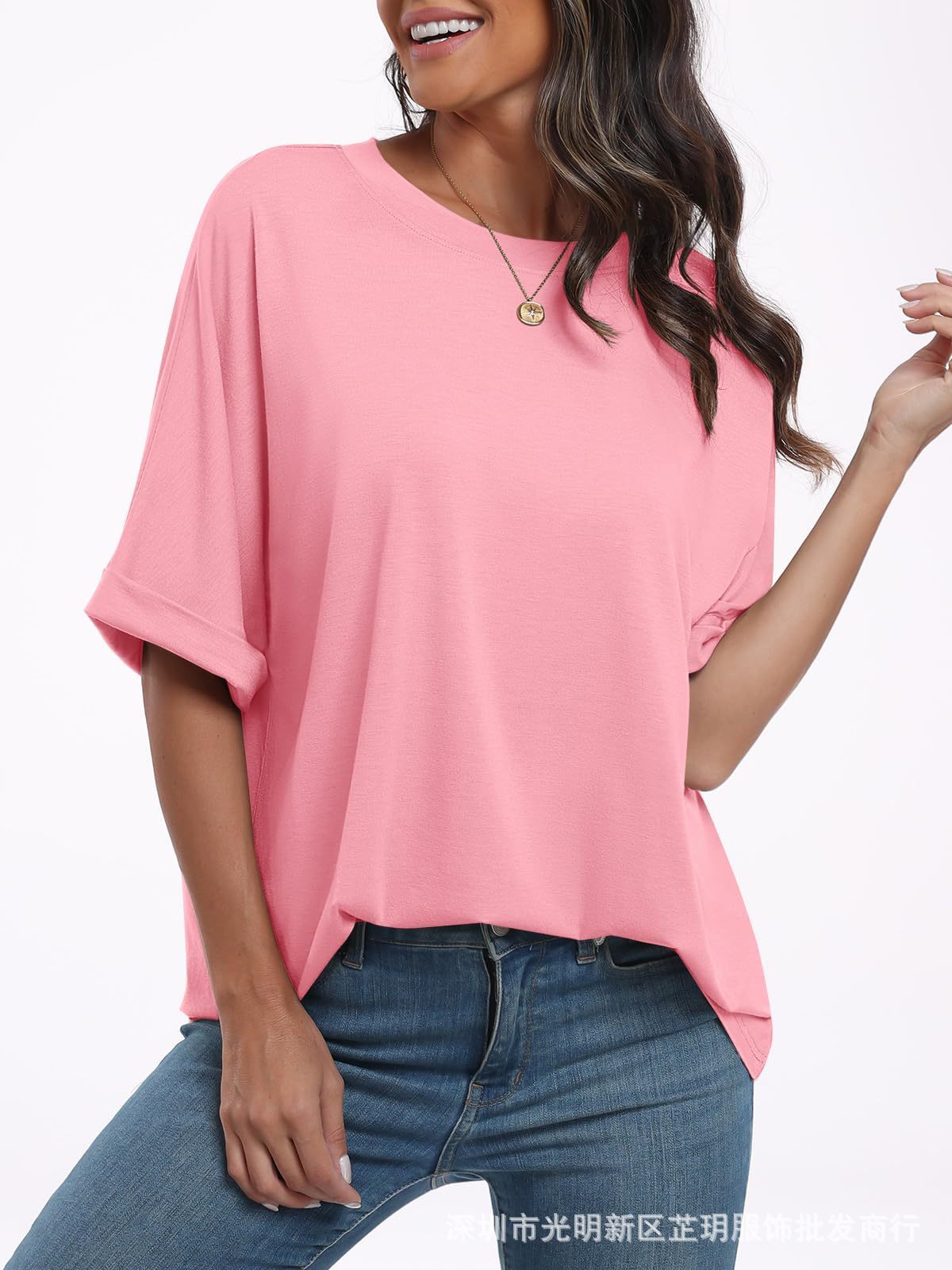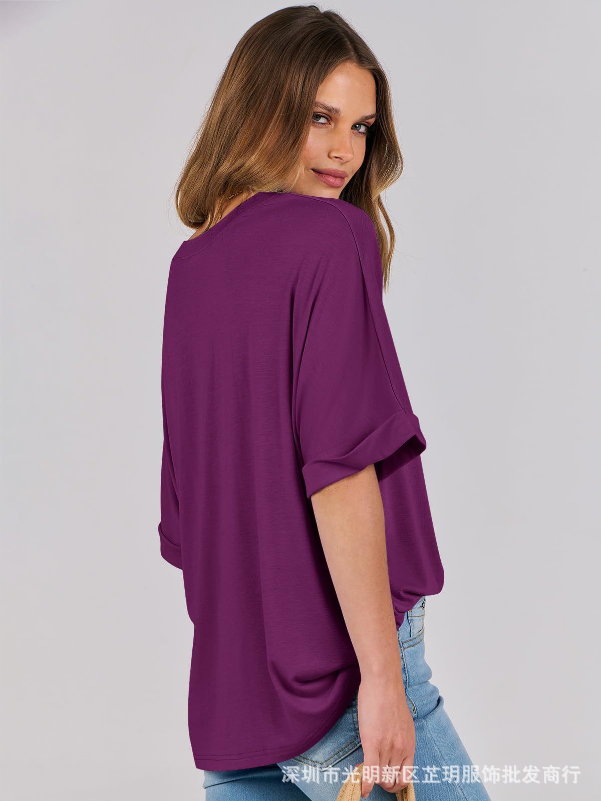 2025 유럽 및 미국 해외 무역 봄 여름 풀오버 단색 라운드넥 루즈핏 반팔 티셔츠 여성용 재고 있음 마카롱스토어 가기