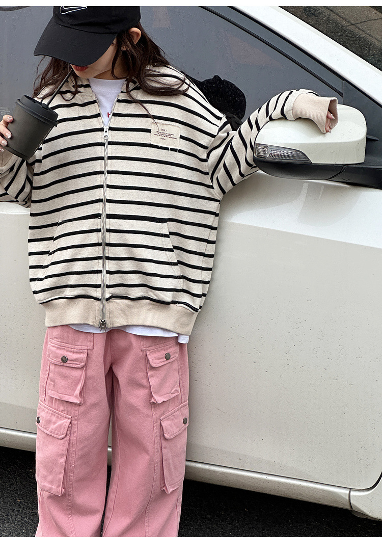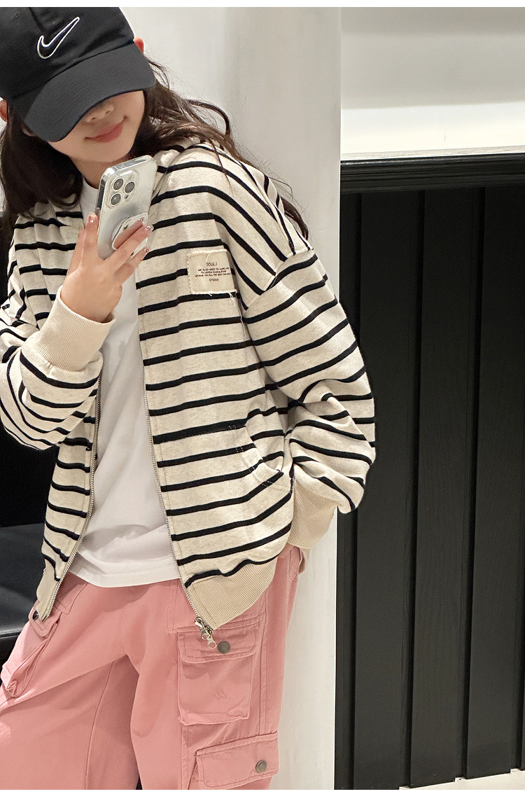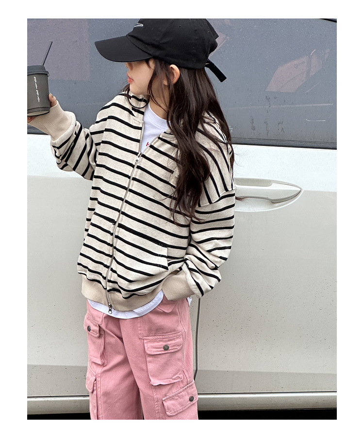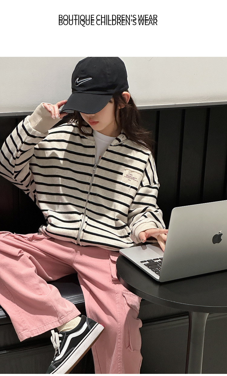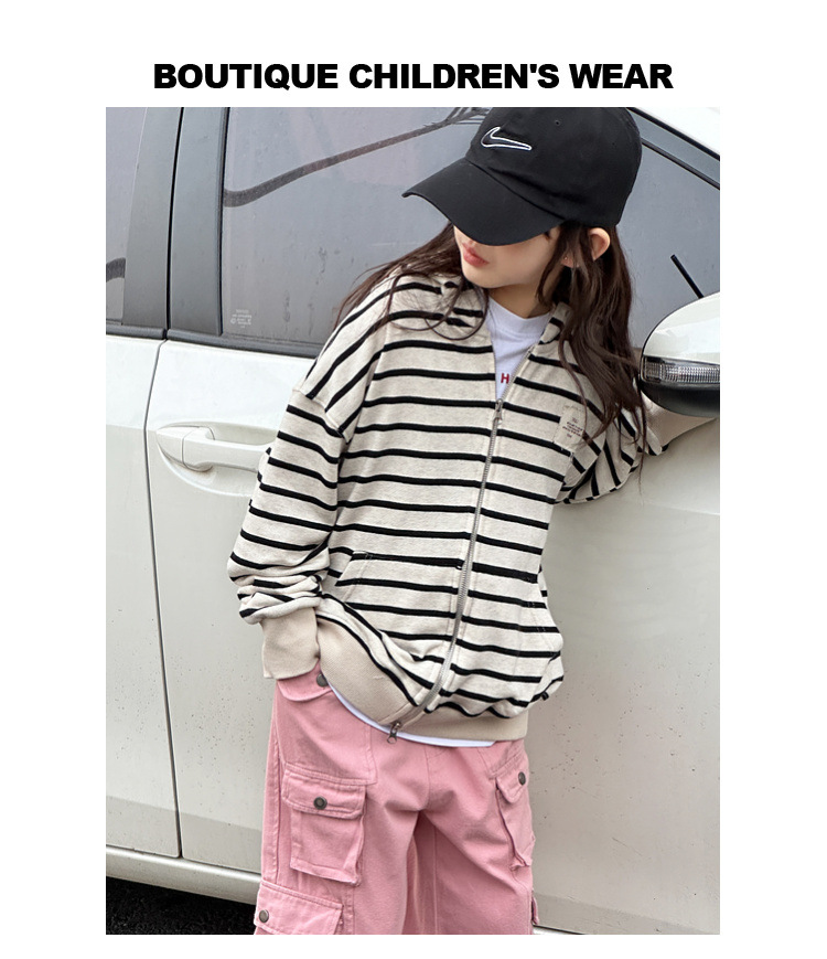 【반품, 교환 불가】여아용 아동용 트렌디하고 스타일리쉬한 가디건, 봄, 가을용 후드 스트라이프 상의스토어 가기