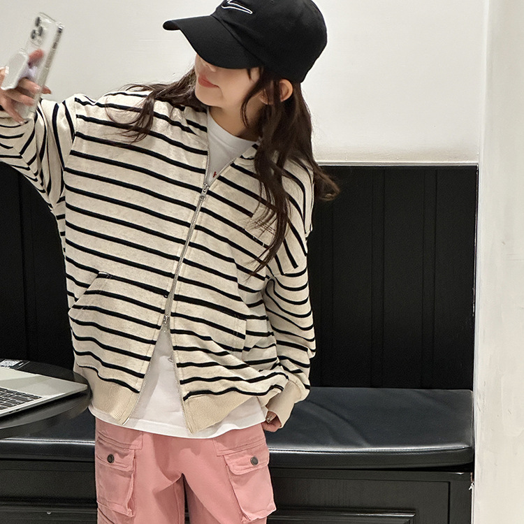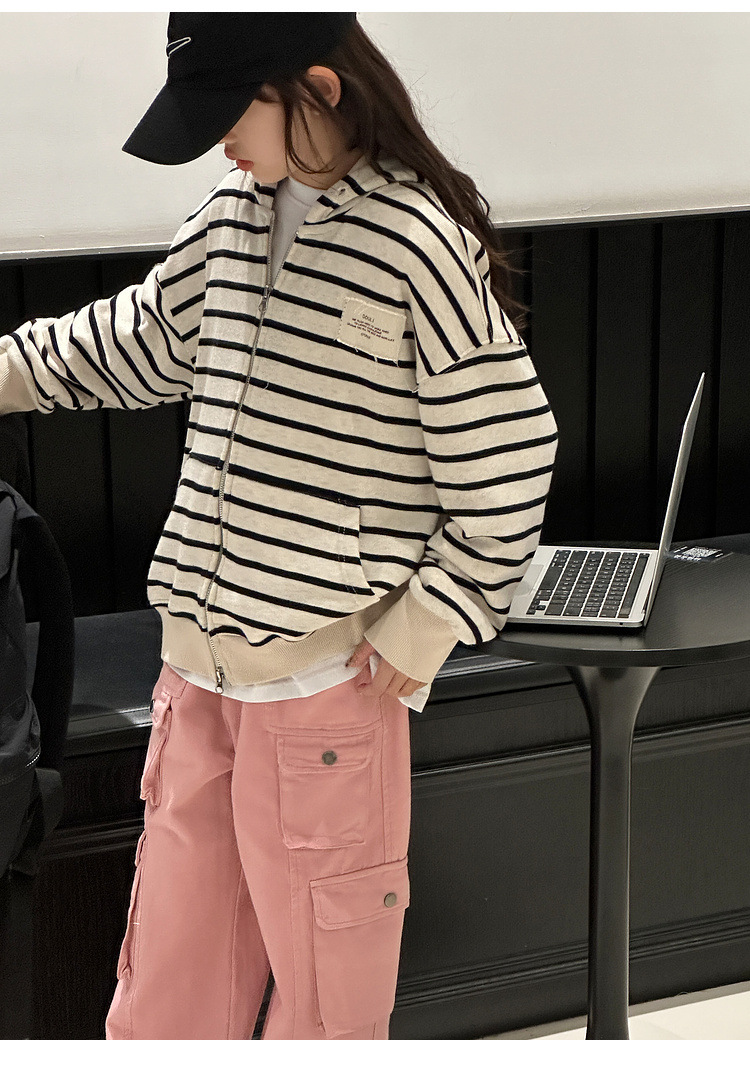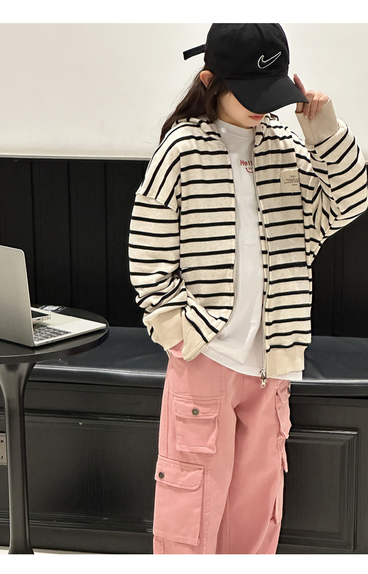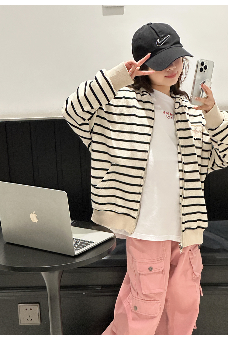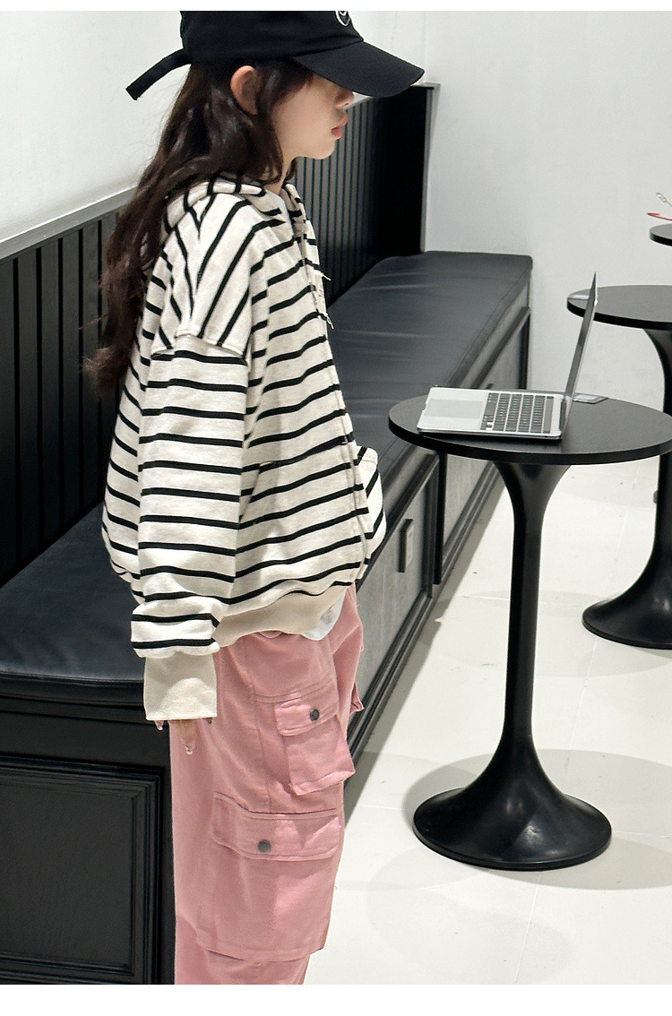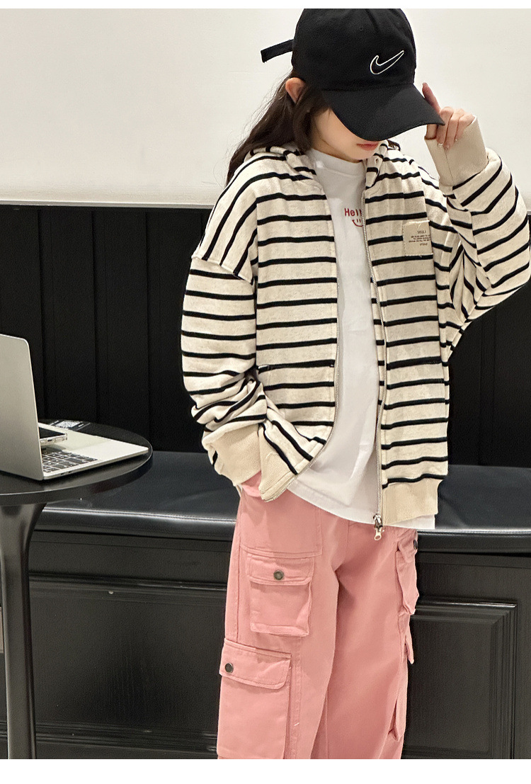 【반품, 교환 불가】여아용 아동용 트렌디하고 스타일리쉬한 가디건, 봄, 가을용 후드 스트라이프 상의스토어 가기