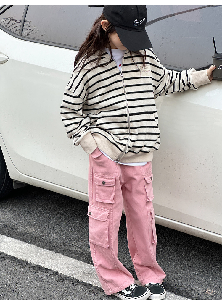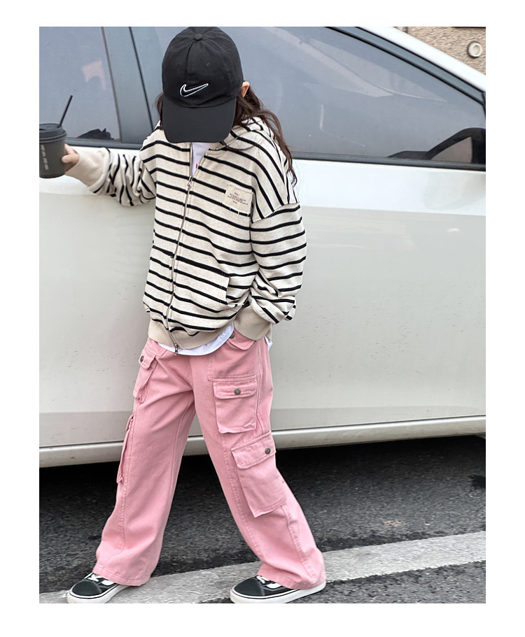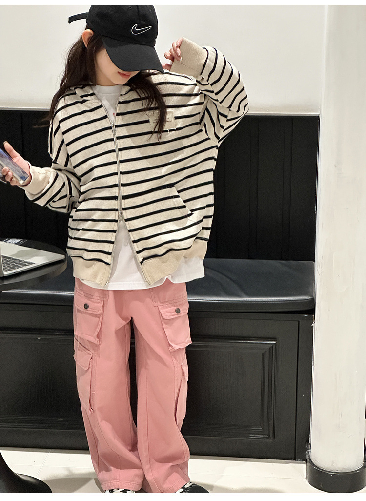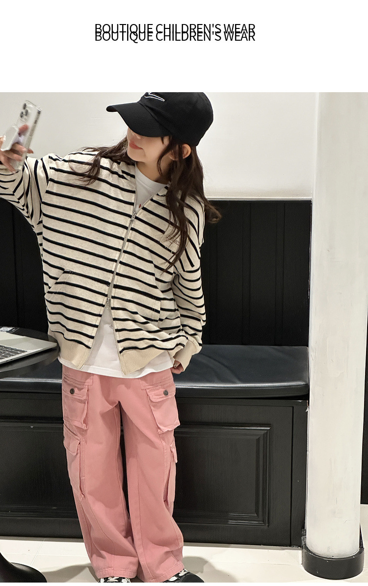 【반품, 교환 불가】여아용 아동용 트렌디하고 스타일리쉬한 가디건, 봄, 가을용 후드 스트라이프 상의